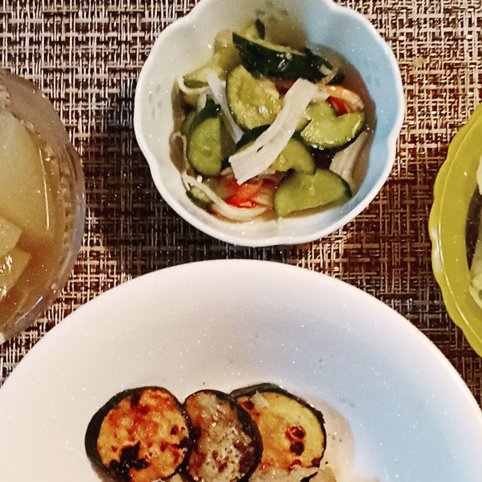 豆腐ハンバーグ、ズッキーニ サラダ 大根と厚揚げ煮物 キュウリ、カニかま酢の物 ご飯 味噌汁