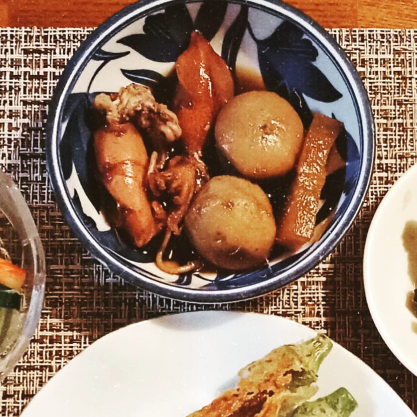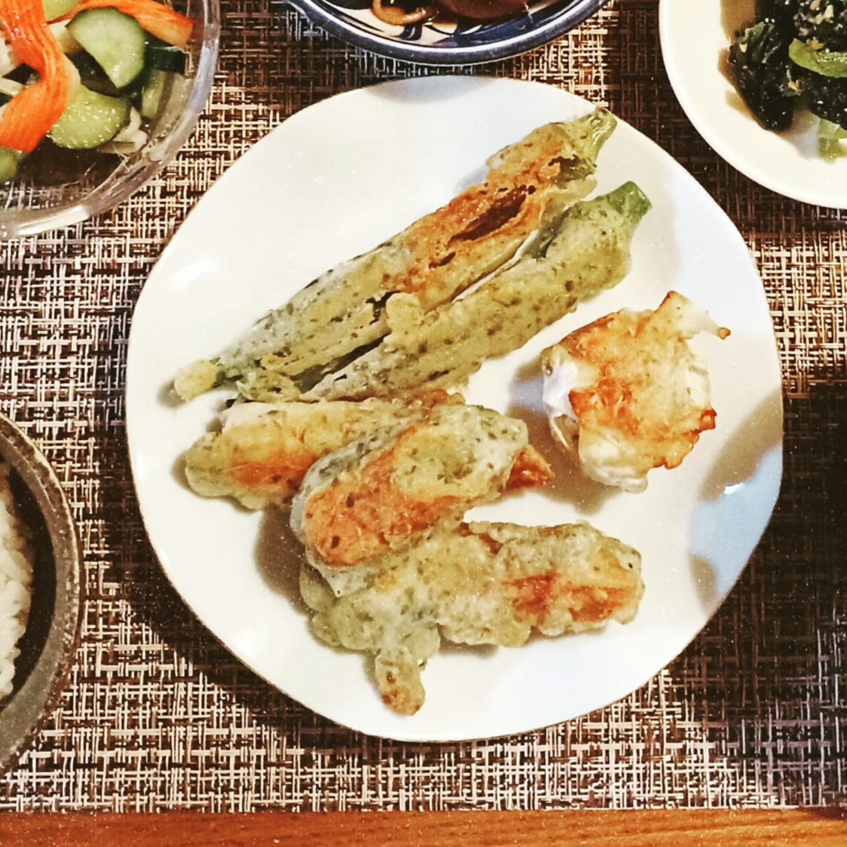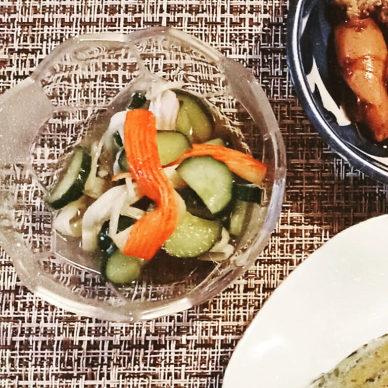 竹輪とおくらの磯辺揚げ ヒイカと小芋の煮物 キュウリとカニかま酢の物 小松菜ごま和え ご飯 味噌汁