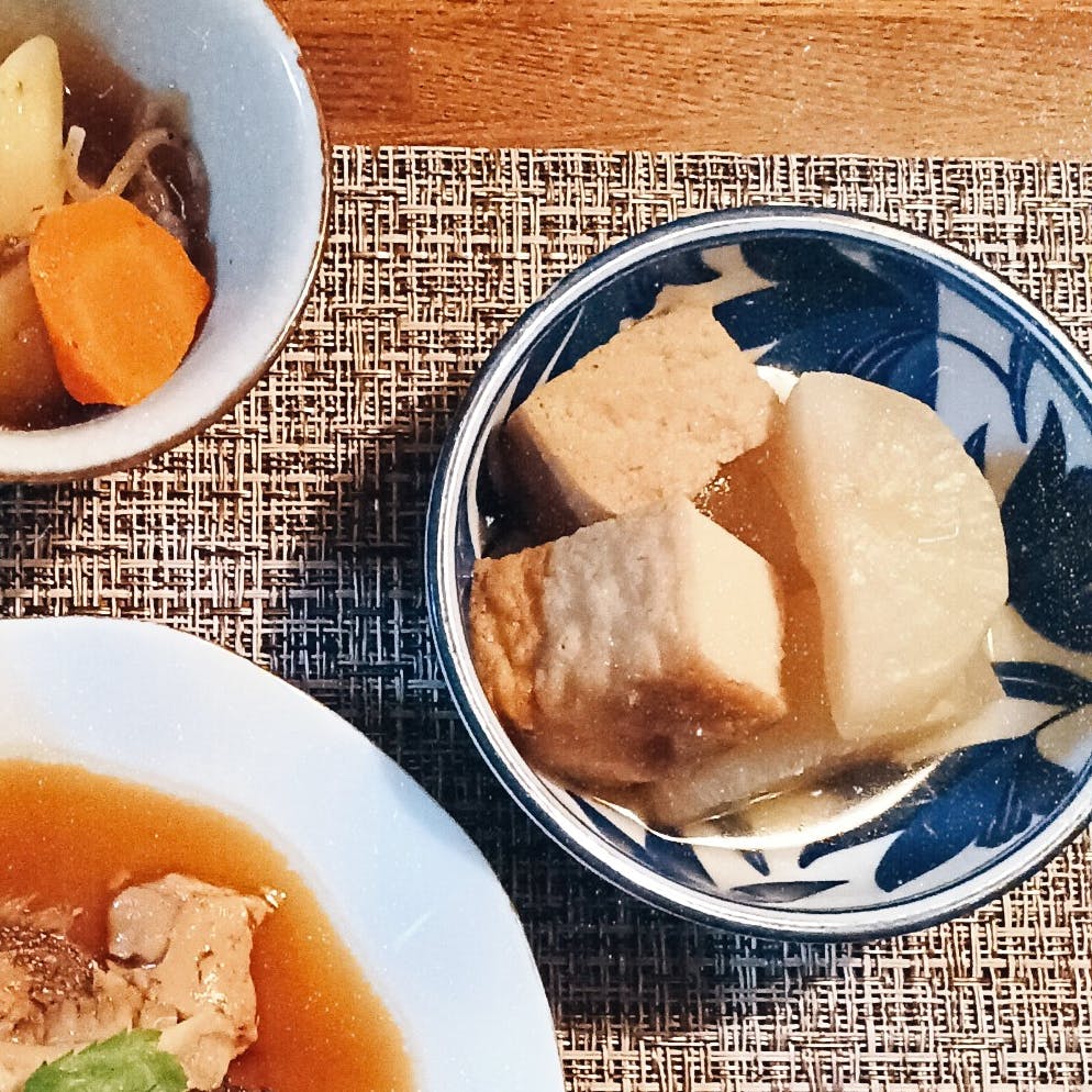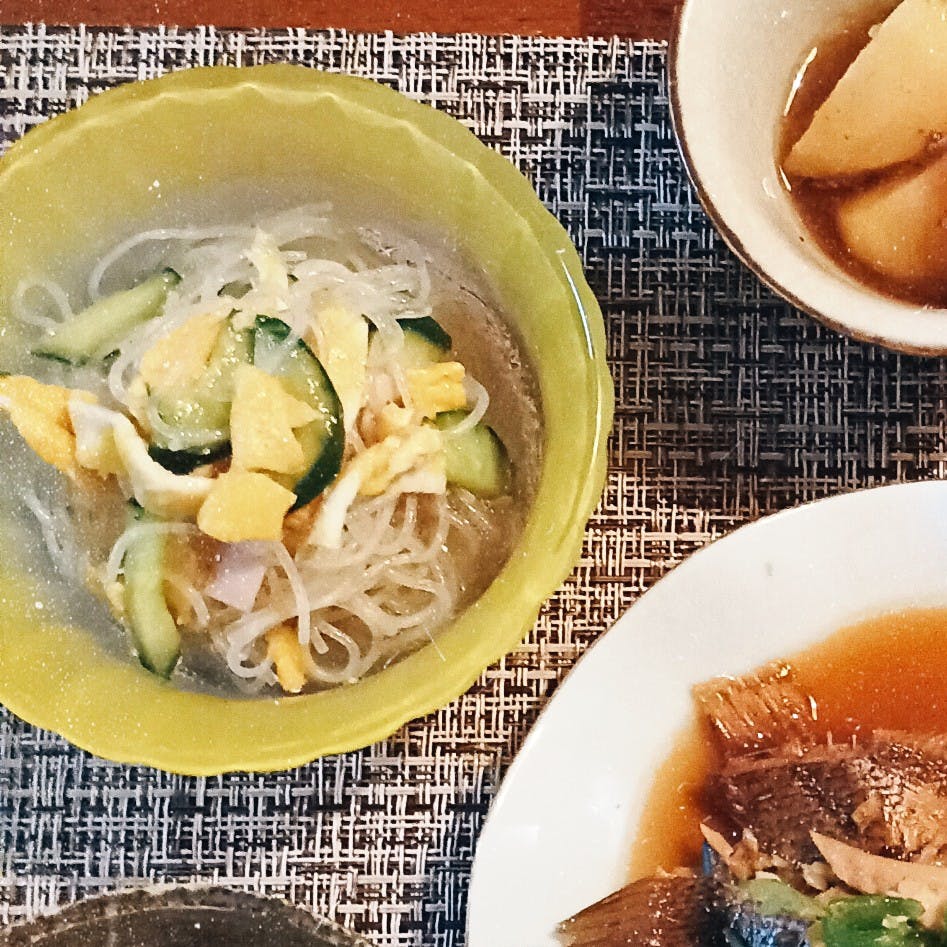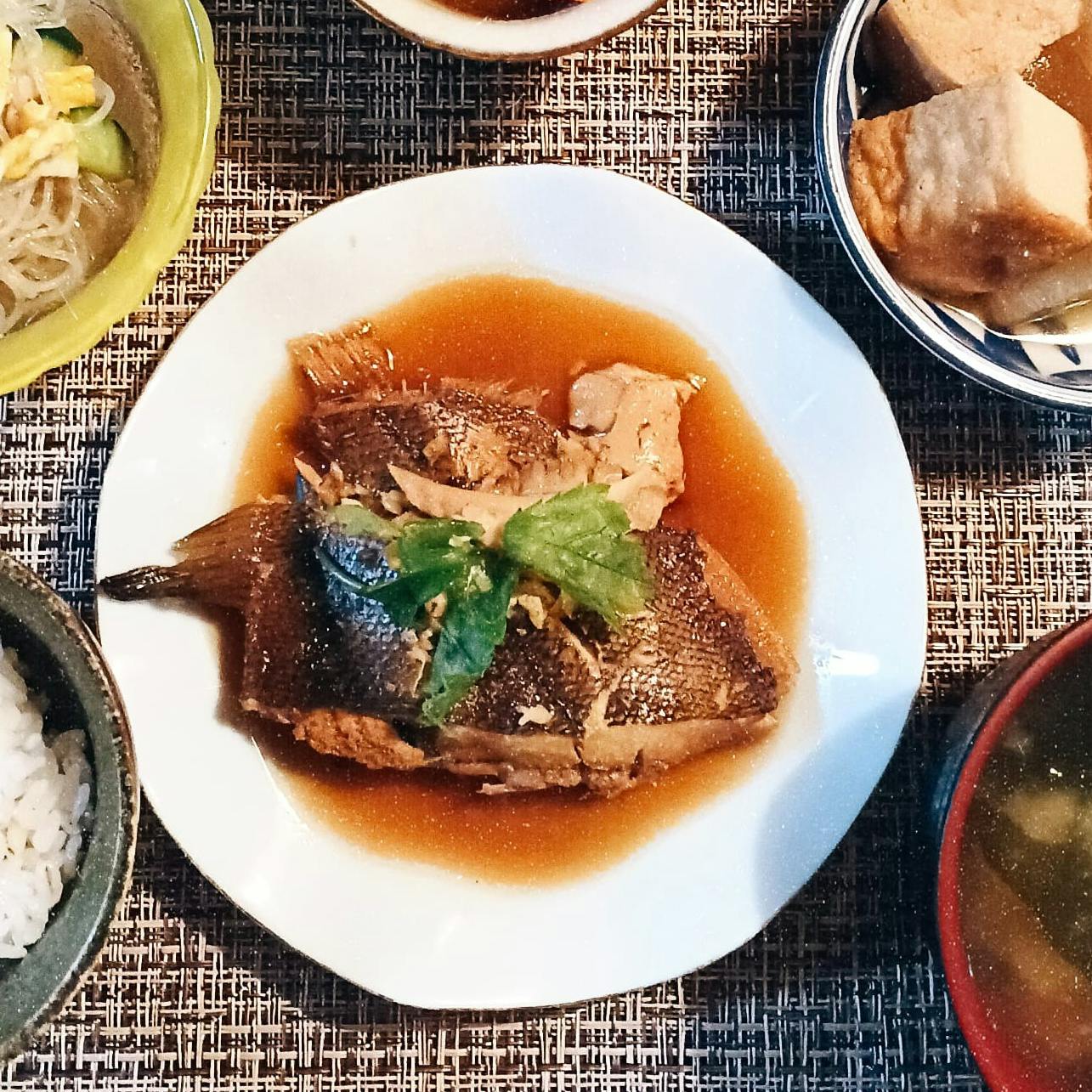 カレイの煮付け 春雨マヨサラダ じゃがいもと人参煮物 大根と厚揚げ煮物 ご飯 味噌汁