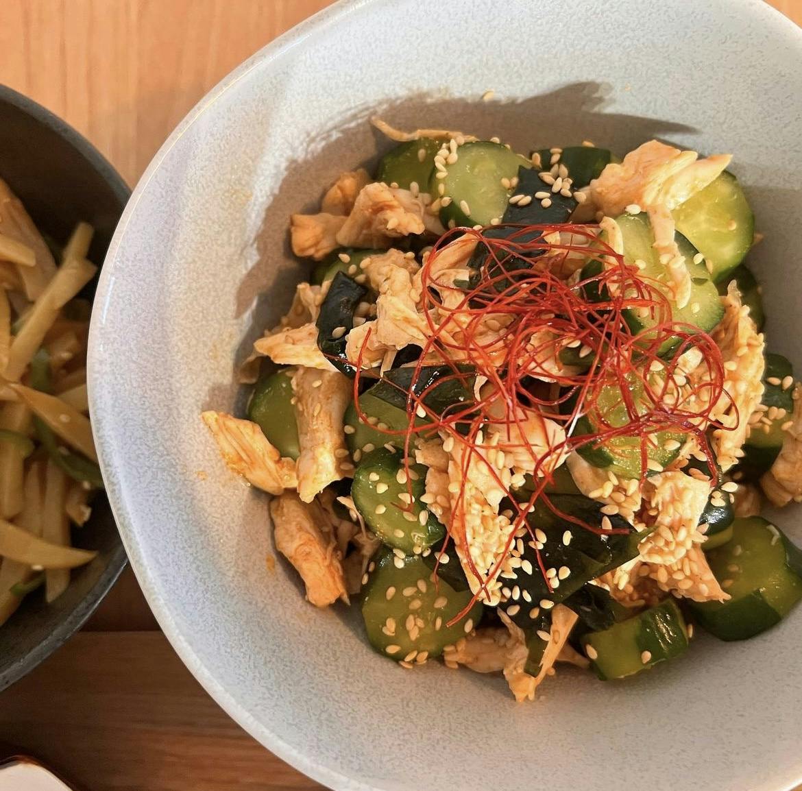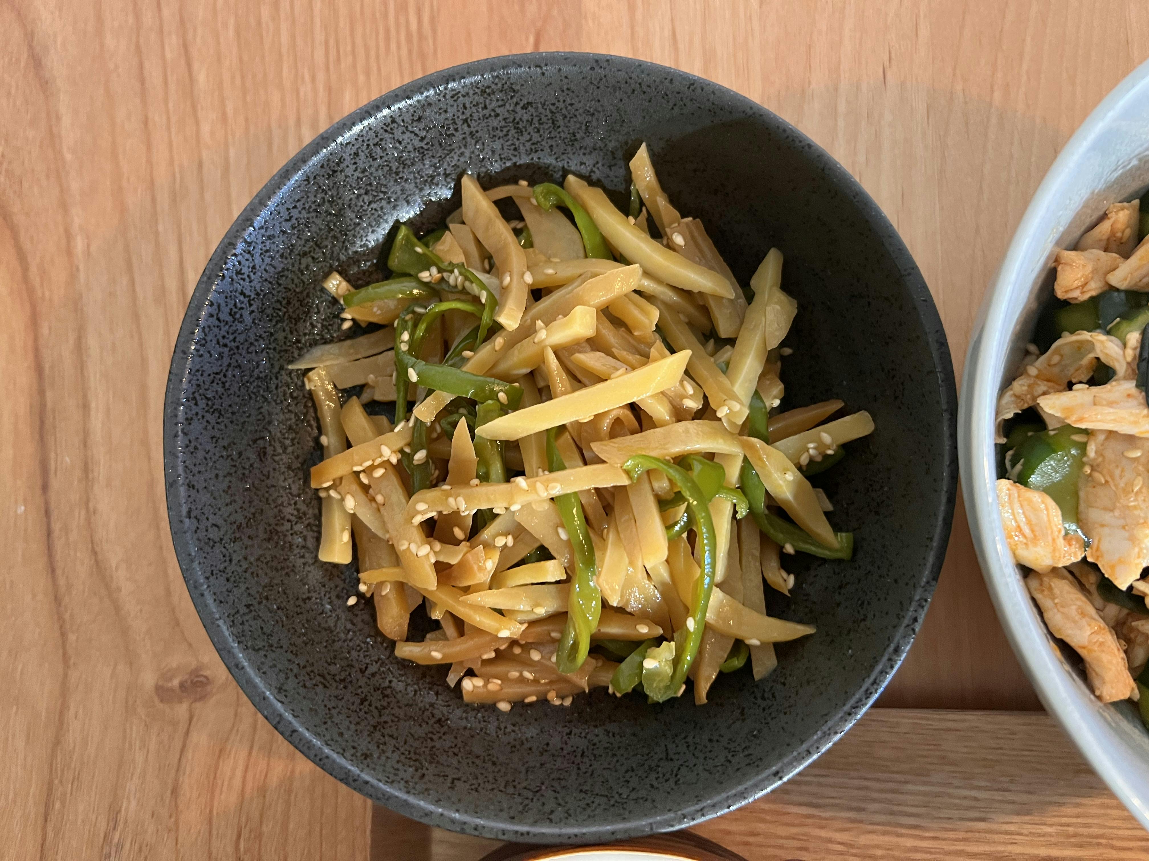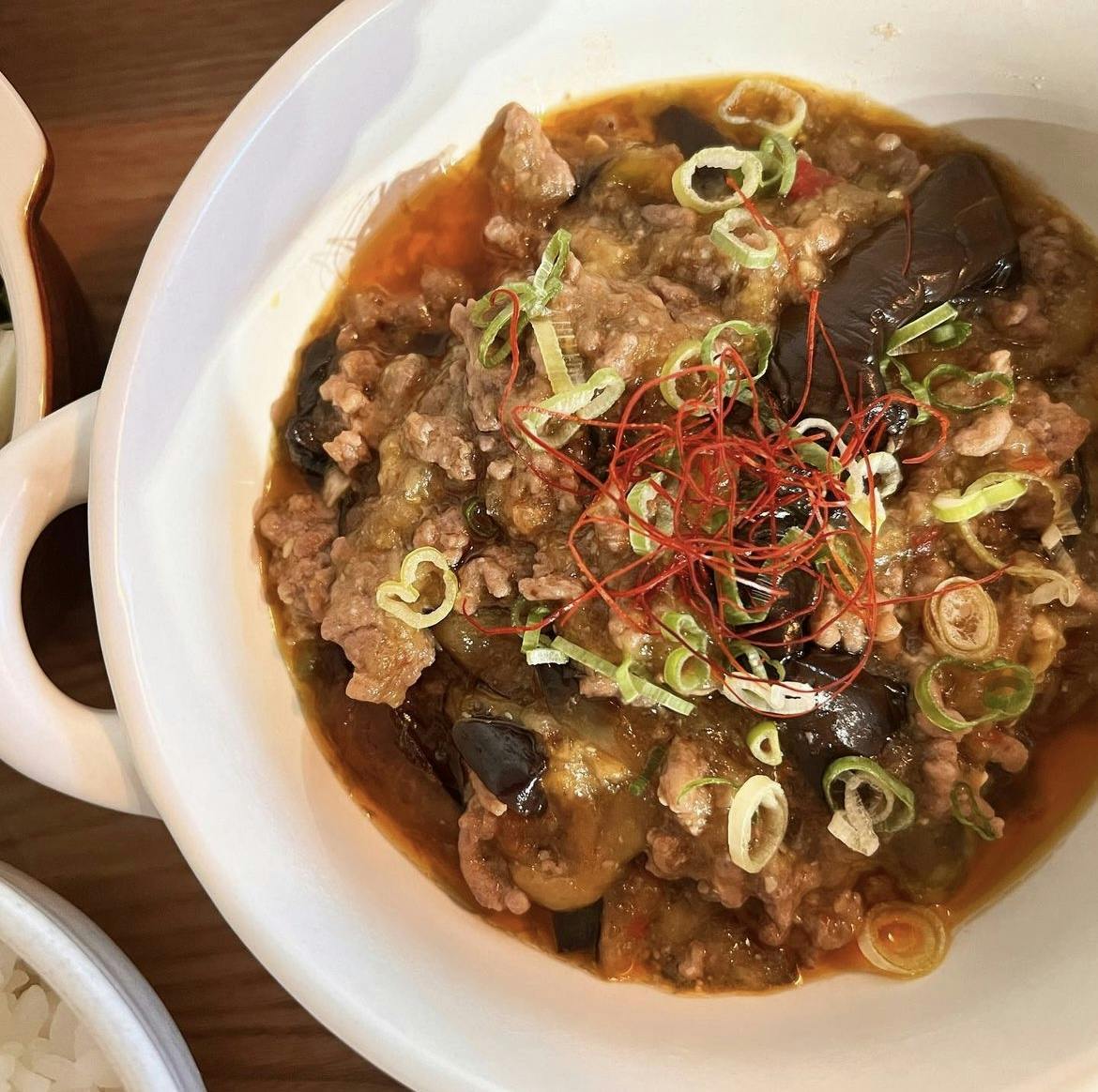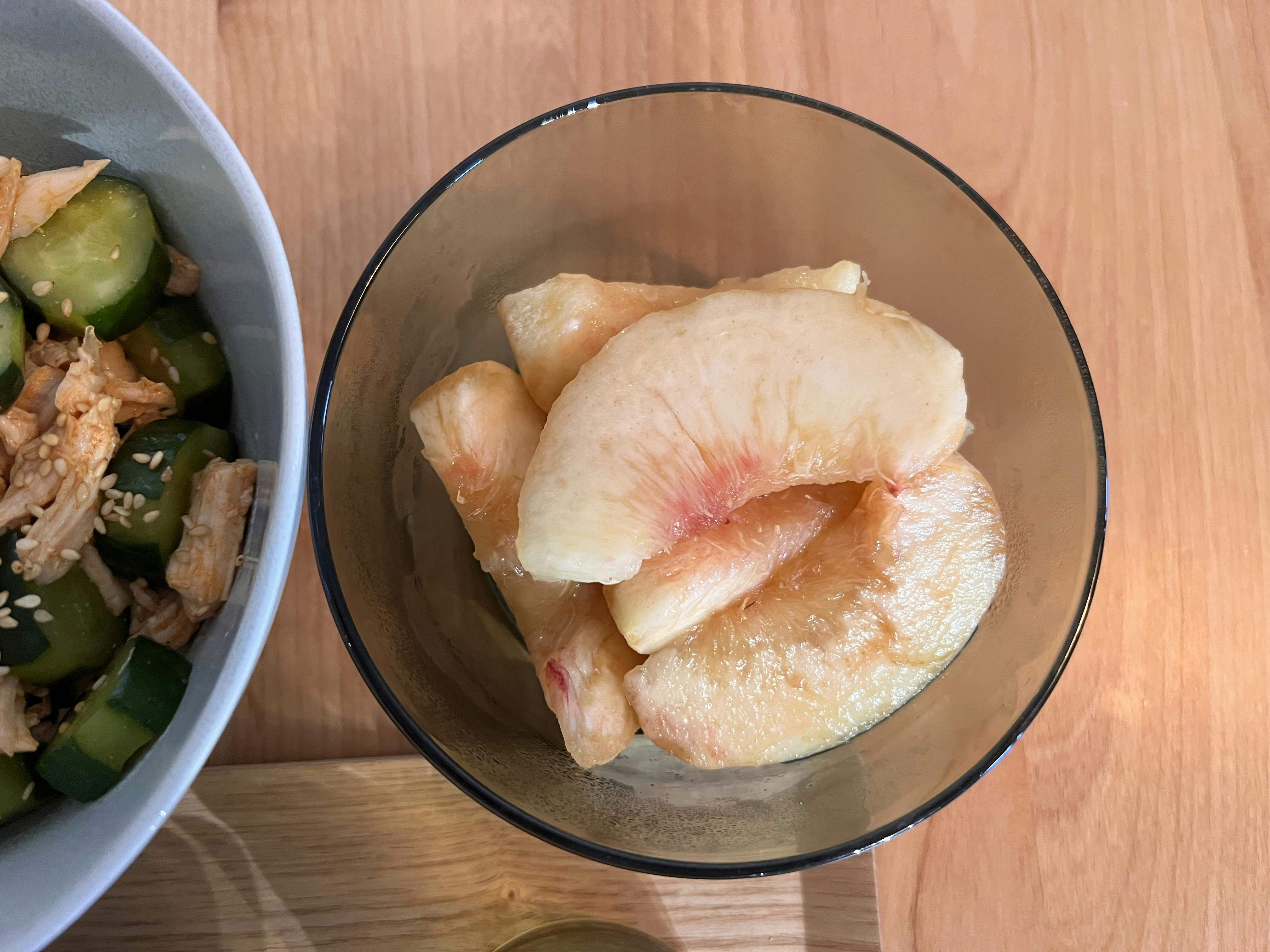 🍆🧆🇨🇳 𖧵麻婆茄子 𖧵コーンたまごスープ 𖧵生ハムモッツァとスプラウトのサラダ 𖧵ささみときゅうりの韓国風ナムル 𖧵じゃがいもとピーマンのきんぴら 𖧵桃 :