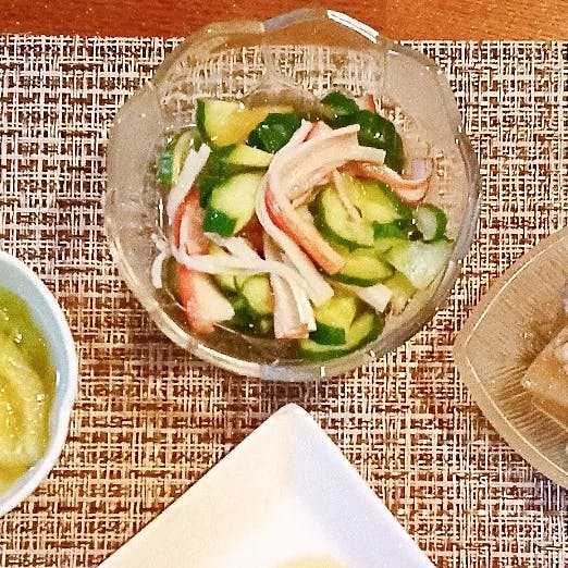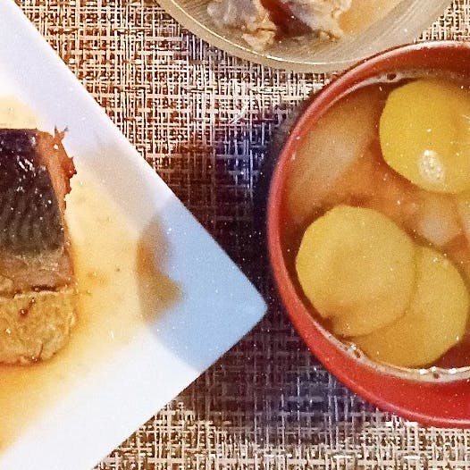 サバの煮付け きゅうりとカニかま酢の物 茄子のお浸し 大根と豚肉味噌炒め煮 ズッキーニと玉ねぎのお味噌汁、発芽玄米