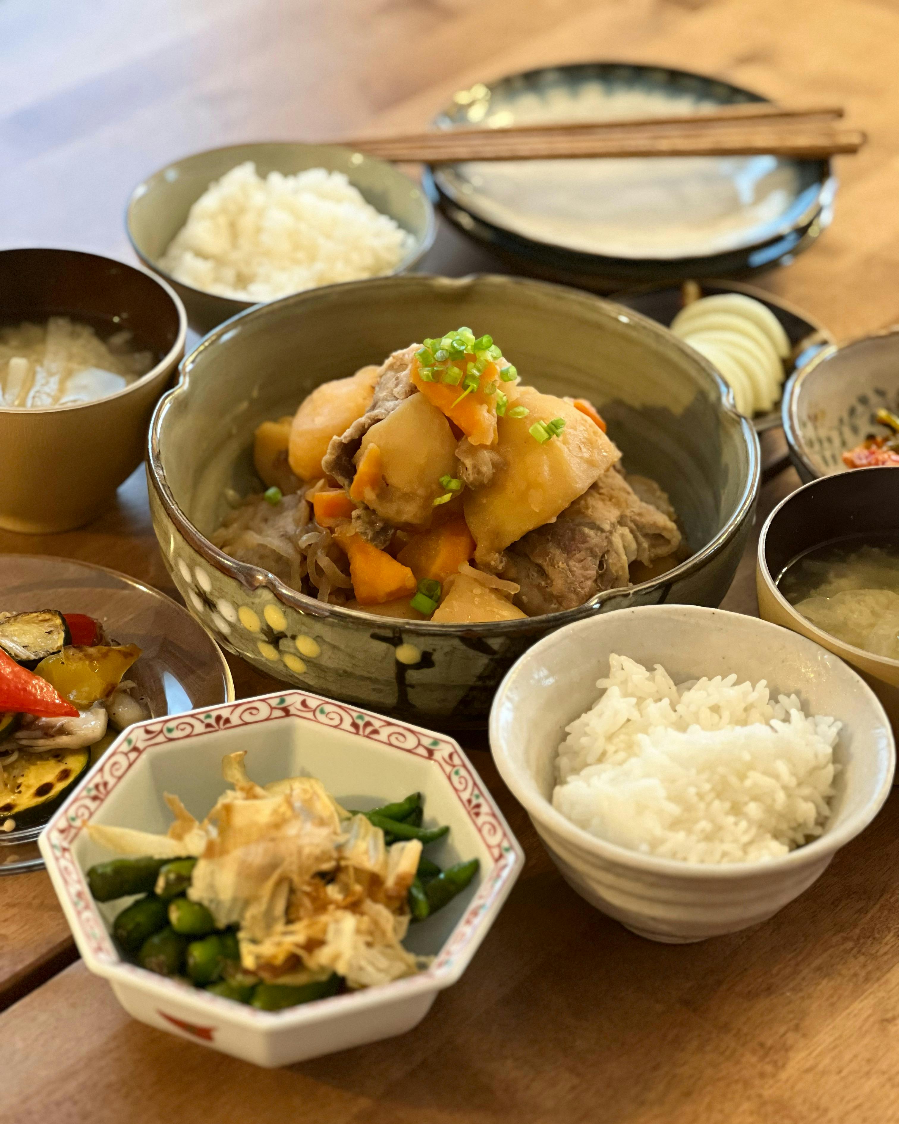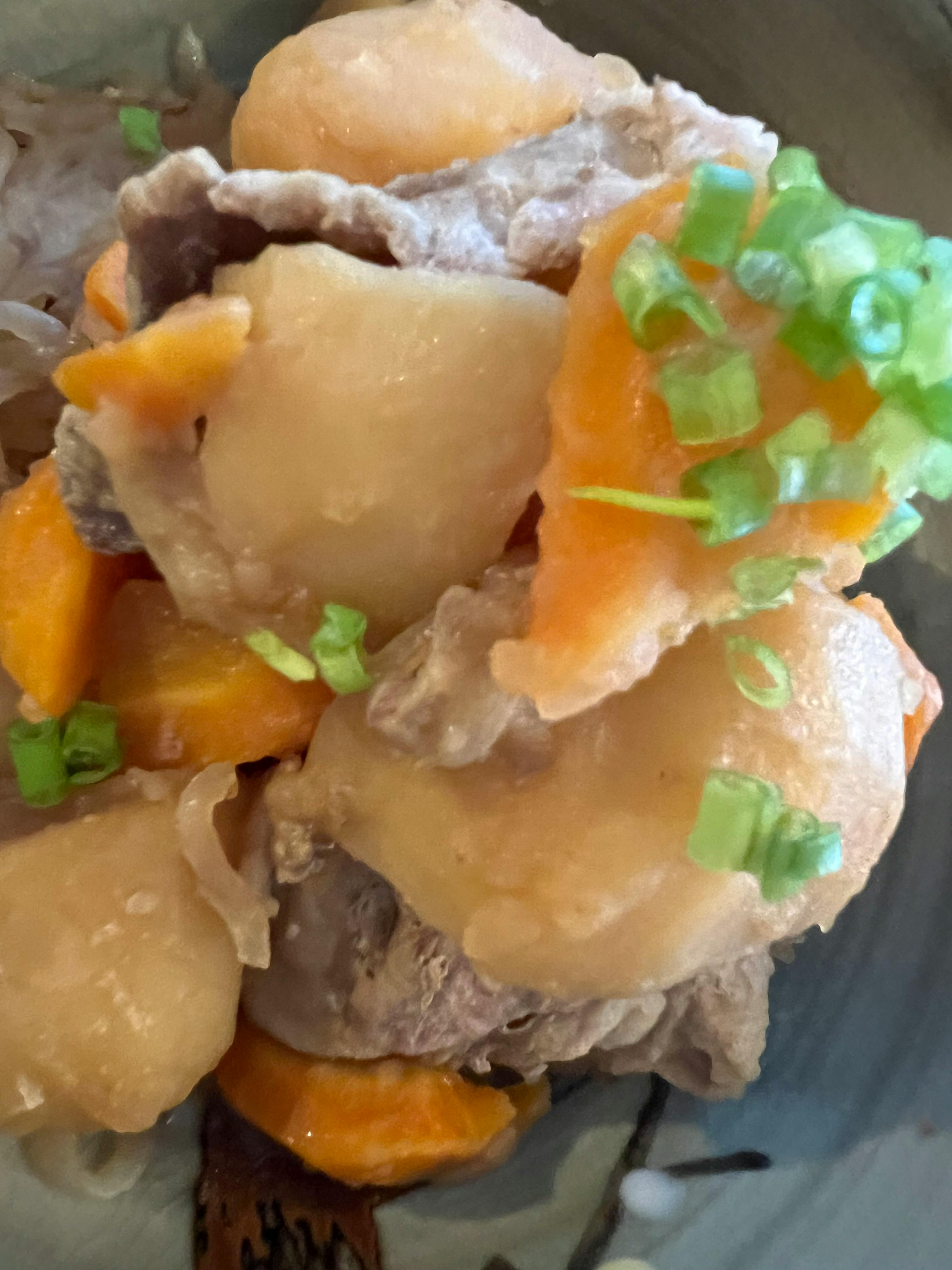 いつからか我が家の肉じゃがは無水で作るようになりました。 子供の頃はあまり好きじゃなかった肉じゃが。今はジャガイモのホクホク感も人参の甘さも好き。サヤエンドウは誰も食べないので緑が欲しく小ネギをパラパラ。 お肉はその時あったお肉。今回は豚肉。