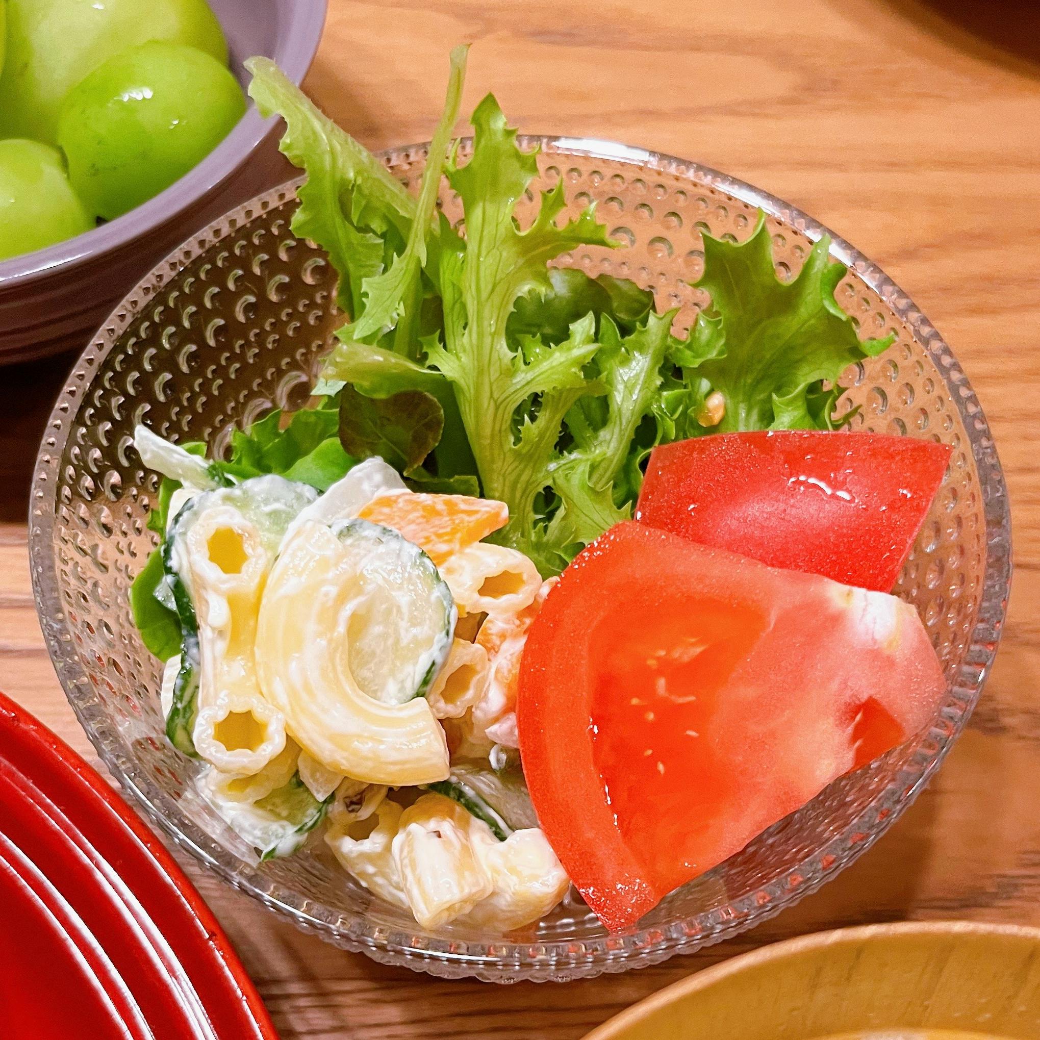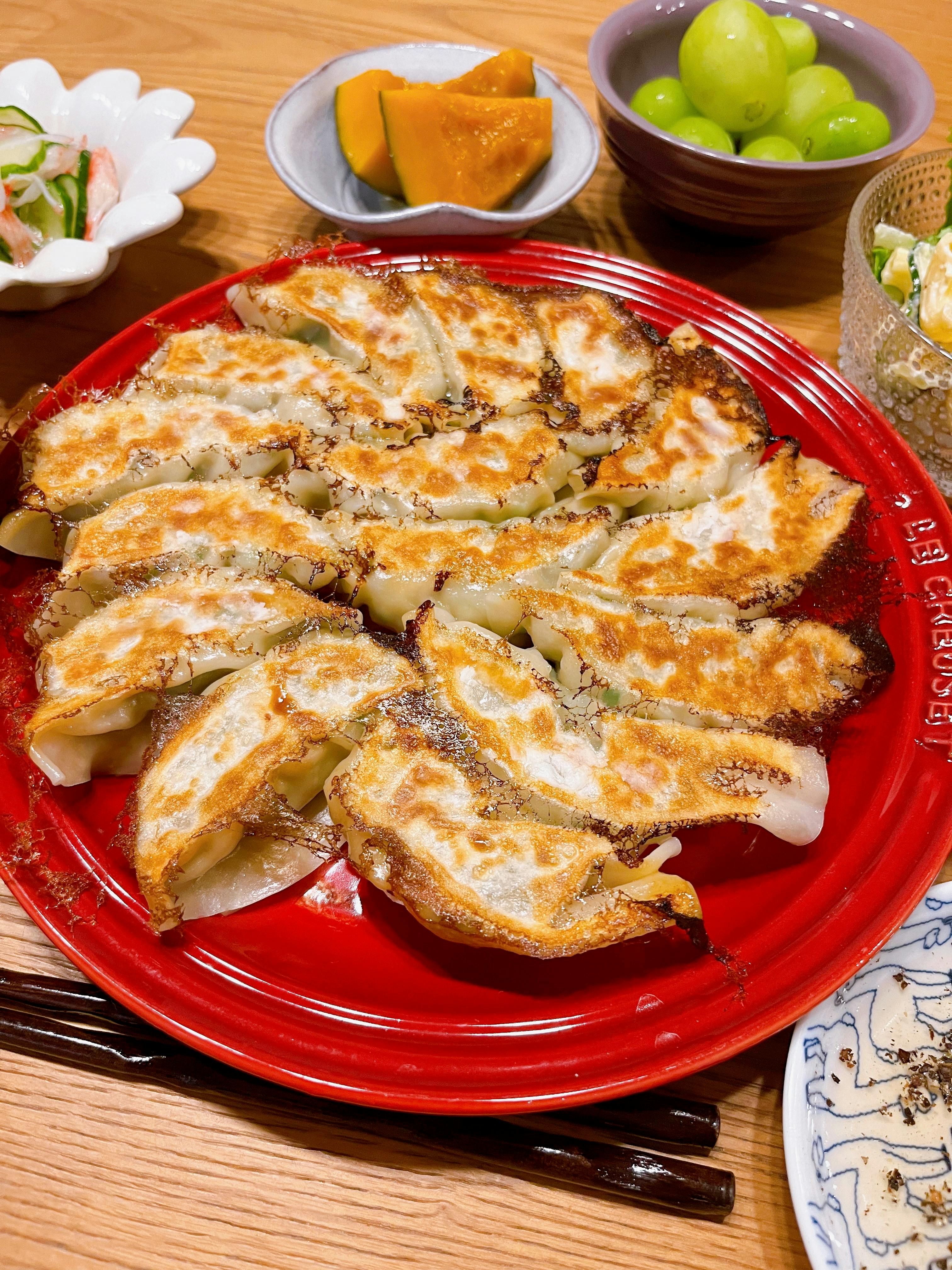 今夜は野菜たっぷりの餃子です。 米粉入りの皮なので、モチモチして美味しい♡ ・焼き餃子 ・南瓜煮物 ・マカロニサラダ ・胡瓜とカニカマの酢の物 ・かきたま汁 ・葡萄