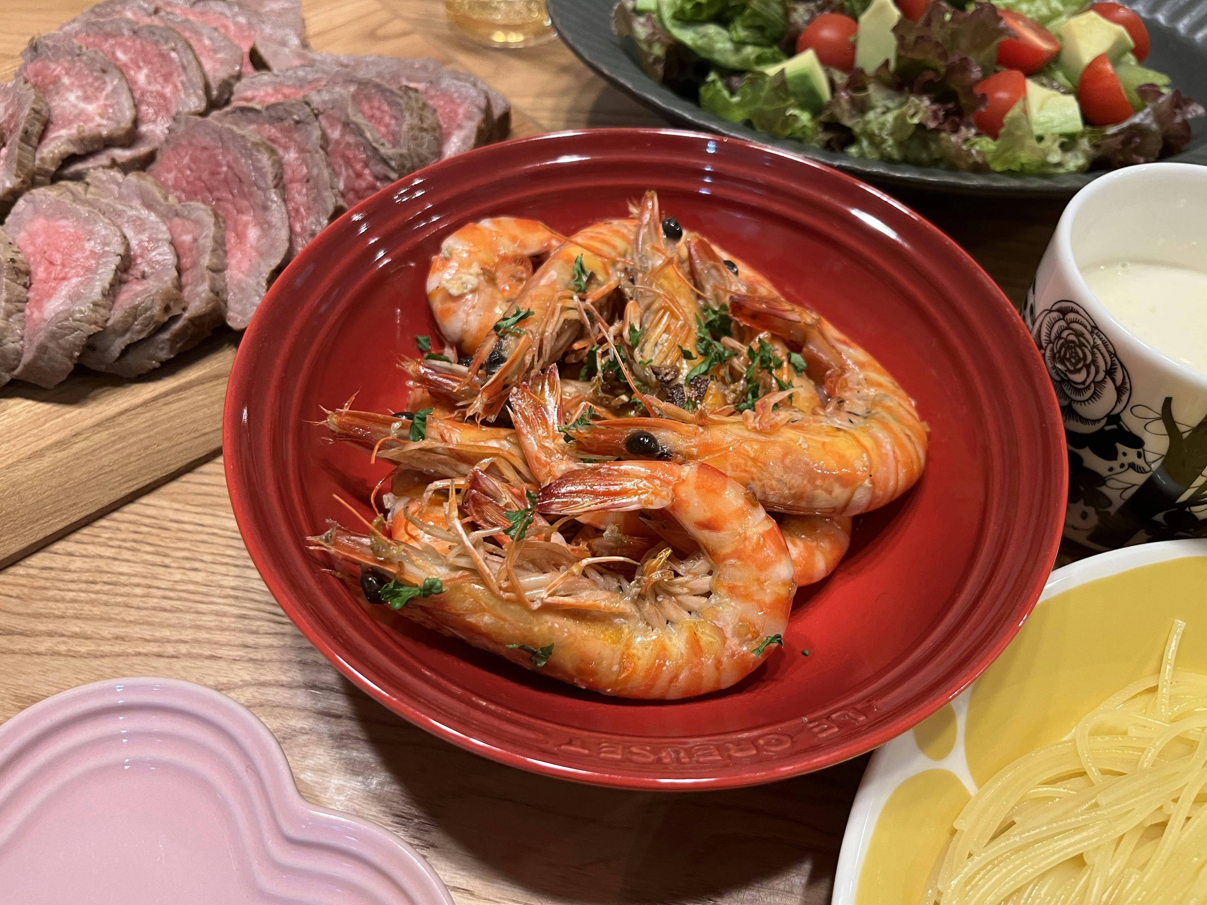 年に一度だし、今日は食材に拘りました😌 ・ローストビーフ(佐賀牛) ・車海老のガーリックシュリンプ ・ペペロンチーノ ・サラダ ・コーンポタージュ