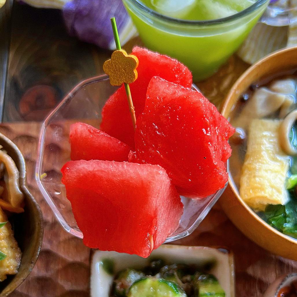 ❁ 鮭ハラスのミニ丼 ❁ 小松菜としめじと油揚げの味噌汁 ❁ ブロッコリーとトマトの中華風卵炒め ❁ 絹揚げのきのこあんかけ ❁ きゅうりの塩昆布おかか和え ❁ 数の子入り松前漬け ❁ スイカ🍉 大好きな鮭ハラスは大根おろしたっぷりでさっぱりと。 絹揚げに野菜のあんをかけたもの美味しいですよね😋
