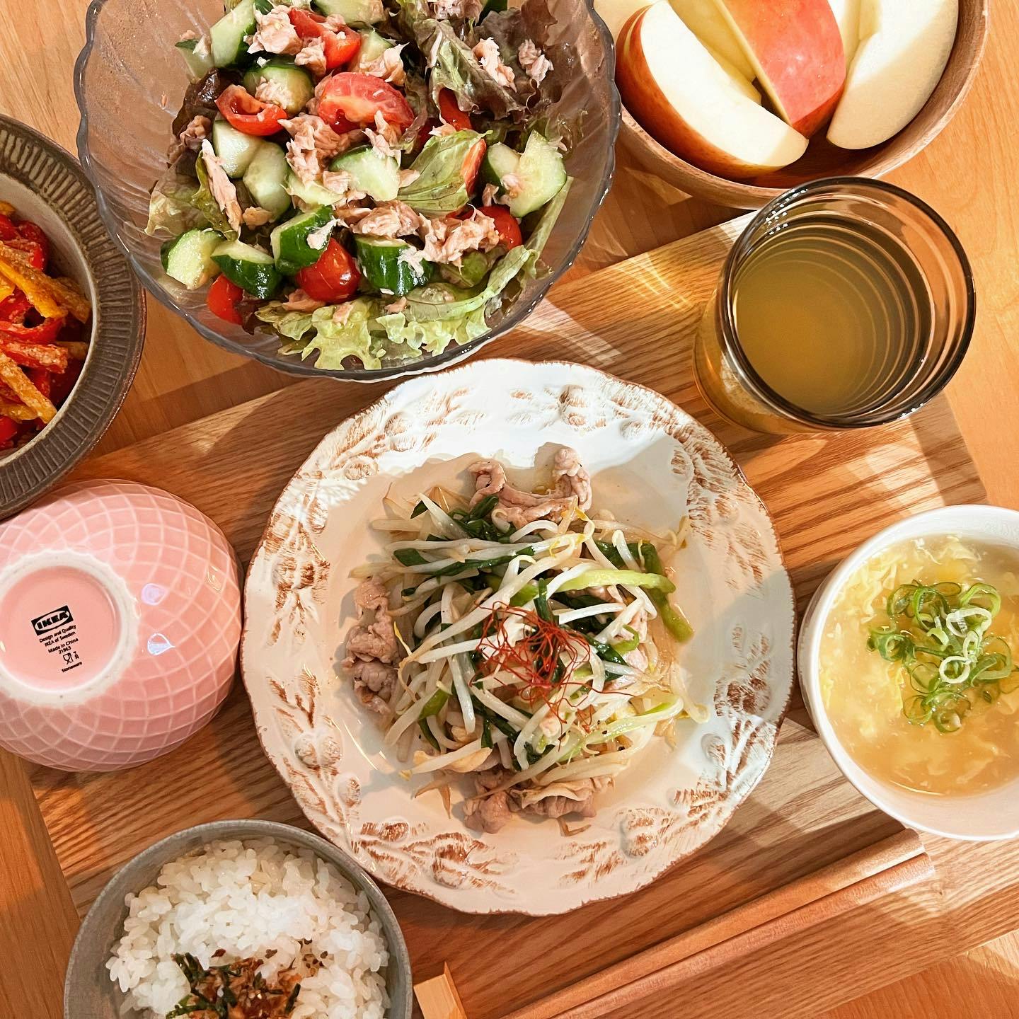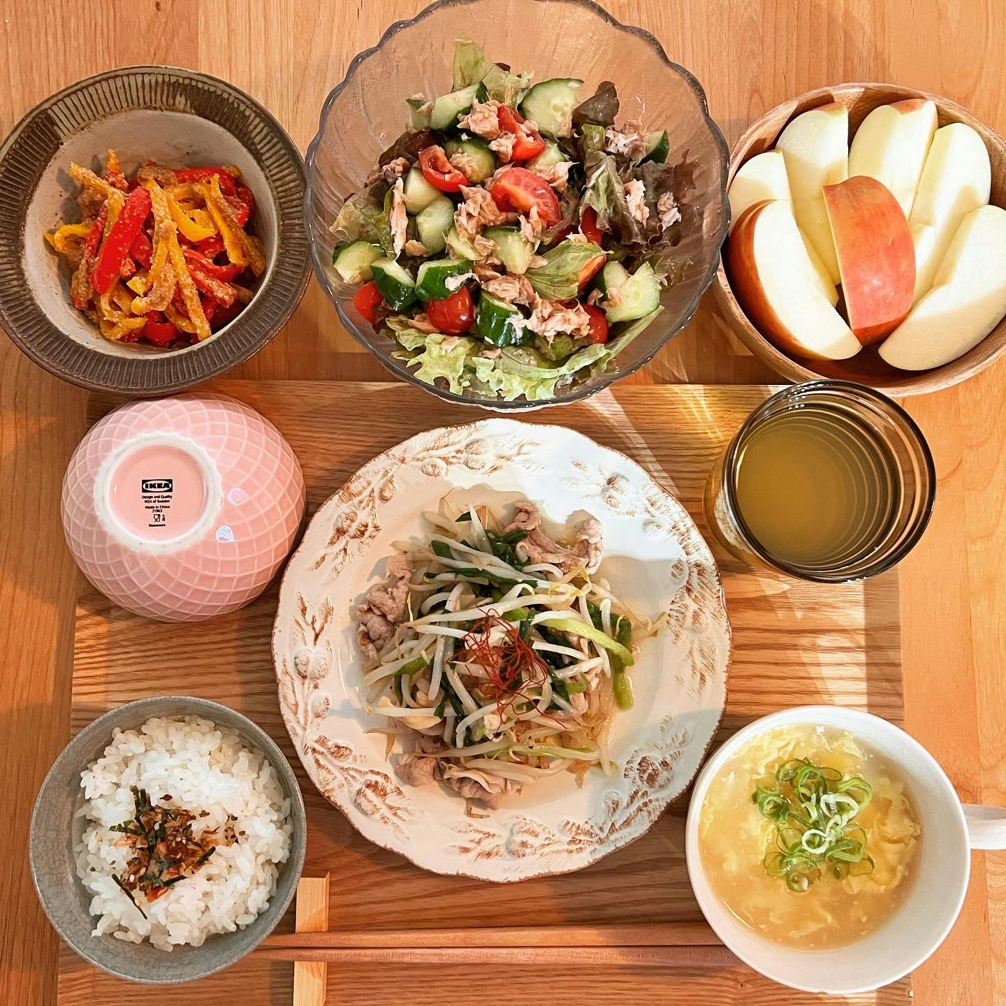 🐖🍋🧂 𖧵豚ニラもやしのレモンペッパー炒め 𖧵とろみコーンたまごスープ 𖧵トマトツナサラダ 𖧵パプリカのごま和え 𖧵りんご _________ 「パプリカのごま和え」はたまに作る副菜の一つ📔 ˊ˗ レンジでできて簡単だからお気に入りです✨ :