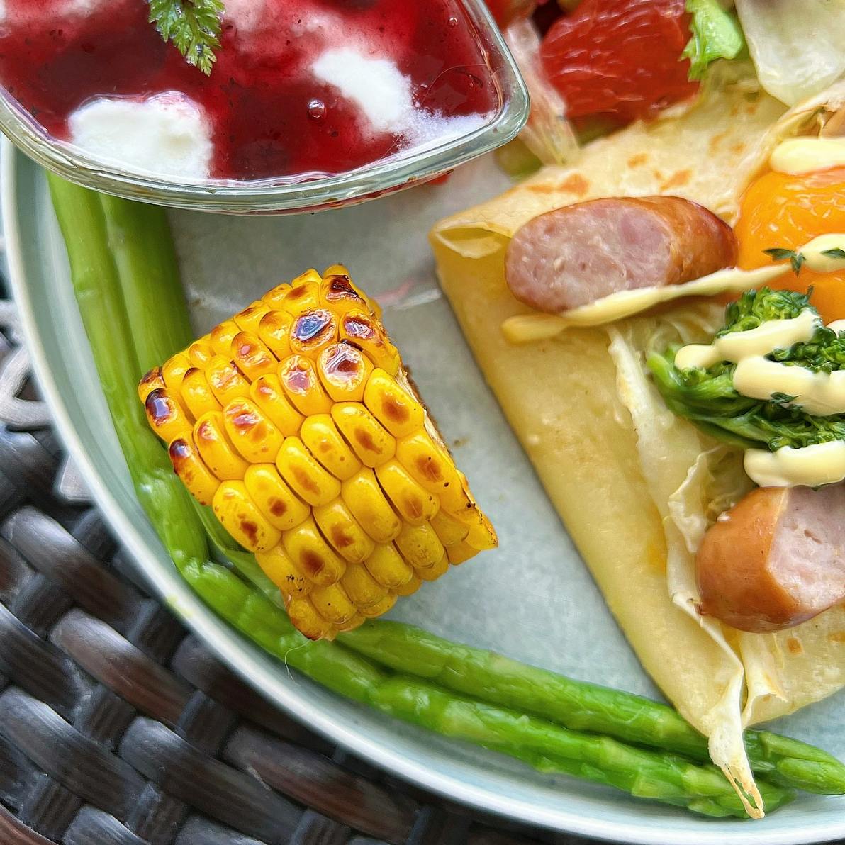 焼きとうもろこしとボイルアスパラガス