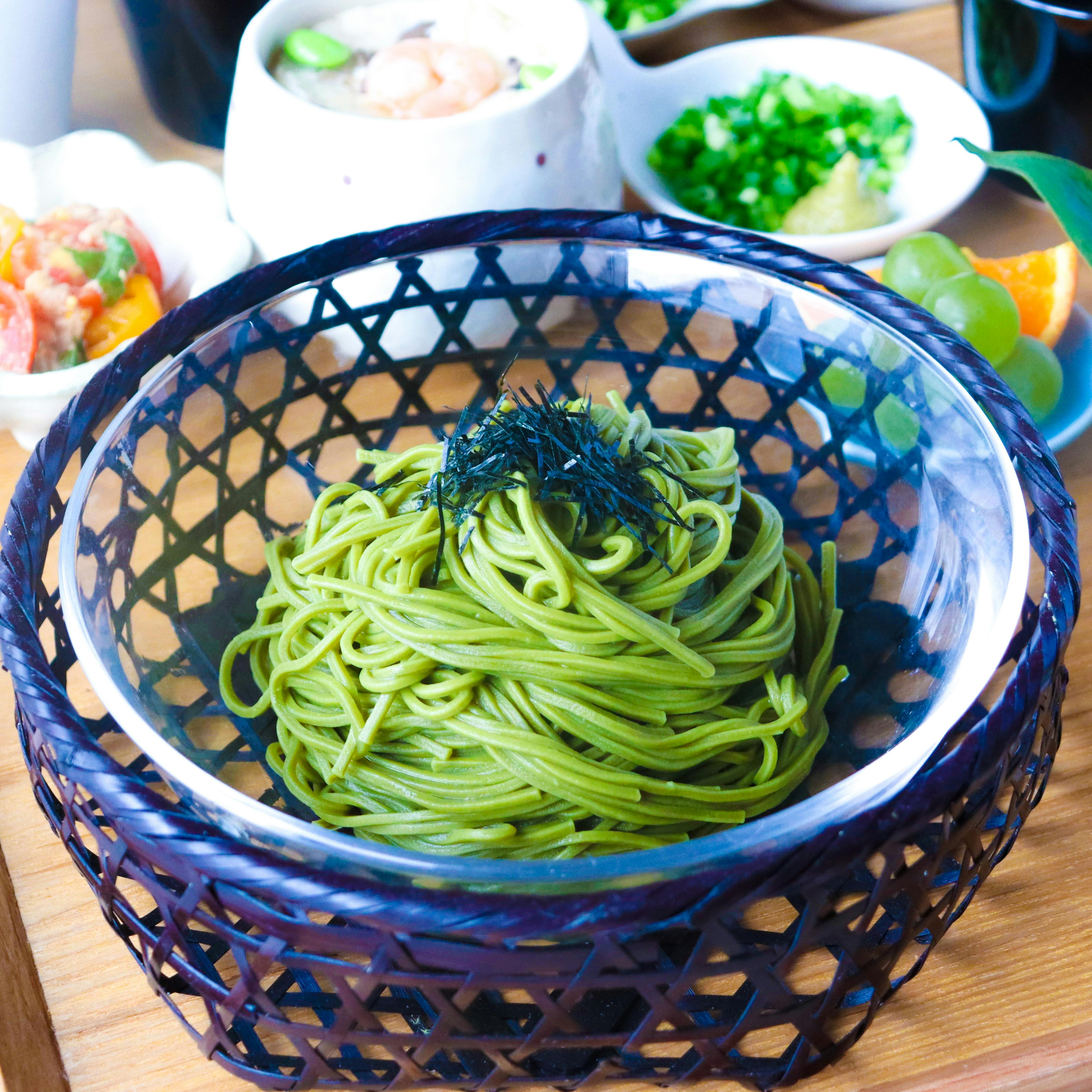 ꕤ 抹茶蕎麦 ꕤ 天ぷら(おくら・ささみ) ꕤ 茶碗蒸し ꕤ とろろ ꕤ トマトと大葉のツナ和え ꕤフルーツ 今日は和食!! 久しぶりのお蕎麦〜🩷 やっぱりお蕎麦大好き…