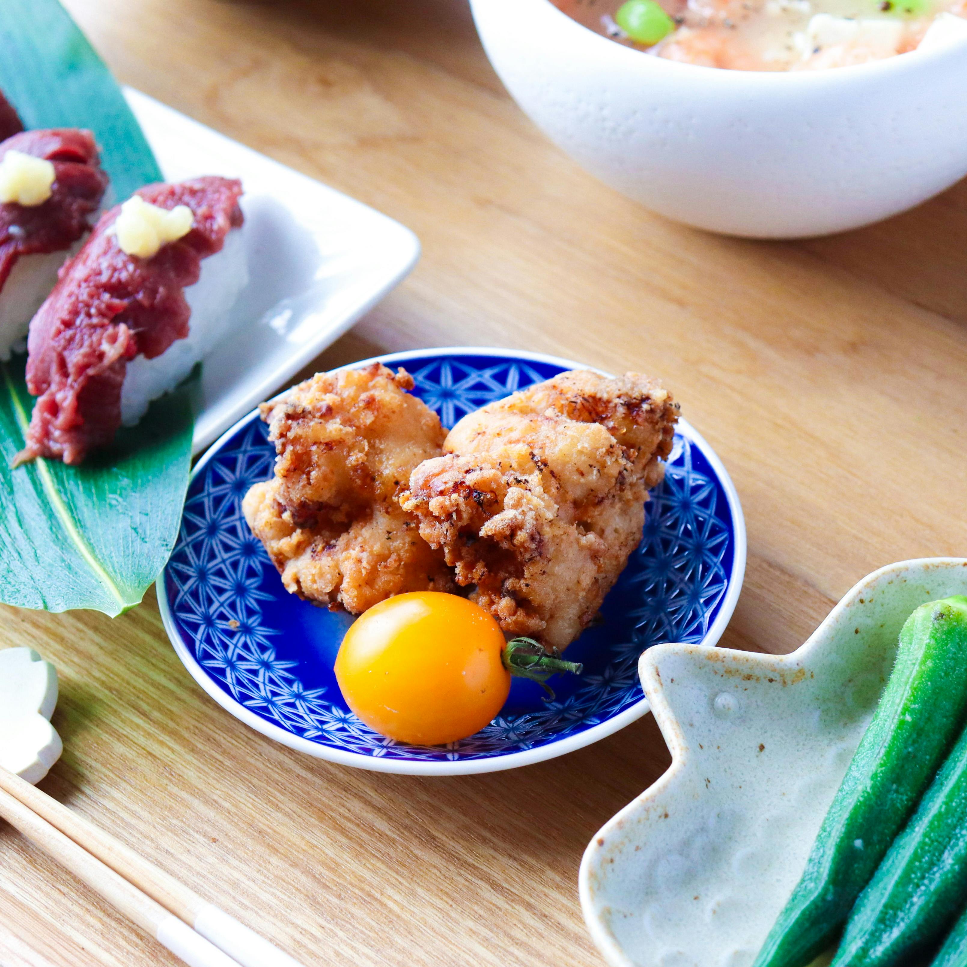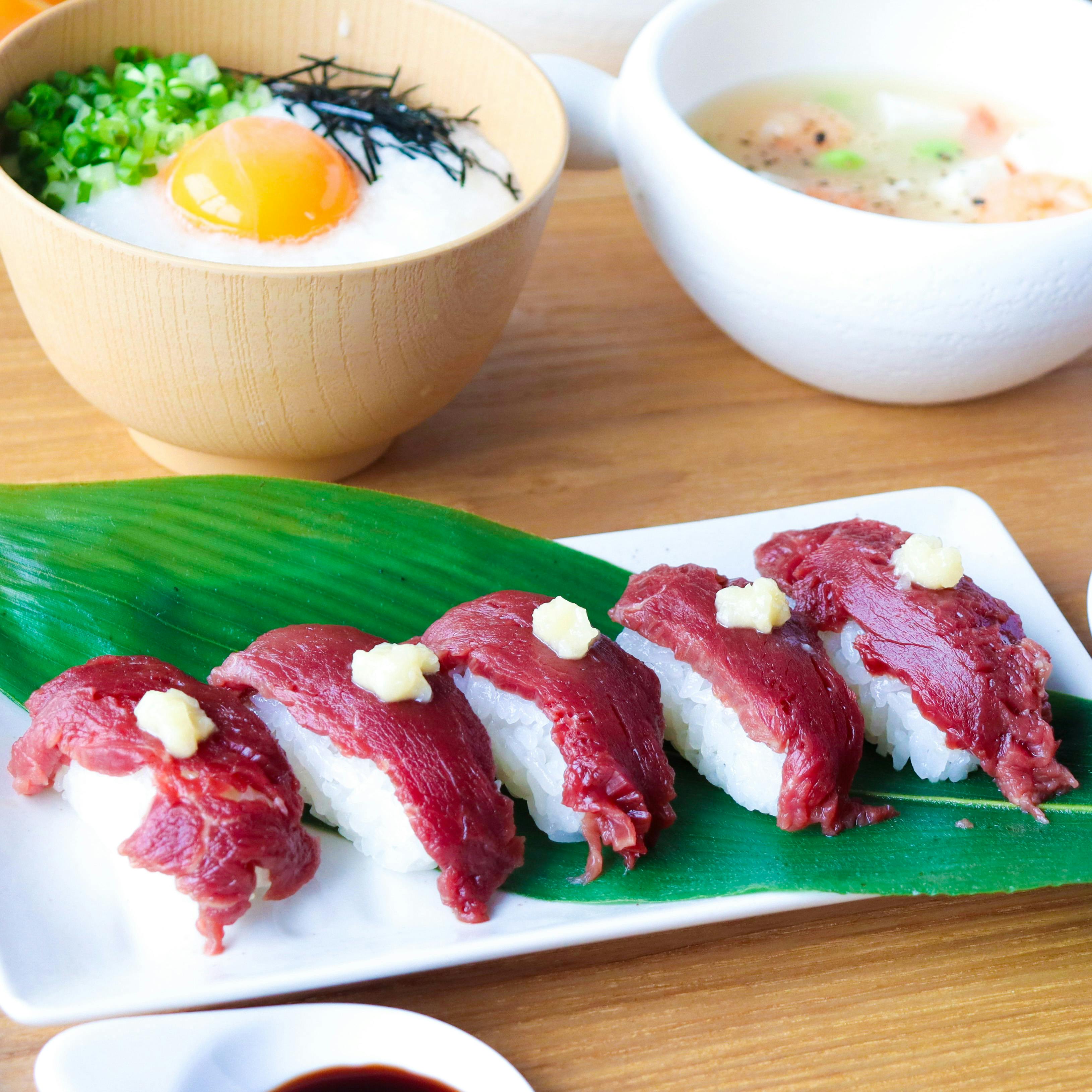 ꕤ 馬刺し寿司 ꕤ 唐揚げ ꕤ 海老と豆腐のとろみあん ꕤ おくらの白だし漬け ꕤ やまかけ月見うどん ꕤフルーツ 大好きな馬刺し🩷 そのままで食べるのも美味しいけど、酢飯との相性は抜群🫶🏻✨
