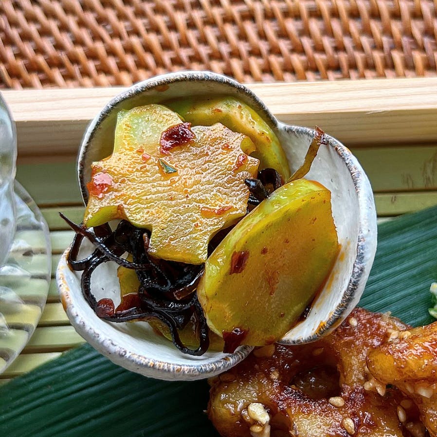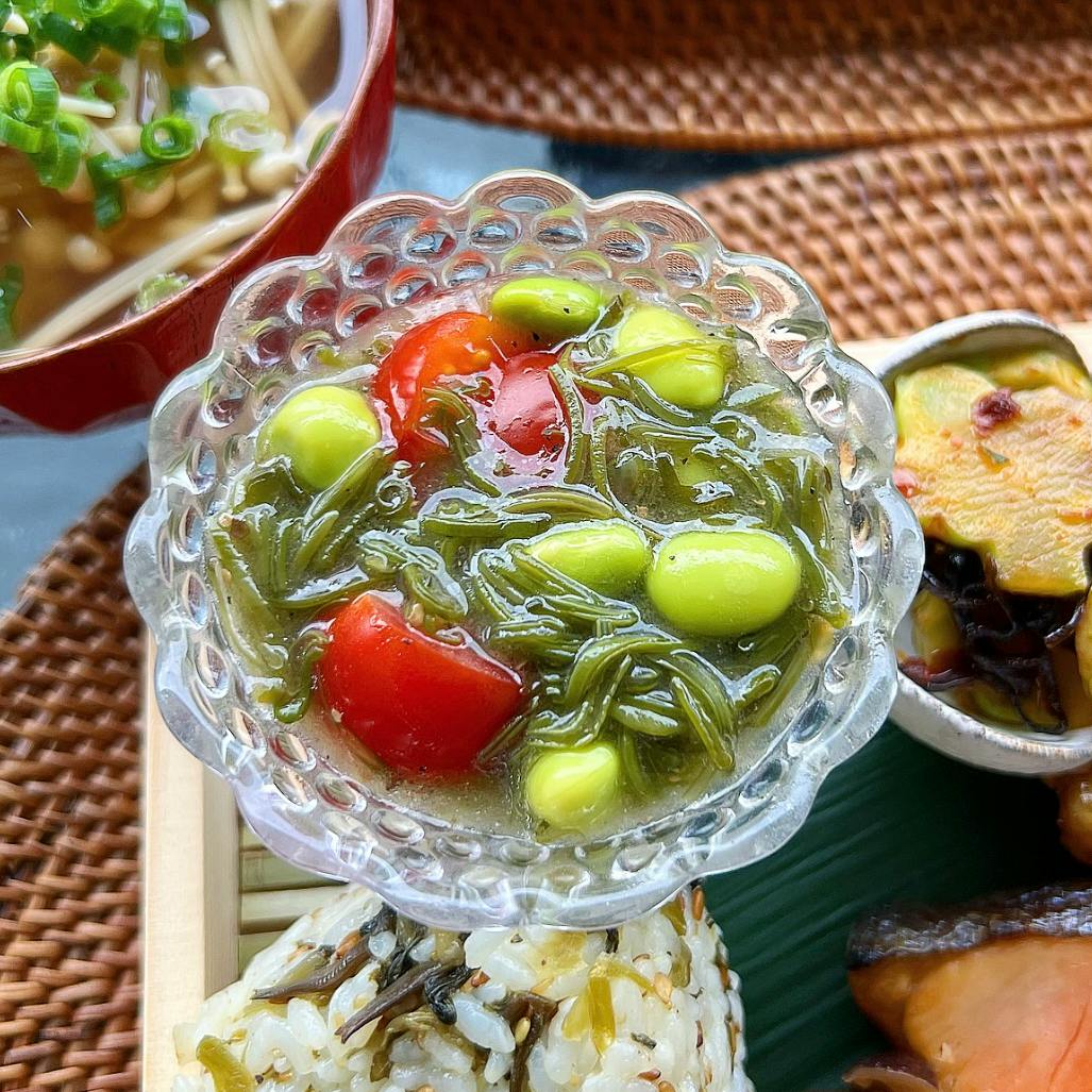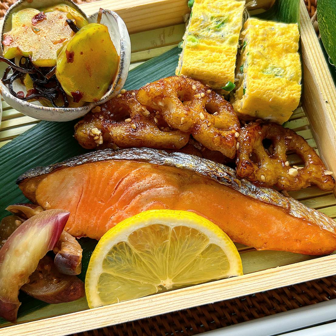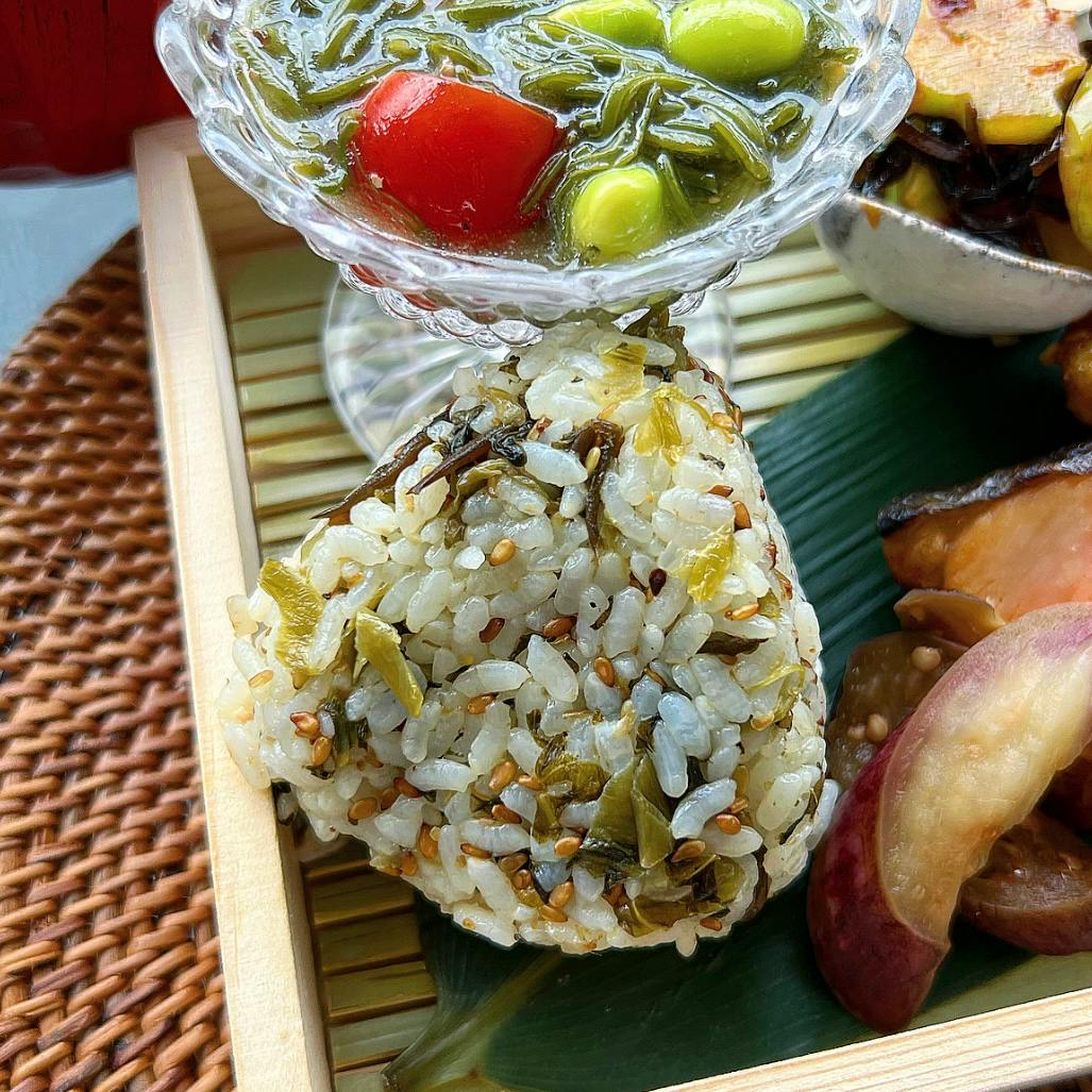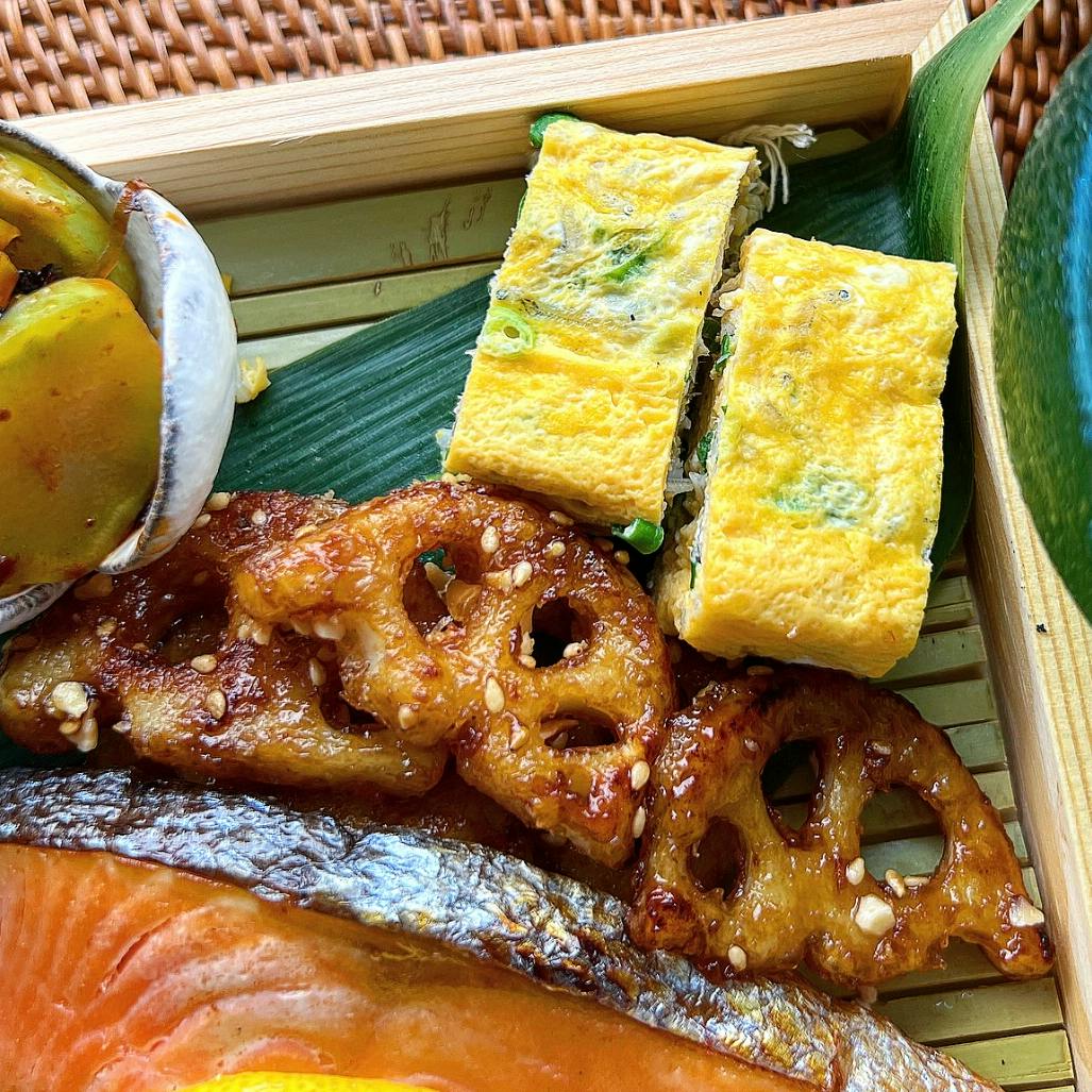 ❁ 高菜じゃこのおにぎり ❁ 鮭の塩焼き ❁ めがぶとむき豆とトマトの酢の物 ❁ 甘辛蓮根炒め ❁ ねぎ入り卵焼き ❁ ブラッコリーの茎のザーサイ ❁ 茄子の浅漬け ❁ 豆腐とえのきの味噌汁 この夏活躍した3COINSのトレーすだれセットに盛り付け。 ざるそば以外でもなかなか使えます🤭 好きなものを盛り付けて美味しくいただきました🫶