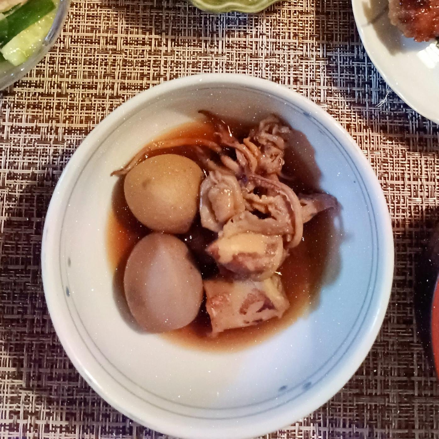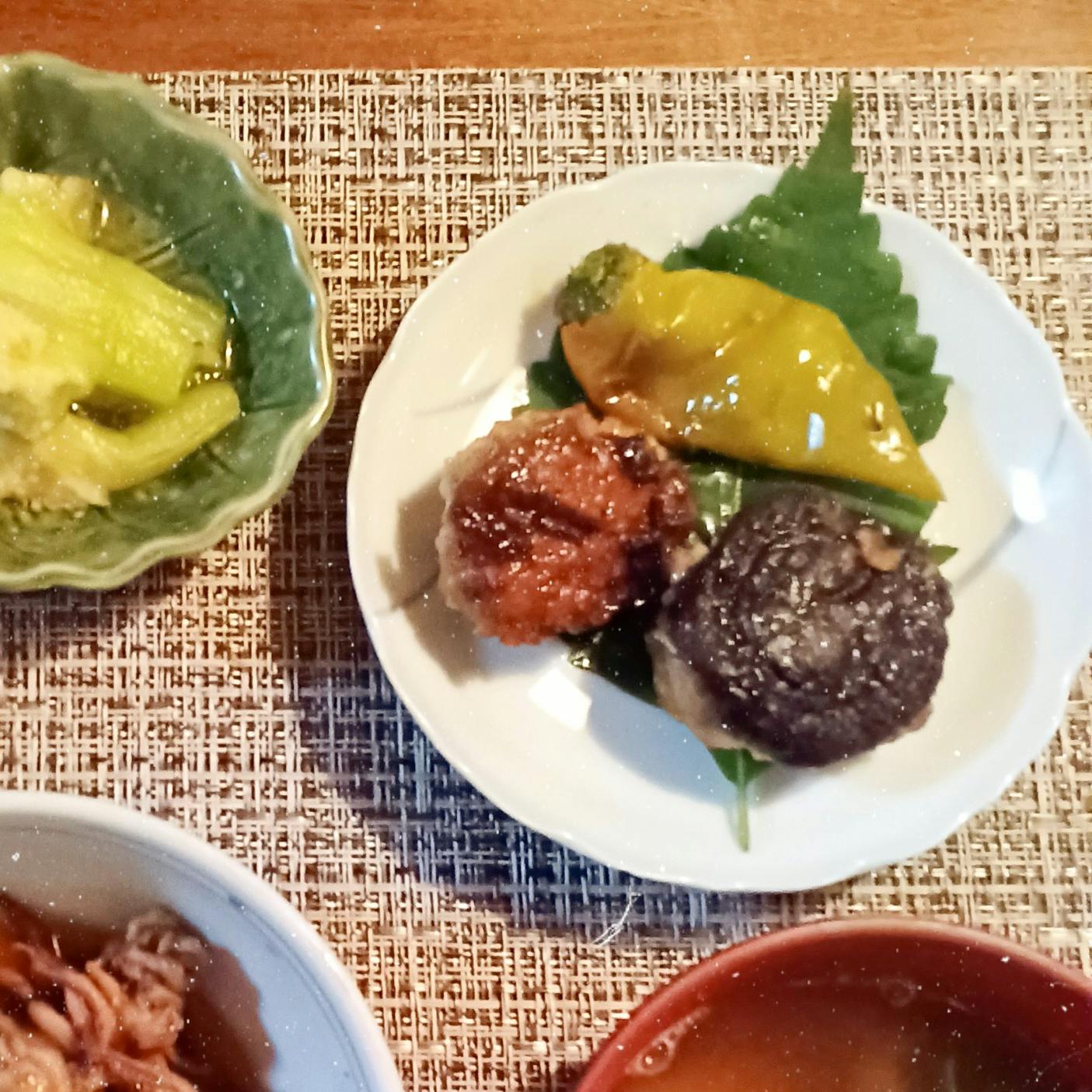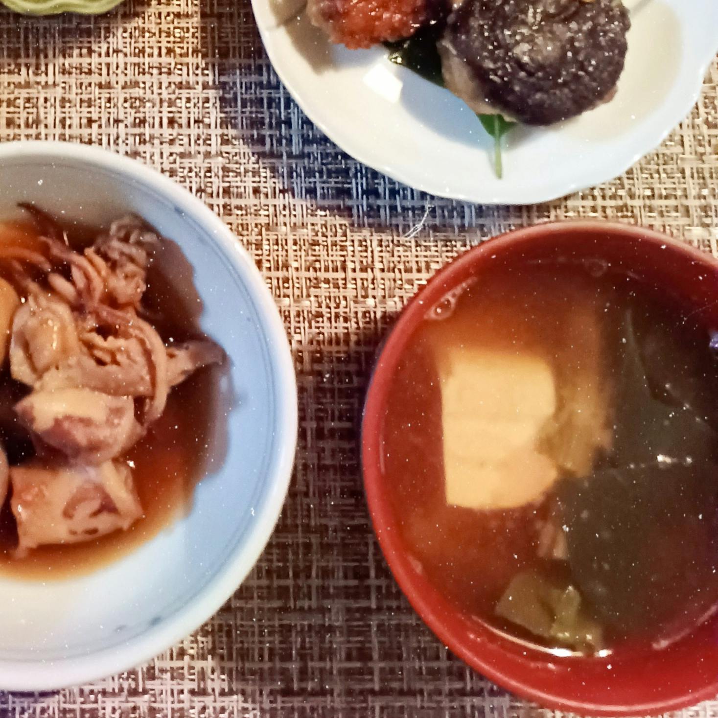 ヒイカと小芋煮物 椎茸つくね照焼き(昨日の残り) なすのお浸し きゅうりとトマトゴマ酢だれ 発芽玄米1割 #豆腐と小松菜味噌汁
