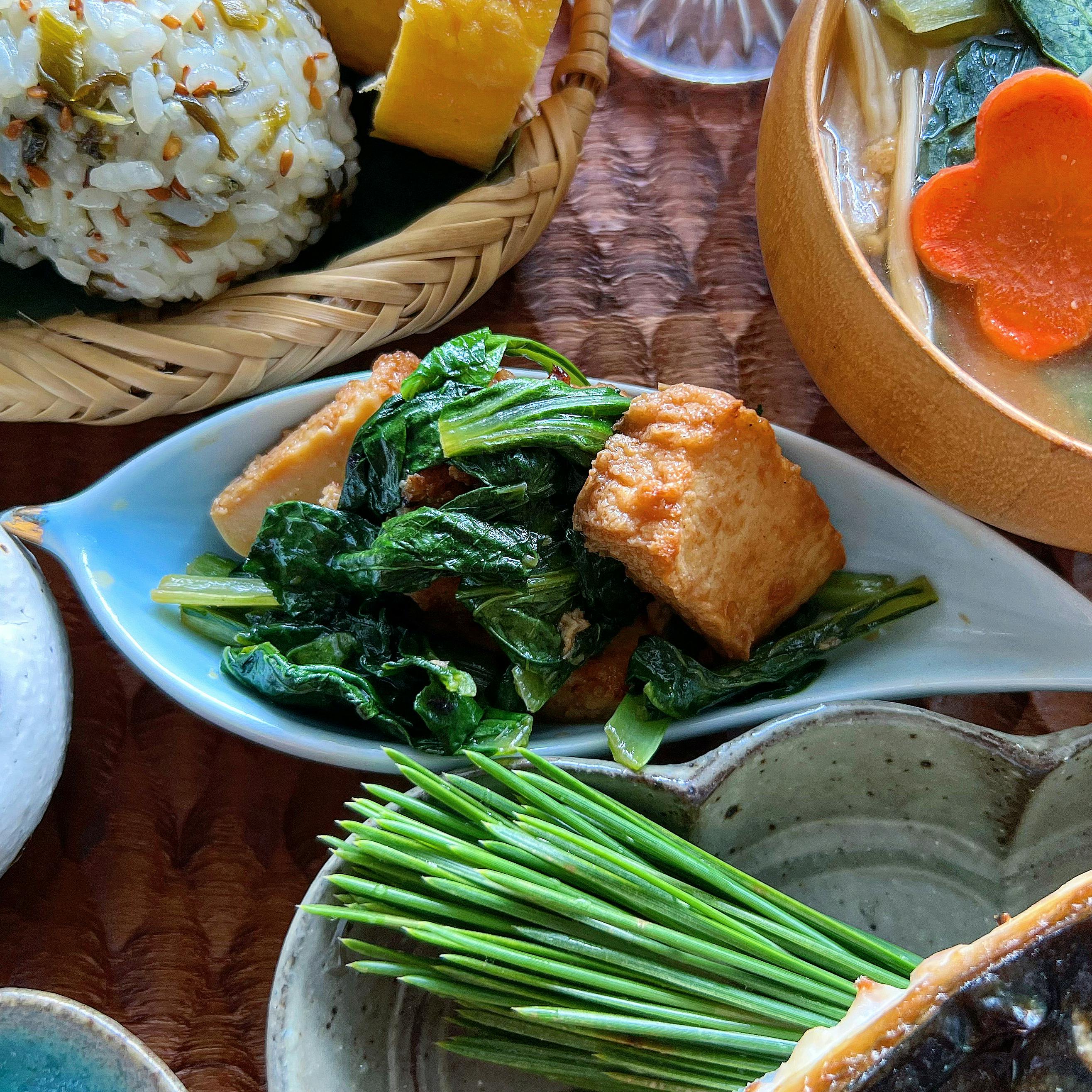 小松菜と絹揚げの甘辛炒め