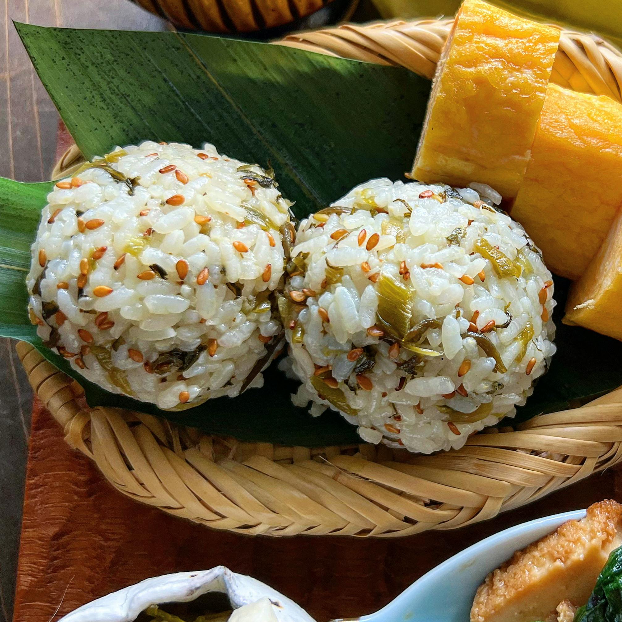 高菜じゃこのまんまるおにぎりと卵焼き