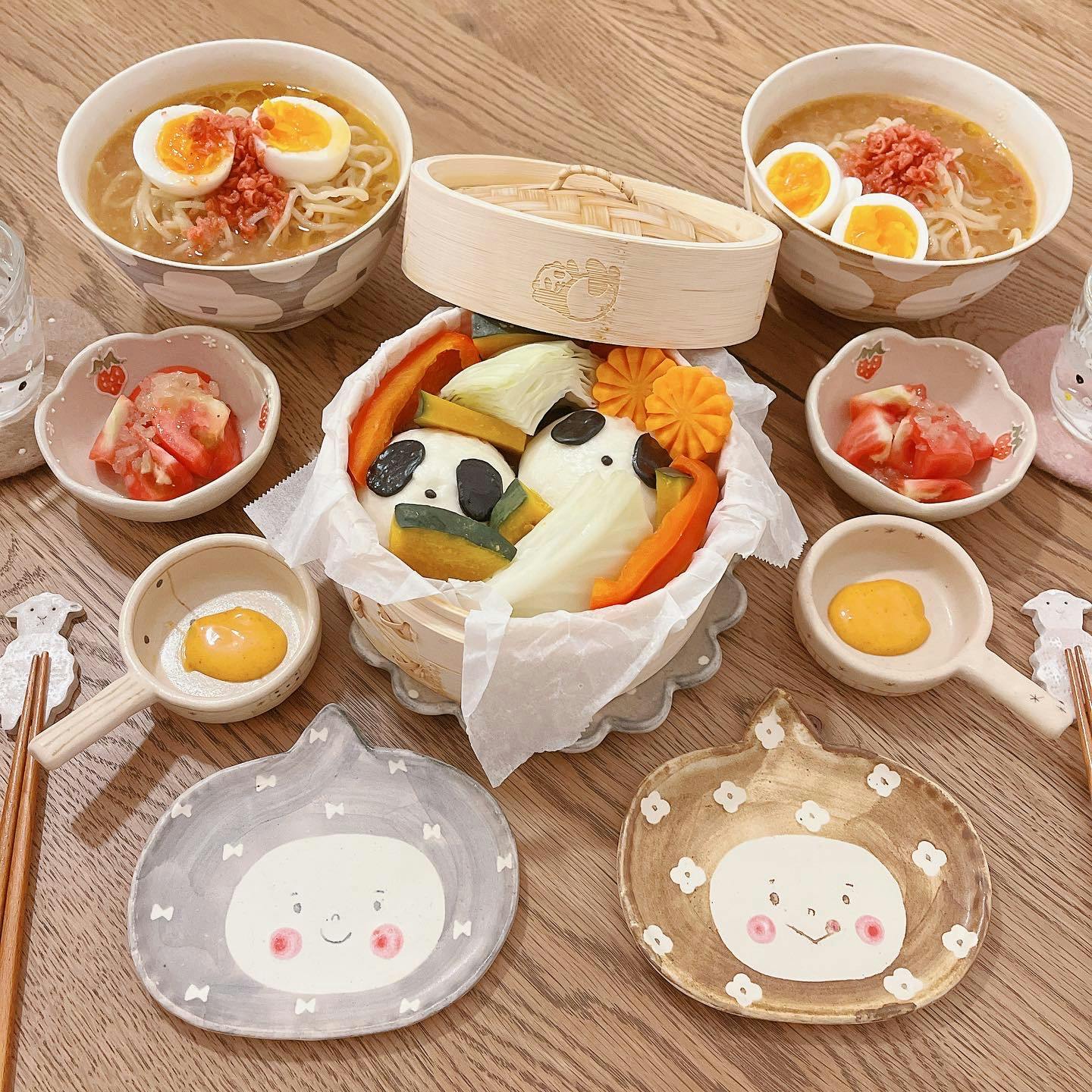 お土産で頂いたラーメンと、 カルディで購入したパンダ肉まん 🐼 可愛い蒸籠で ♩