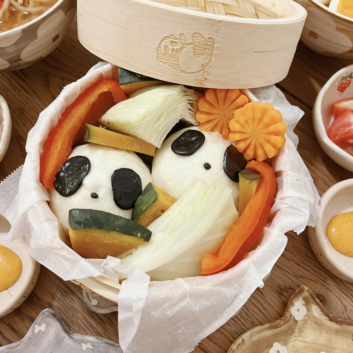 パンダ肉まん、蒸し野菜