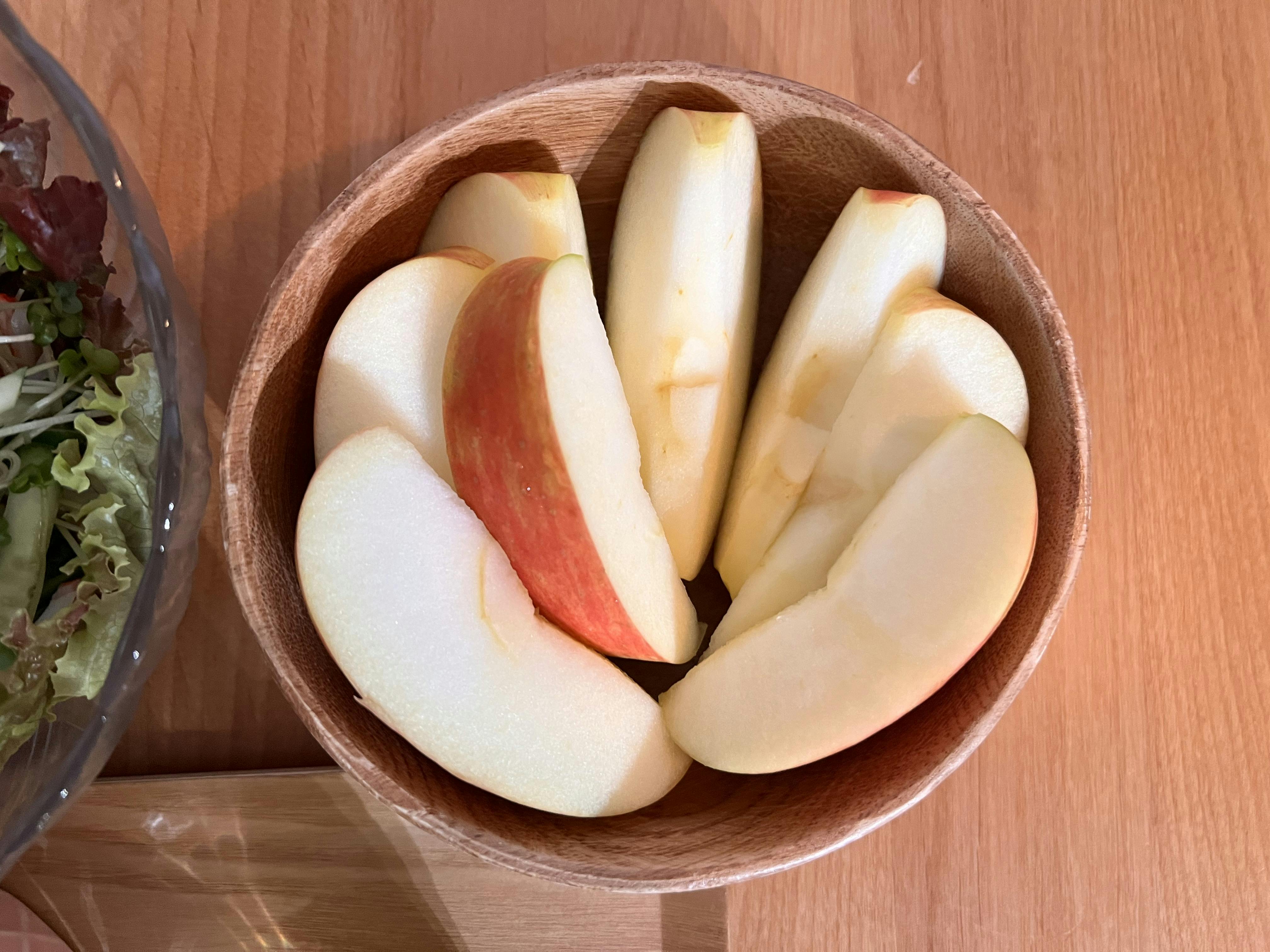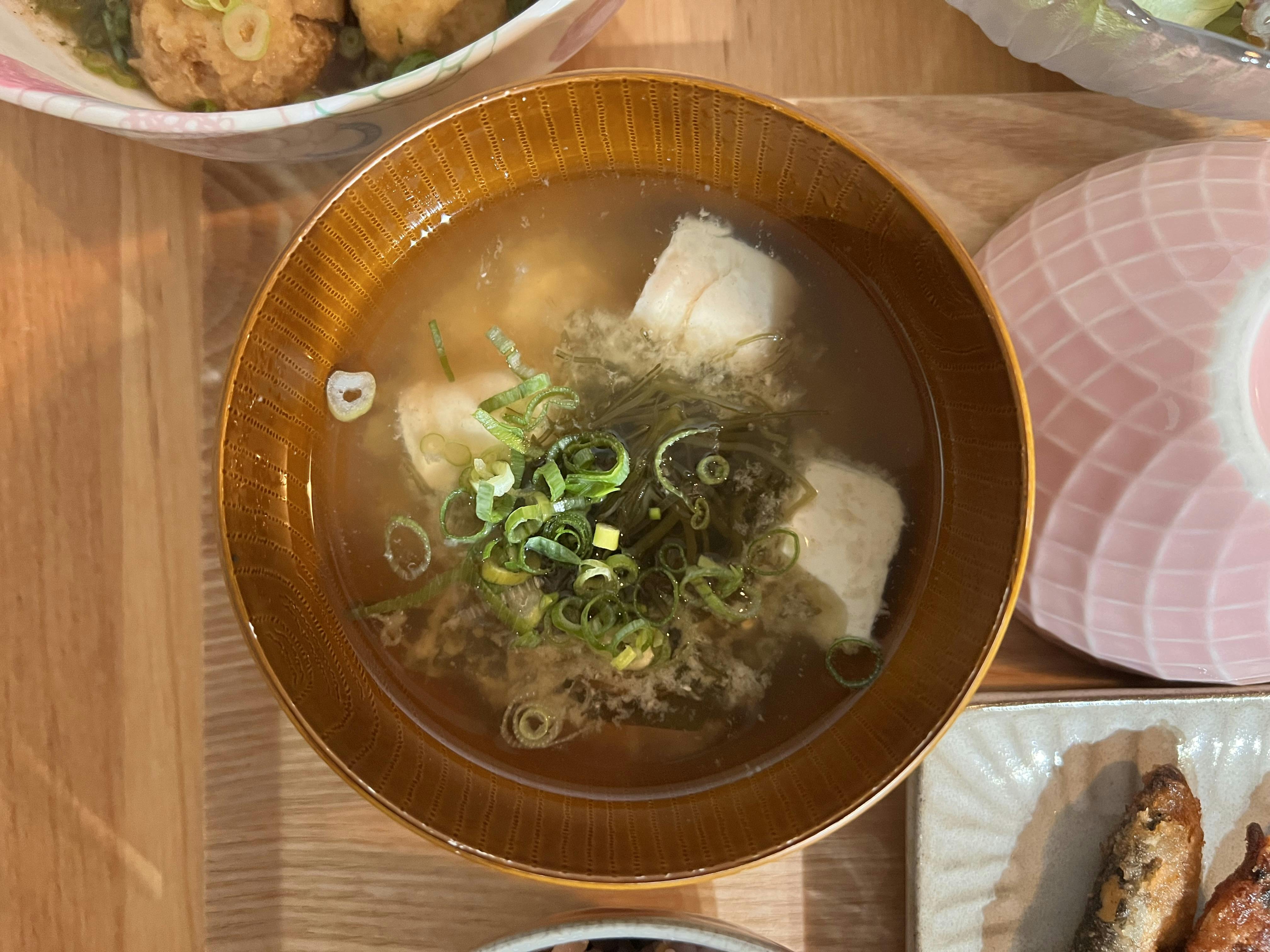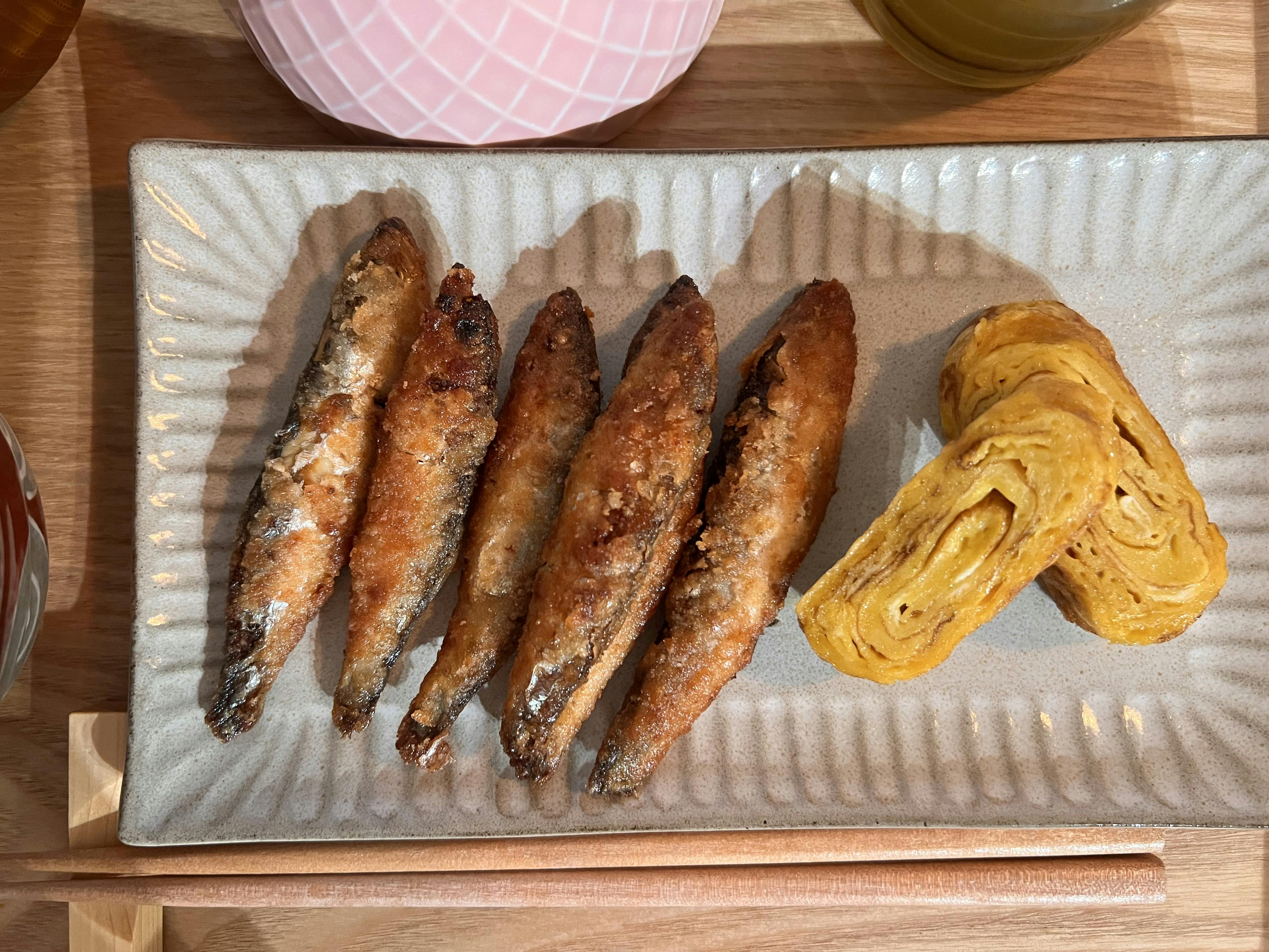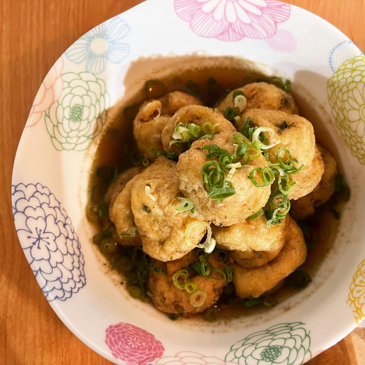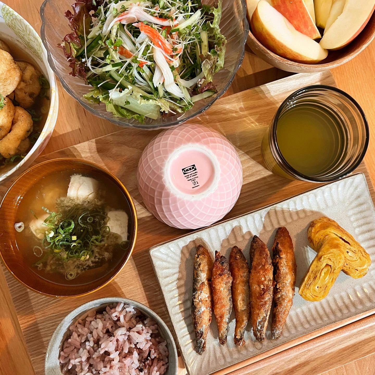 🌾🐟🥚 𖧵十五穀米 𖧵小魚の竜田揚げ 𖧵だし巻き卵 𖧵豆腐とがごめ昆布の味噌汁 𖧵カニカマスプラウトサラダ 𖧵がんもの含め煮 𖧵りんご _________ トマトが傷んでいて使えなく、 サラダが少し寂しい感じに..🥗💔 隣のがんもは小玉タイプのもので このがんもで作る含め煮が1番好きです🥇 :