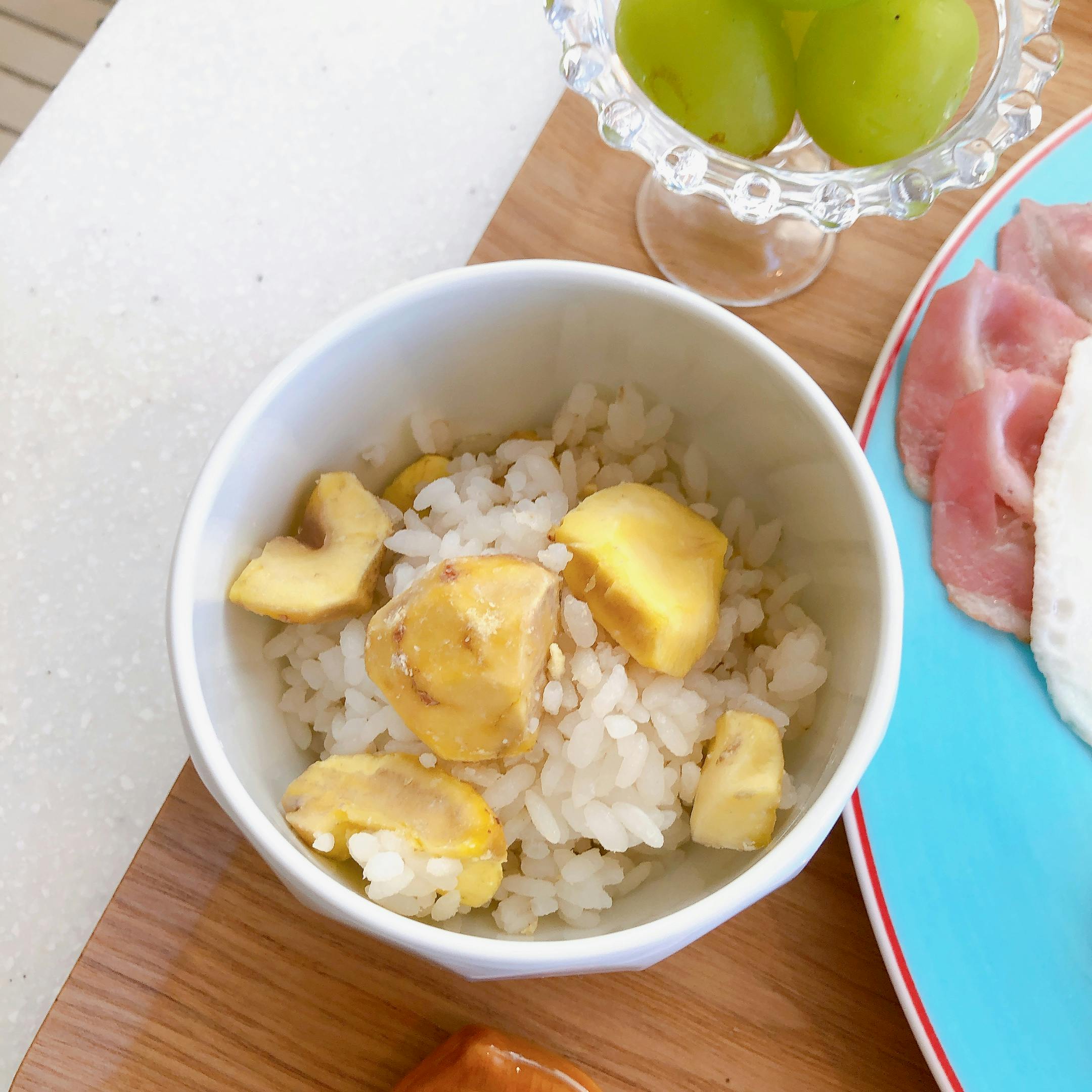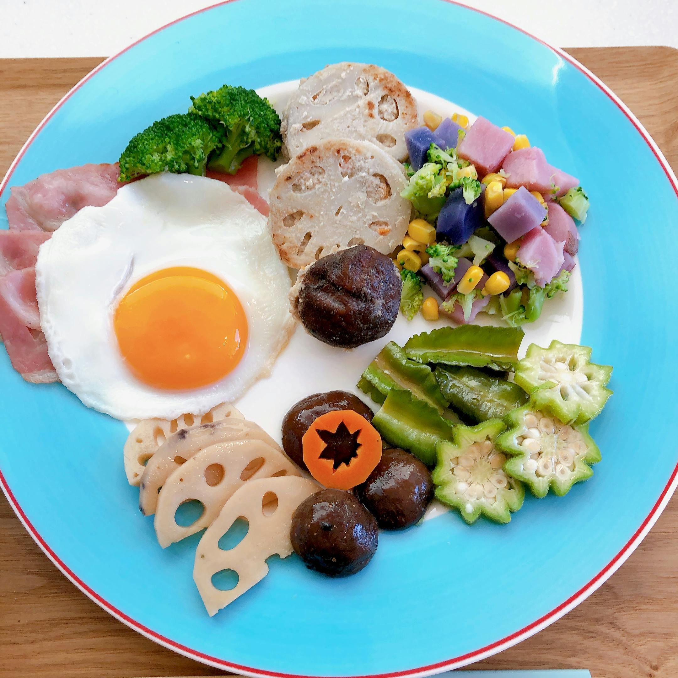 ✴︎栗ご飯 ✴︎ベーコンエッグ ✴︎蓮根と椎茸の煮物 ✴︎キングオクラ ✴︎シャドークイーンとノーザンルビーの宝石箱サラダ ✴︎蓮根と椎茸の挟み焼き ✴︎ブロッコリー ✴︎シャインマスカット ✨少しずつちょこちょこ盛りを今朝はワンプレートで! 主人はご飯が汚れるのが苦手なので栗ご飯は別添えです😊