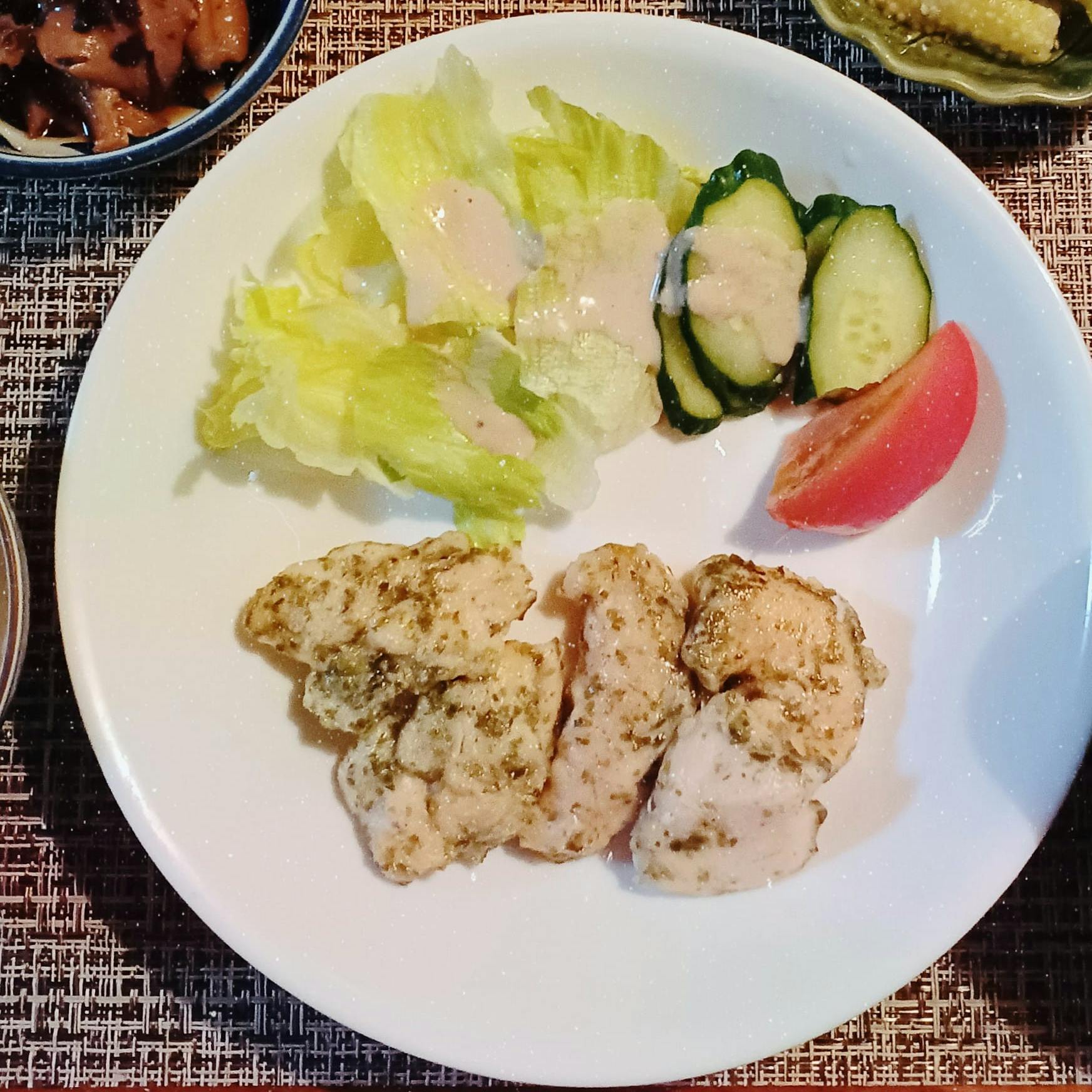 ささみのり塩 サラダ 茄子のお浸し ヒイカと小芋 の煮付け 味噌汁、発芽玄米1割ご飯 ささみに酒、塩をふり、片栗粉に青のりを混ぜたものをつけて焼くだけ~💗レモンを絞って下さい。 副菜は昨日の残り物
