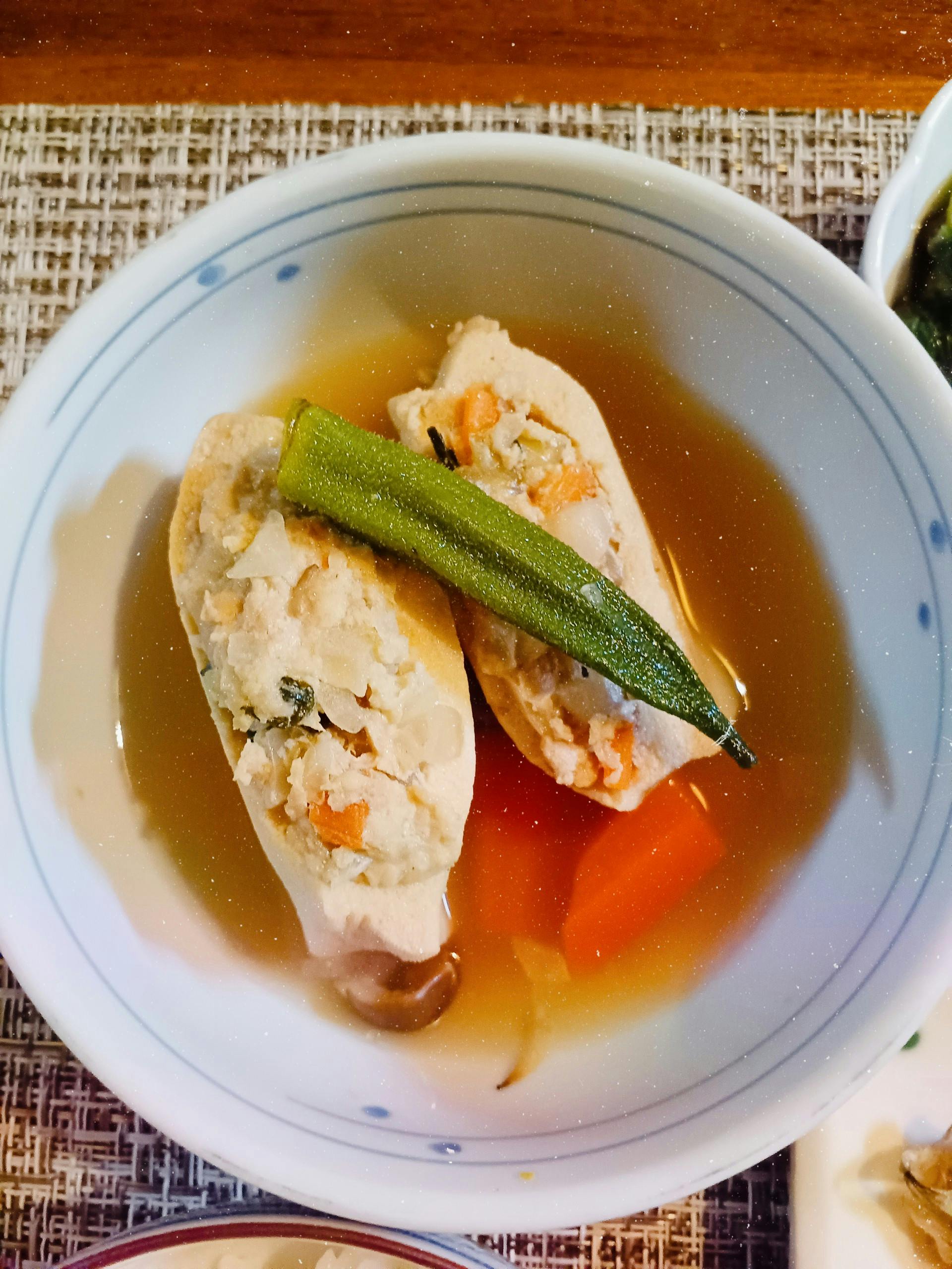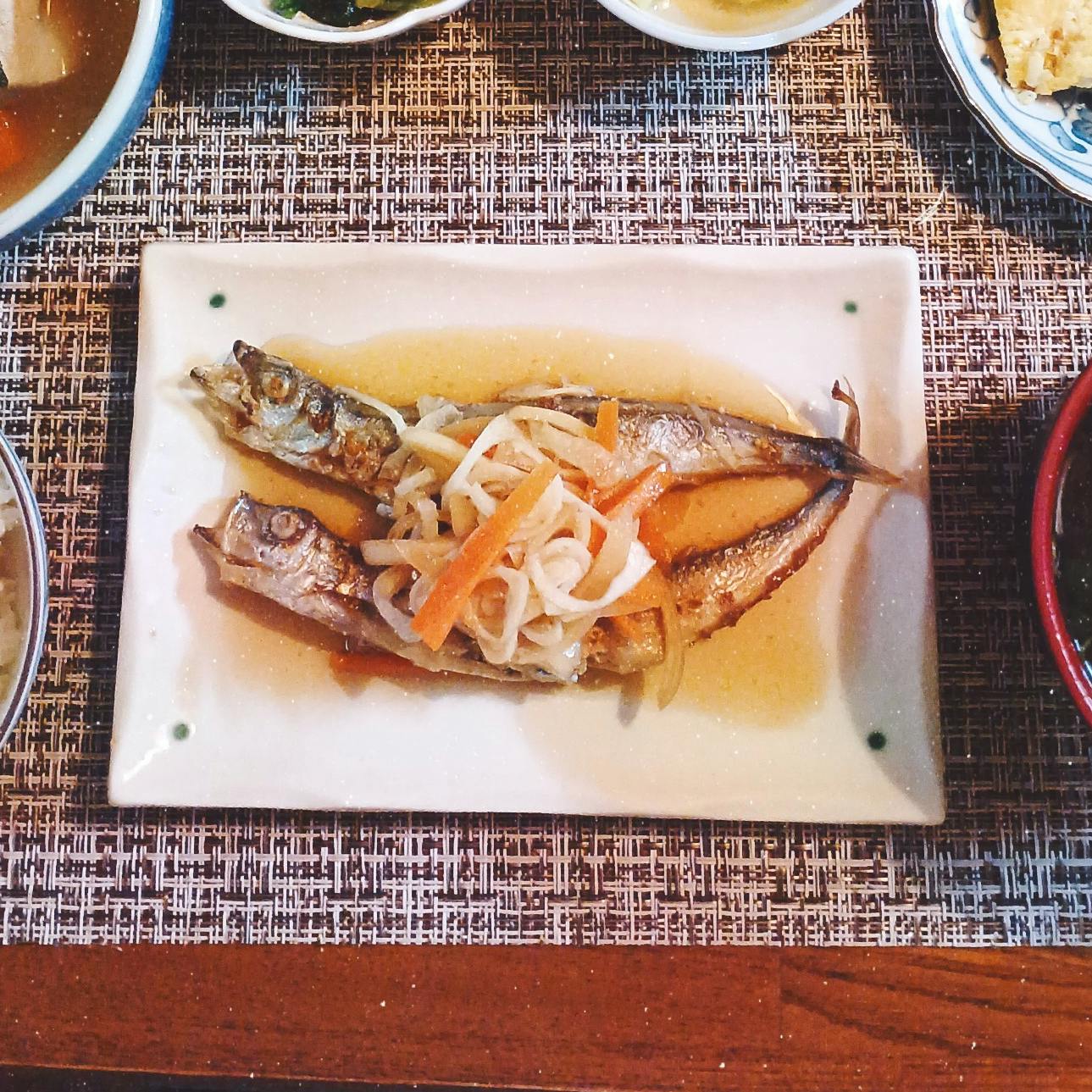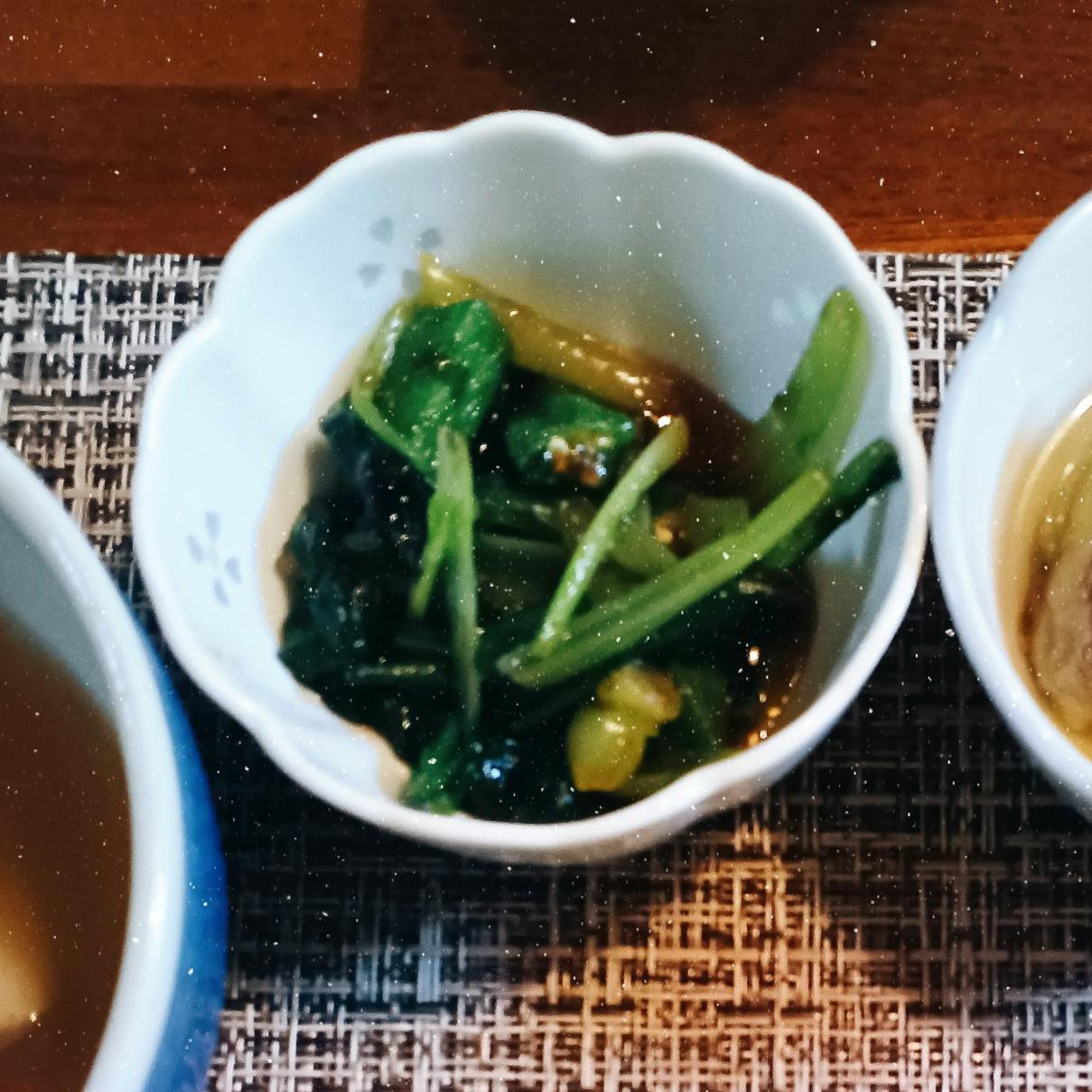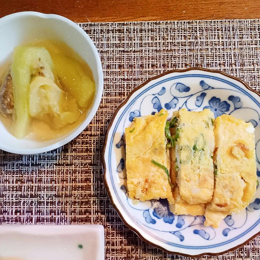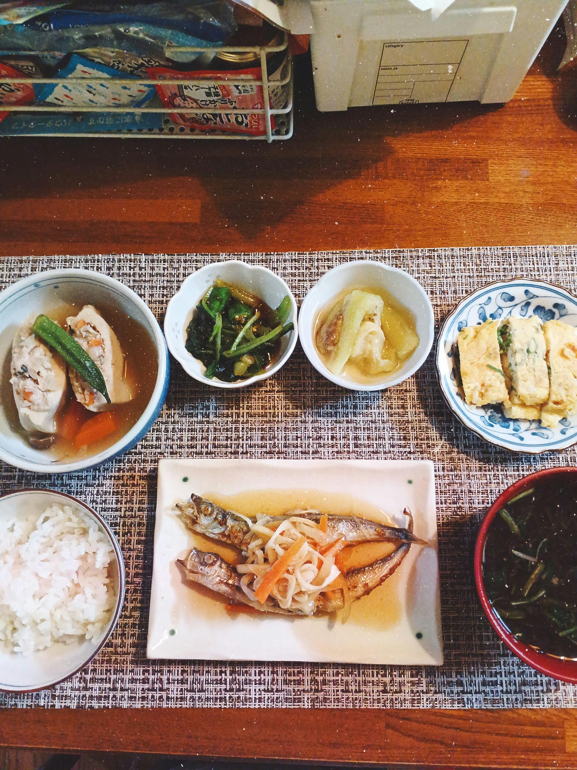 ししゃもの南蛮漬け しらすとねぎのだし巻き 茄子のお浸し 高野豆腐の肉詰め 小松菜とオクラのお浸し 味噌汁 発芽玄米1割