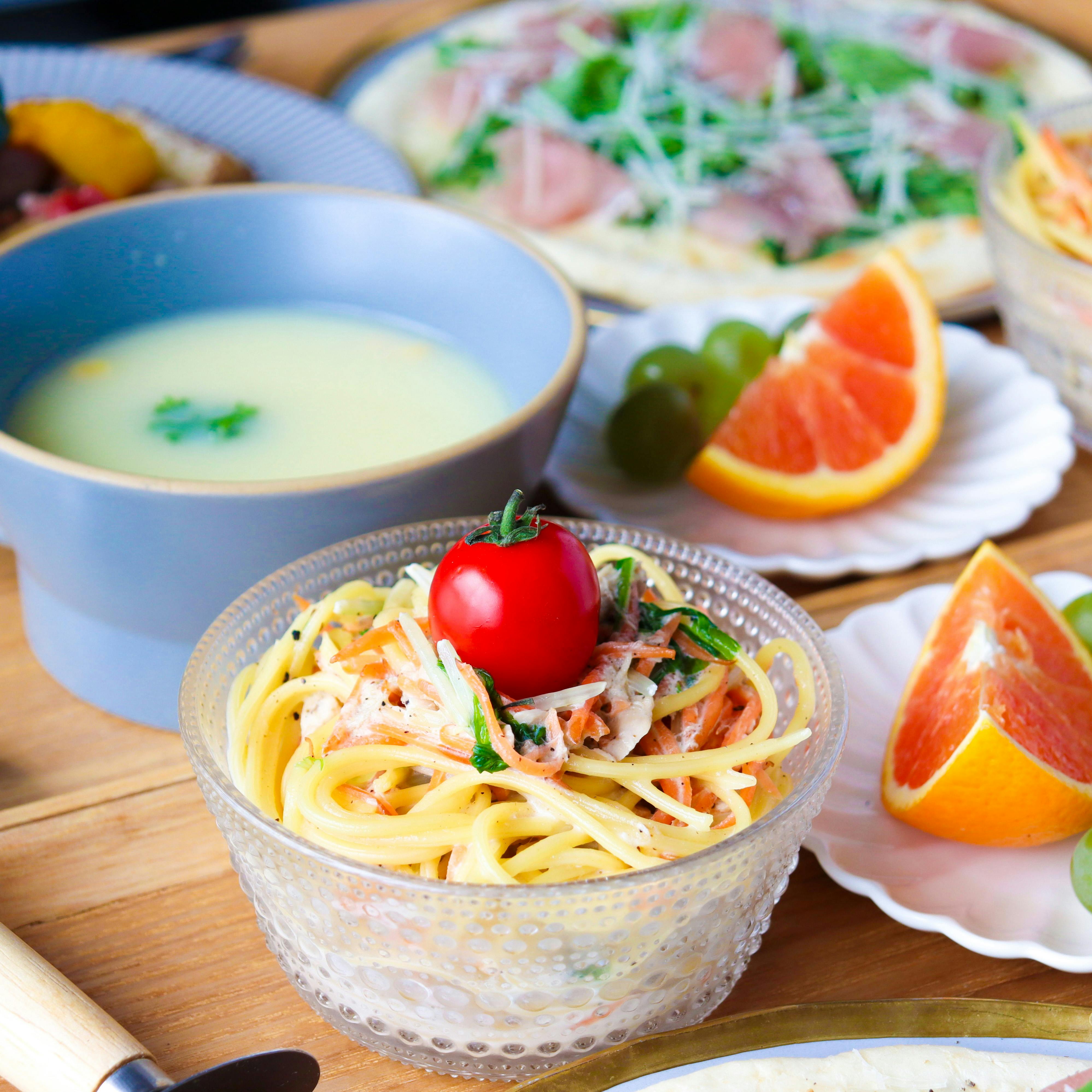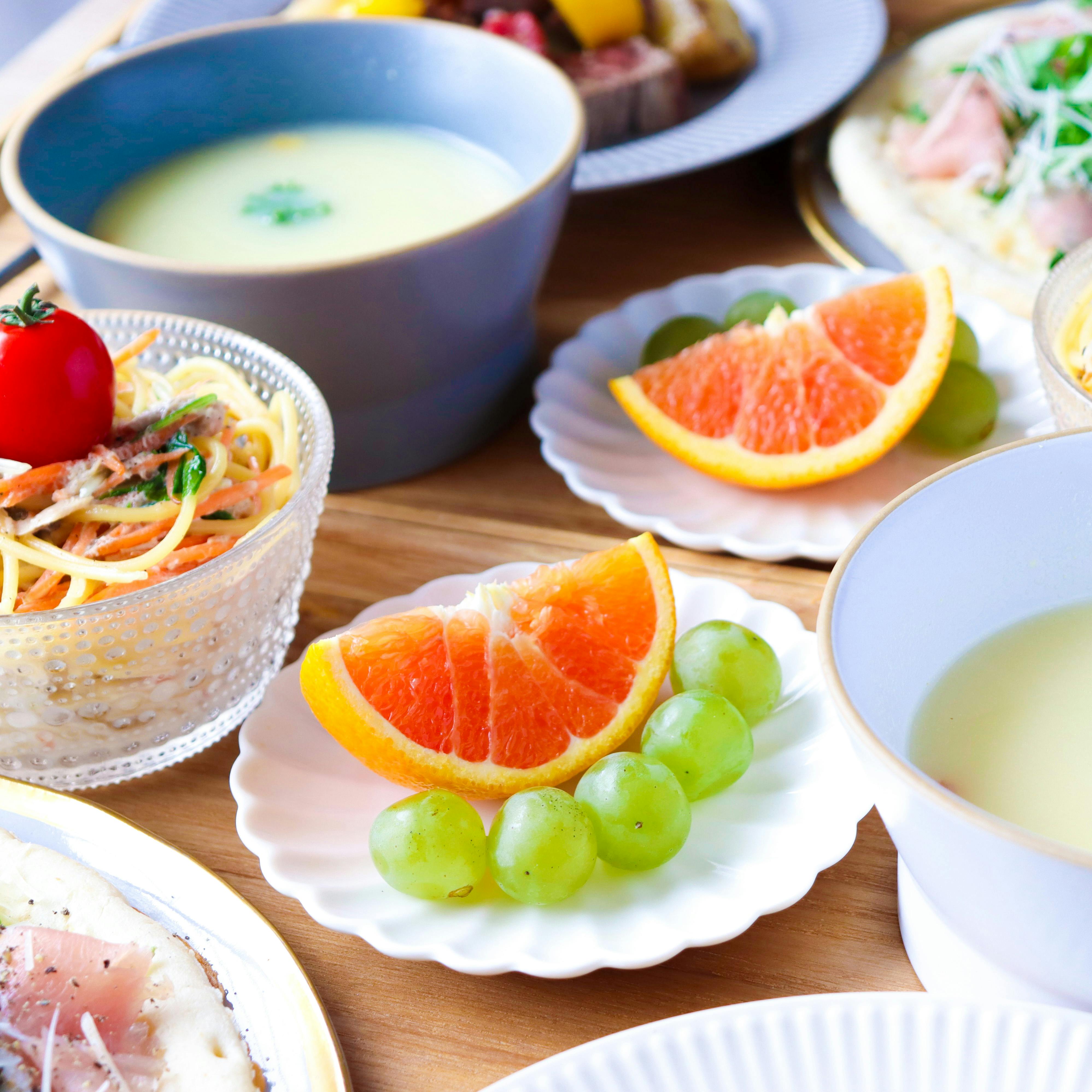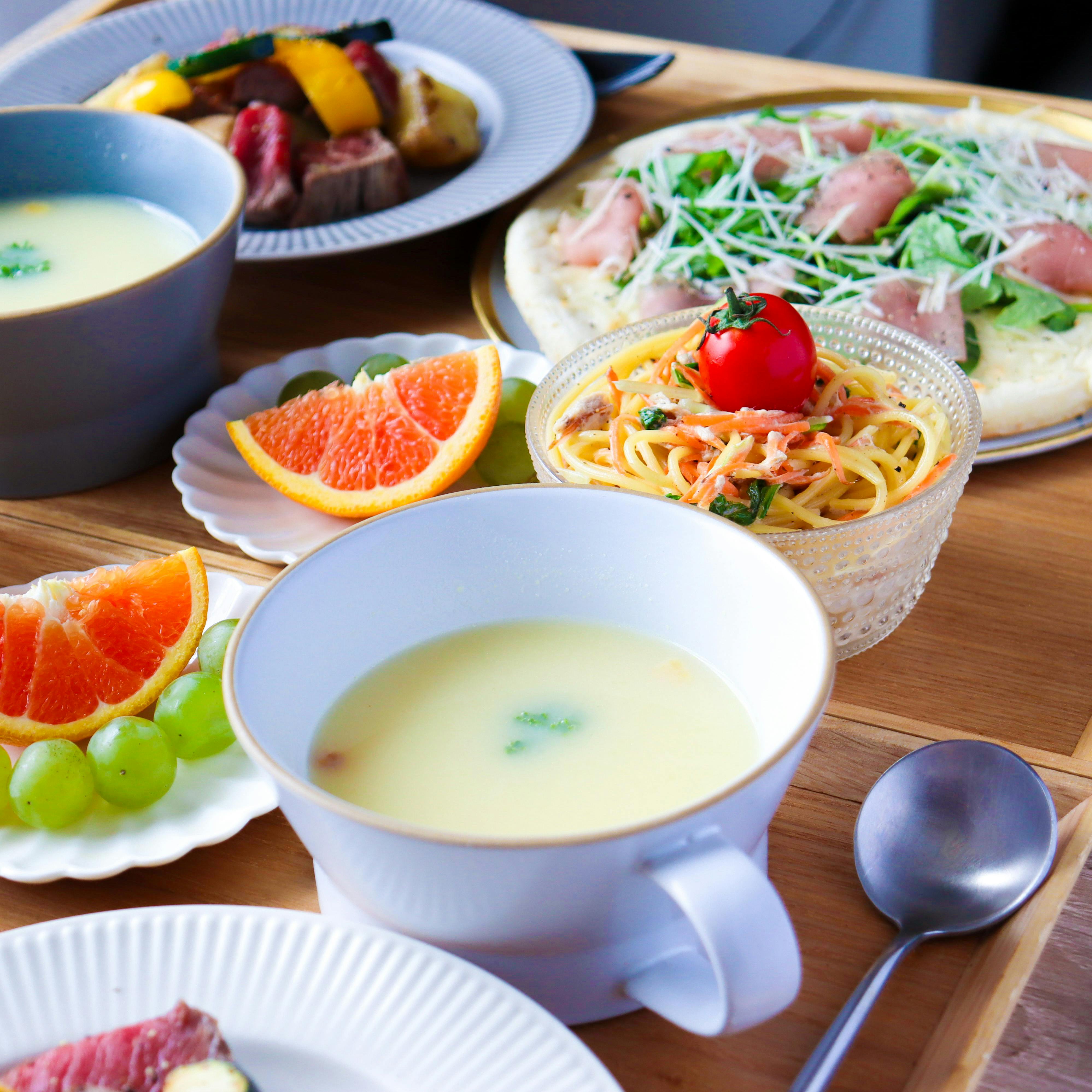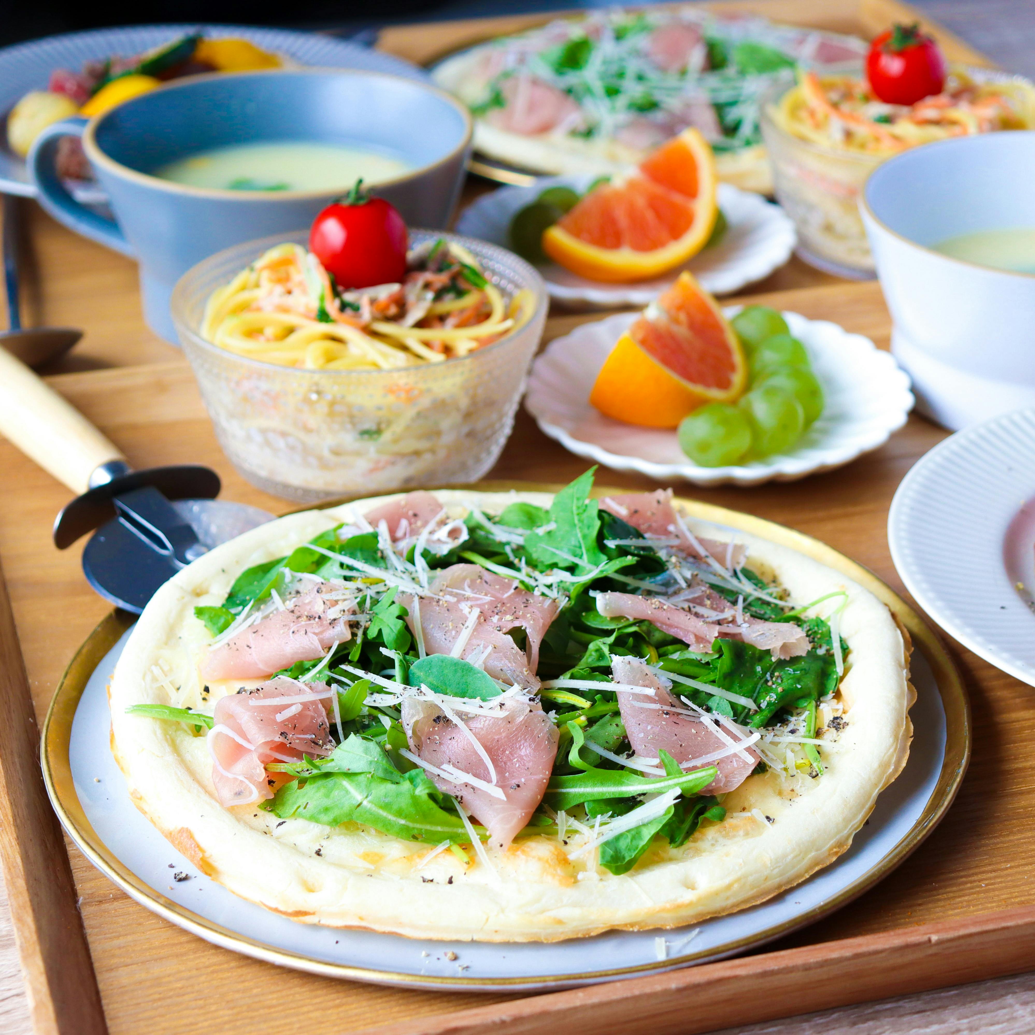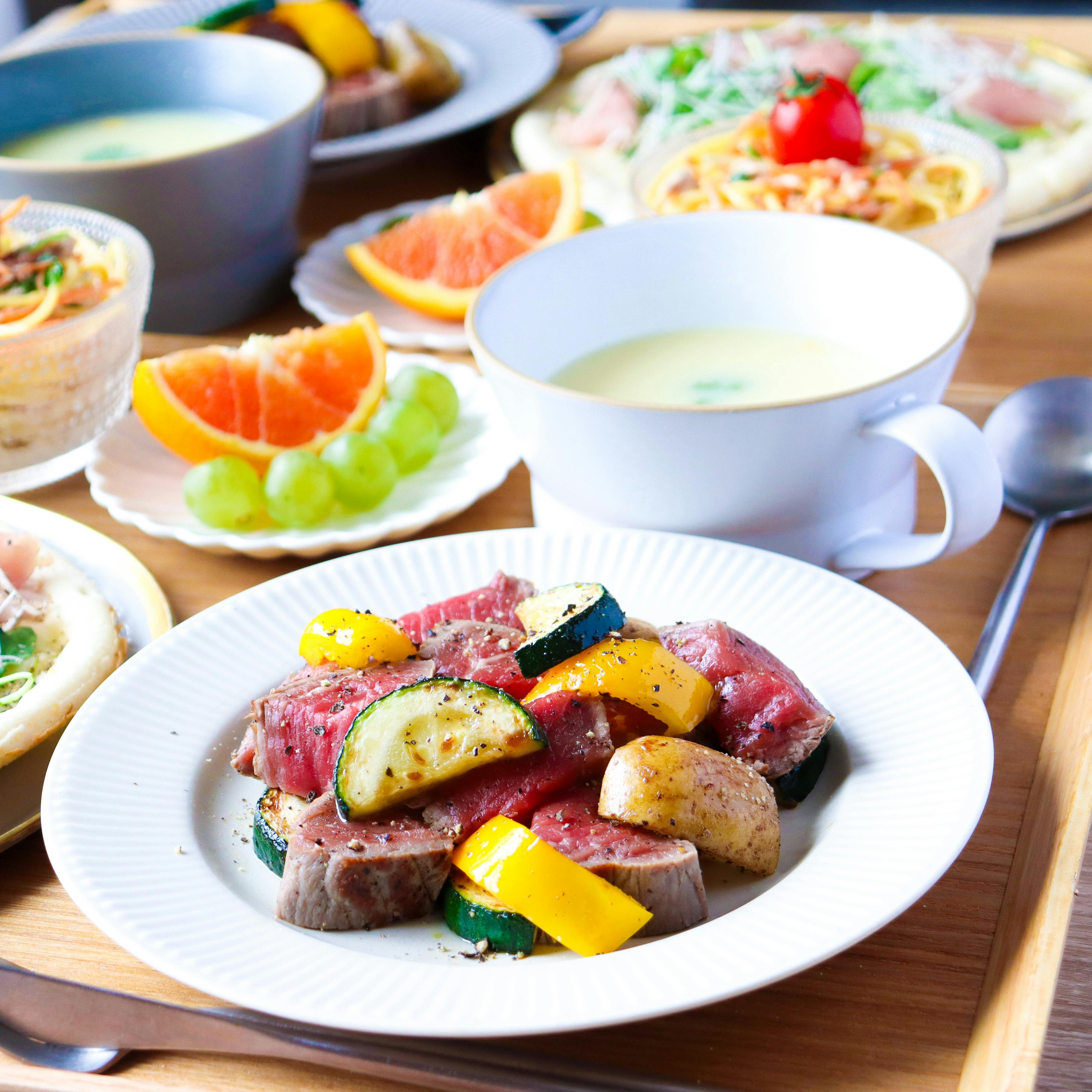ꕤ サラダピザ ꕤ ローストビーフとグリル野菜 ꕤ スパサラ ꕤ コーンスープ ꕤ フルーツ