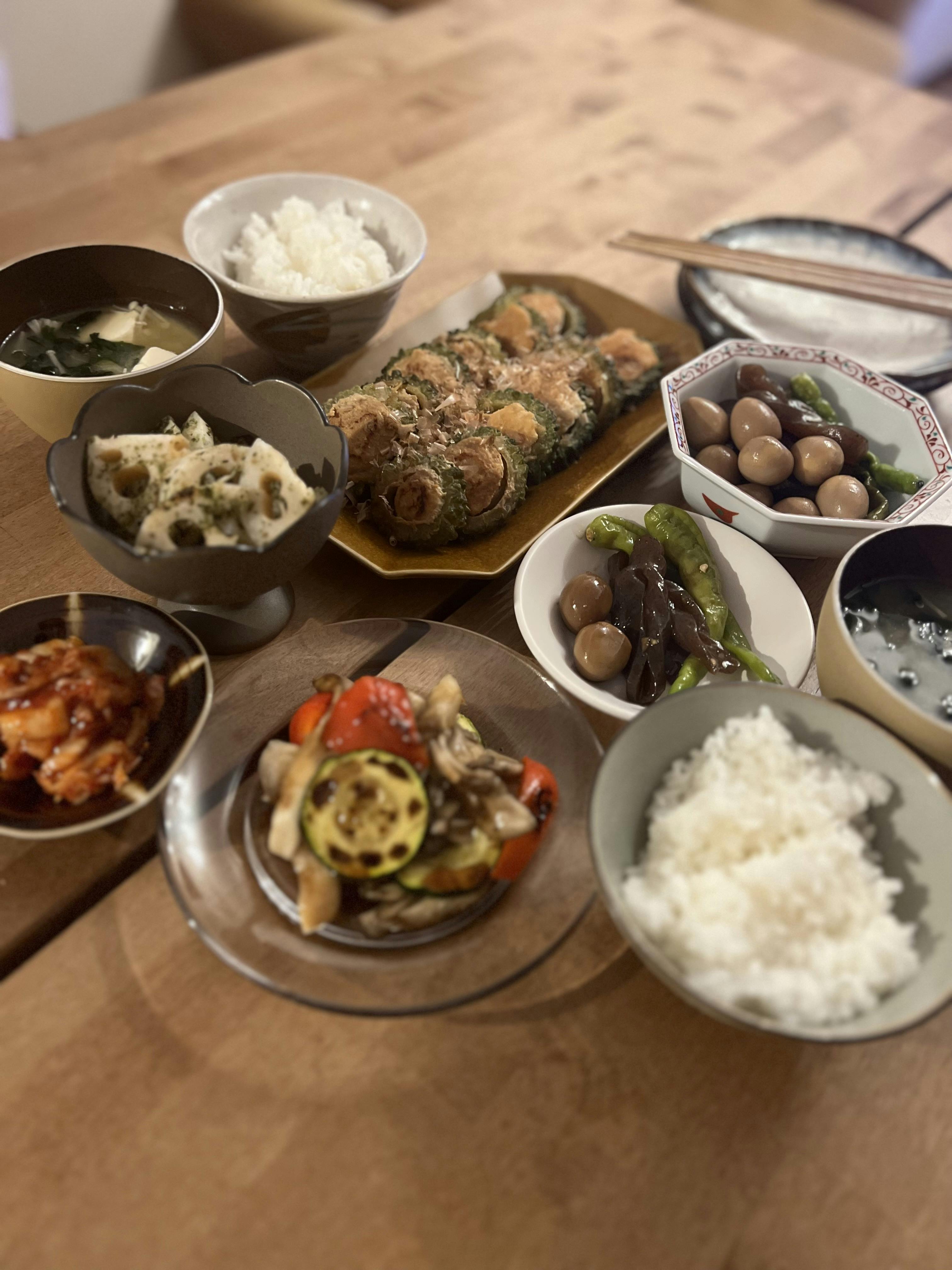 頂き物のゴーヤで肉詰め。 ウズラの醤油煮は自分の食べる分を分けて青唐辛子を入れて煮たらピリピリ辛くて、個人的には青唐辛子入れた方が美味しかったなーっ! •ゴーヤの肉詰め •ウズラの醤油煮 •レンコン青のり •グリル野菜バルサミコ酢 •キムチ