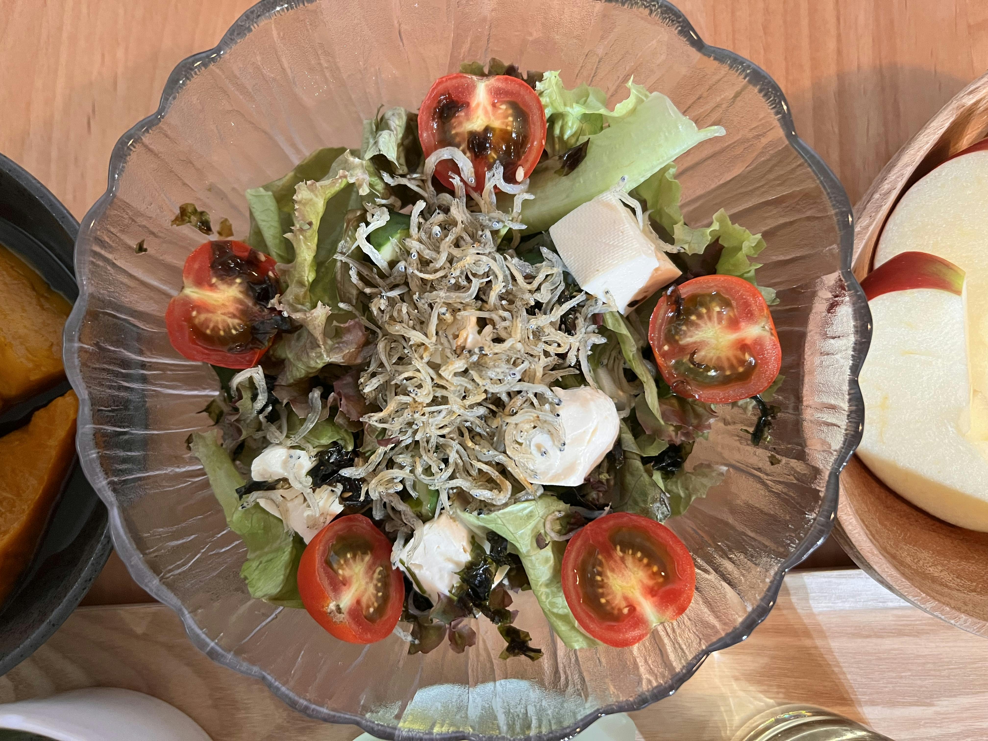 🐟🧅🥕 𖧵人参とツナの混ぜご飯 𖧵ししゃもの南蛮漬け 𖧵厚揚げとひき肉の中華スープ 𖧵カリカリしらすのお豆腐海苔サラダ 𖧵かぼちゃの煮付け 𖧵りんご 𖧵キウイ :