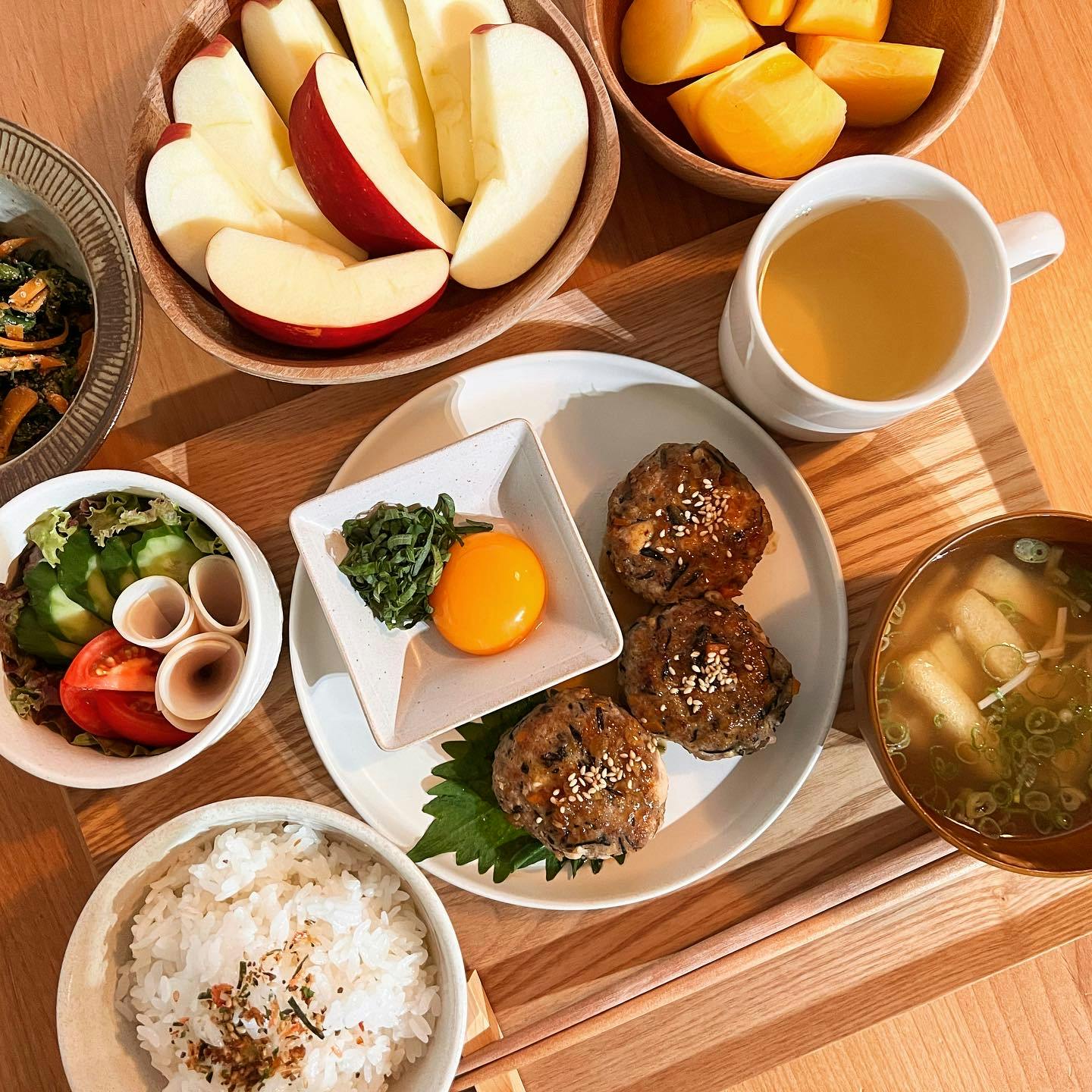 🪸🥕🧆 𖧵ひじきたっぷりお豆腐つくね 𖧵えのきあげ味噌汁 𖧵ハムサラダ 𖧵ほうれん草と人参のごま和え 𖧵りんご 𖧵柿 _________ お豆腐入れるとかさ増し&ふんわりになって美味◽️💮 ひじきも人参もたっぷり入れました🤲🏻 :