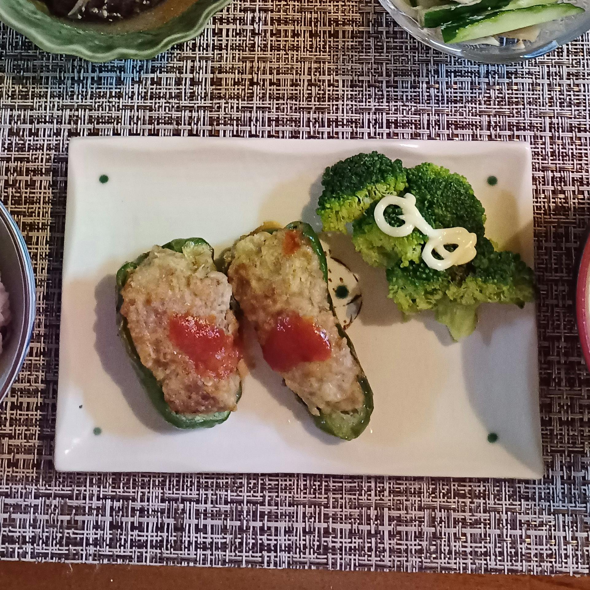 ピーマン肉詰め 茄子の味噌煮 クリームシチュー(昨日の残り) サラダ 雑穀米