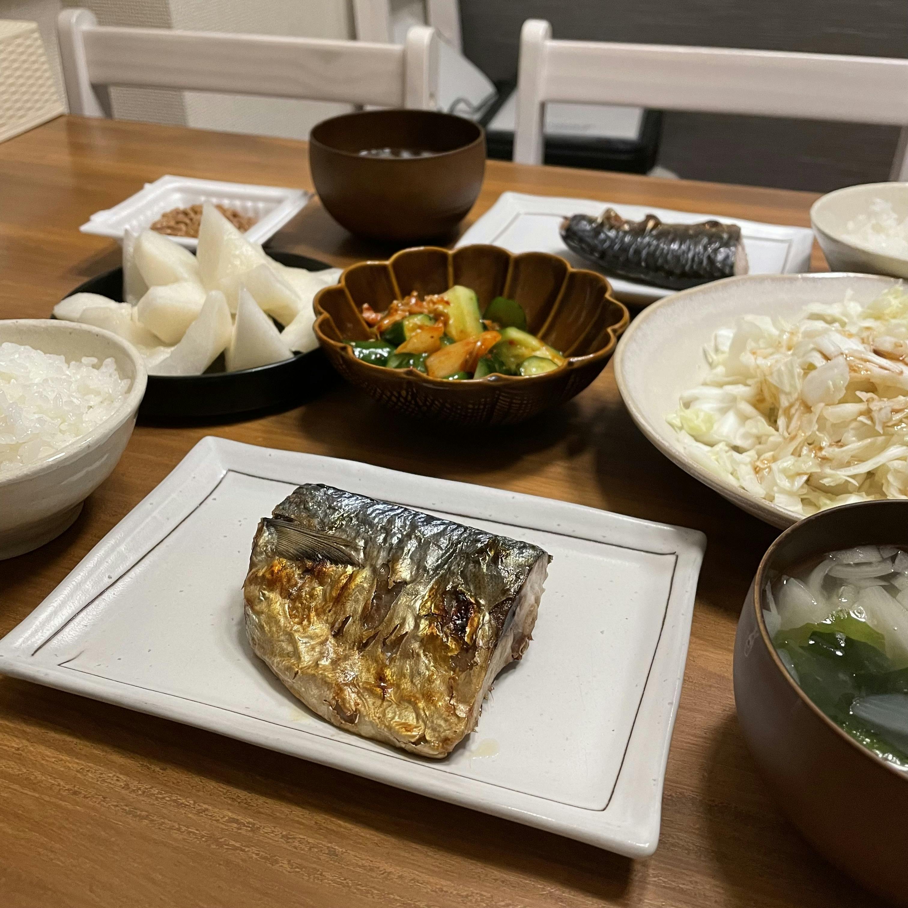 ・鯖の塩焼き ・サラダ ・お味噌汁 ・白米 ・きゅうりキムチ ・梨 ・納豆