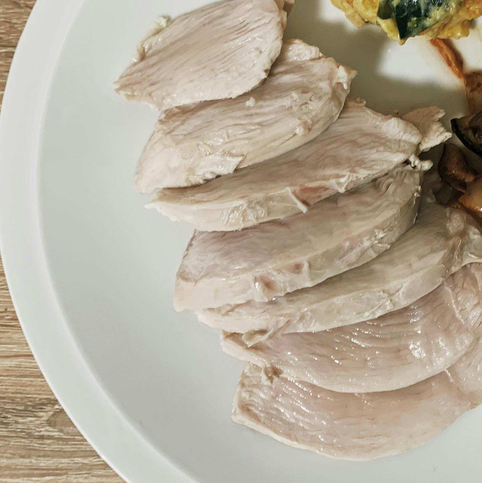 鶏ハムは沸騰後火を止めた鍋の中に塊ごと胸肉を入れ、蓋をして15-20分置くだけでできます。肉が多少赤くても食べられるパワー系ごはんです
