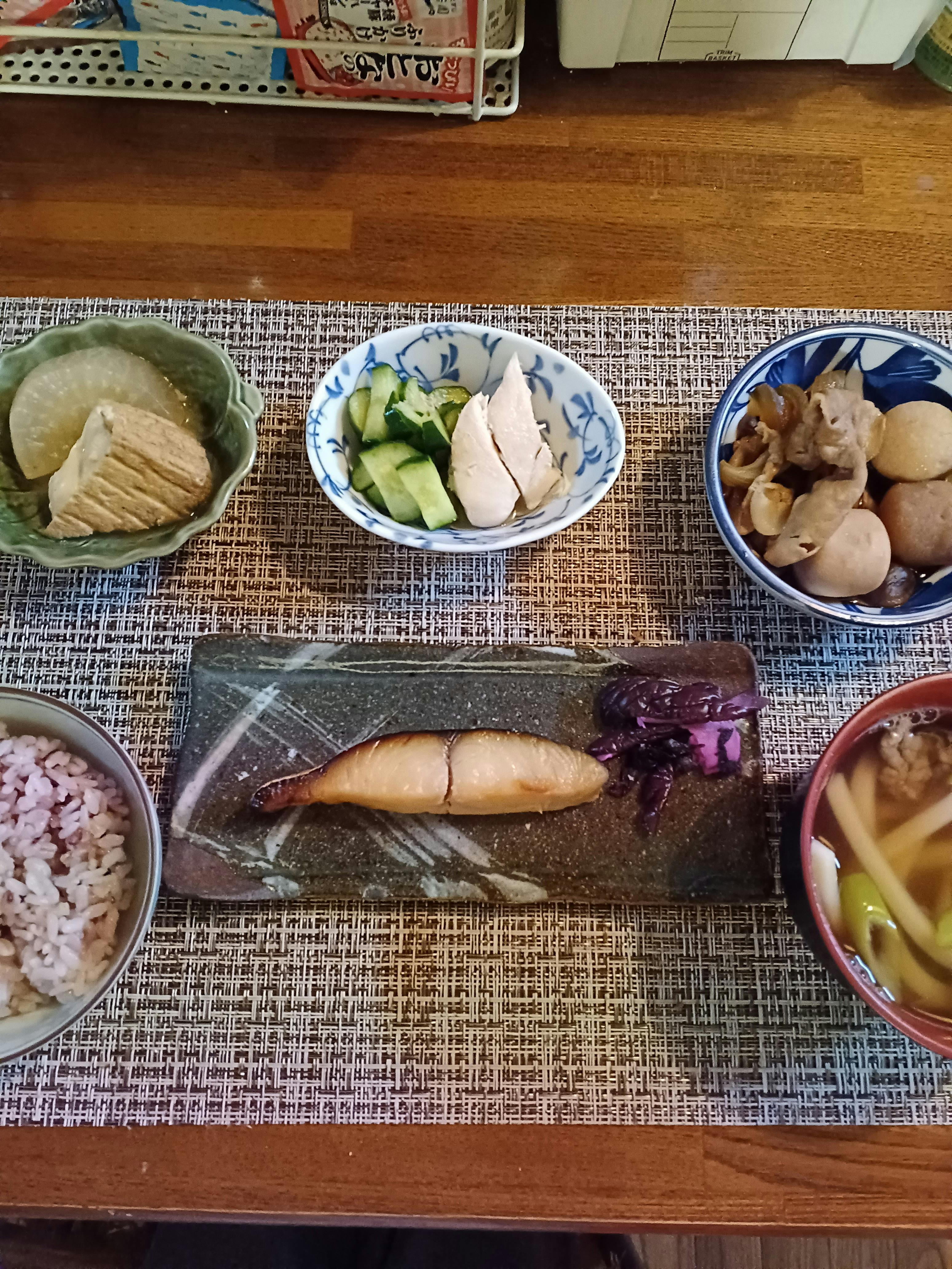さわらの味噌漬け 大根と厚揚げ煮物(作り置き) きゅうりとササミ酢の物 里芋と豚肉煮物 雑穀米 ミニうどん 里芋と豚肉の煮物は肉じゃがの里芋バージョンみたいな味つけです。作り置きにも便利🎵