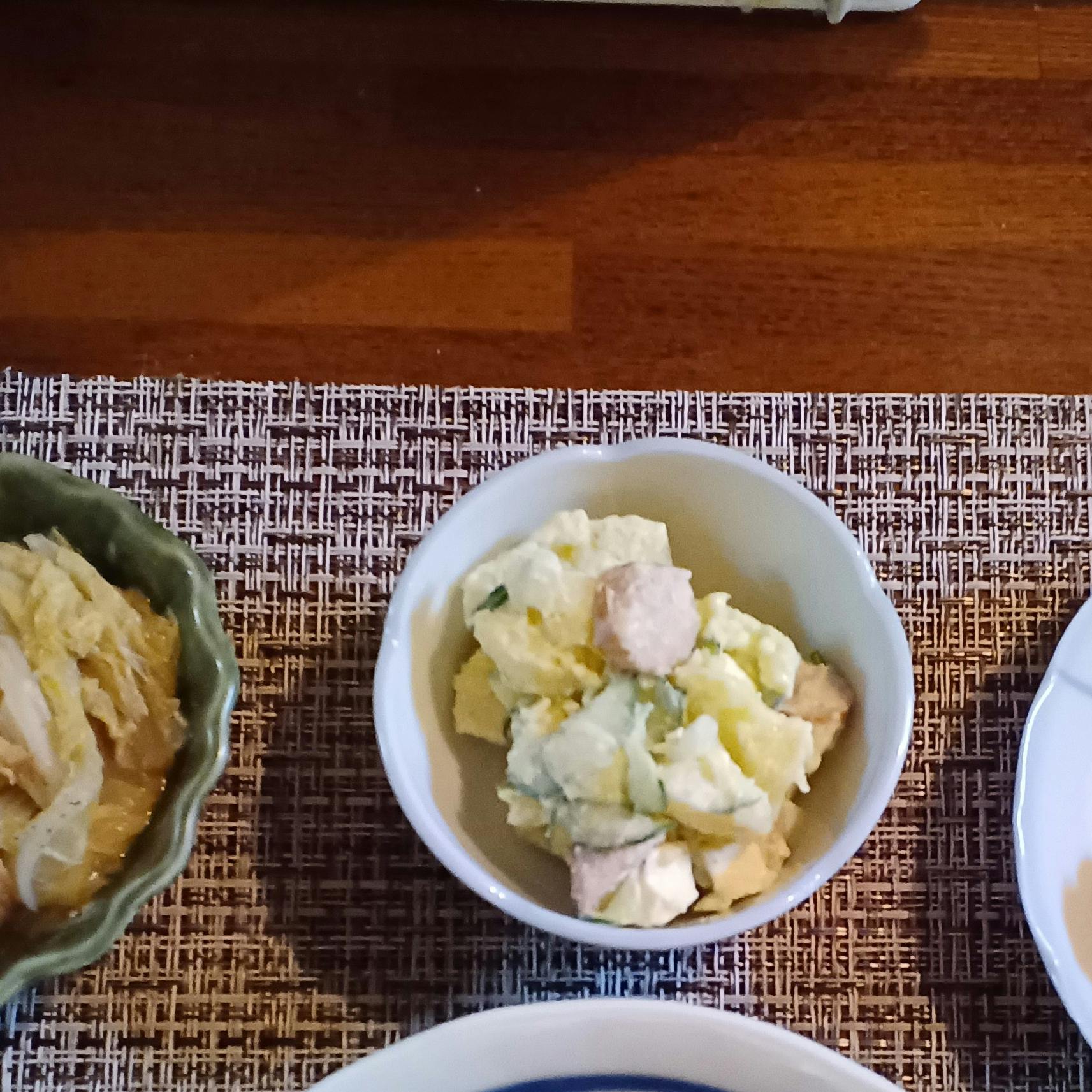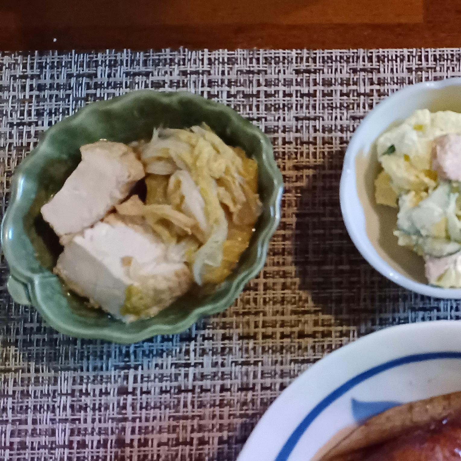 鯛のアラ炊き 手羽煮物 ポテトサラダ 白菜厚揚げ煮物 味噌汁 発芽玄米1割 立派な鯛のアラがお安かったので🎵 手羽先はお昼買ってきたお惣菜😂