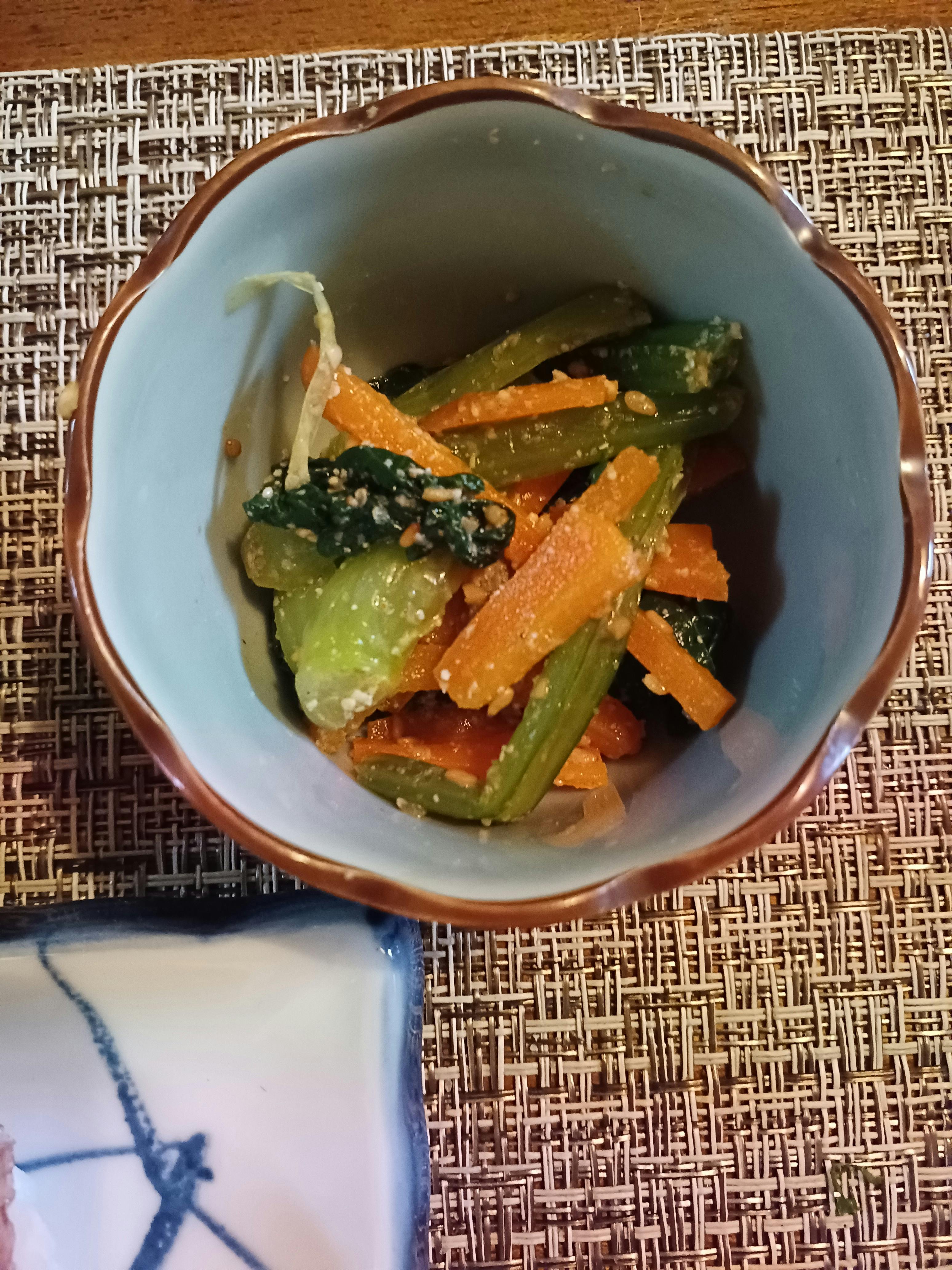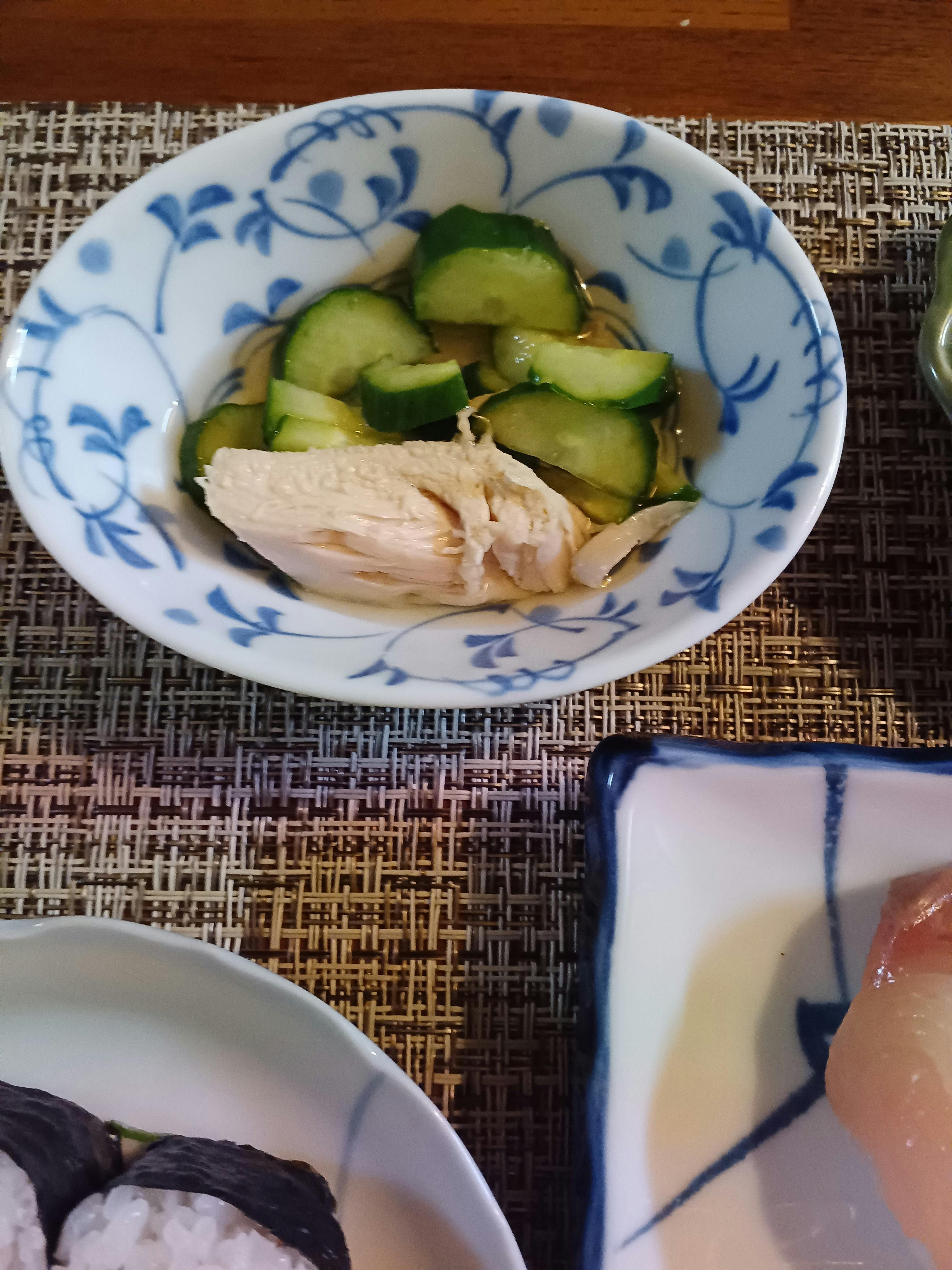 お寿司 ネギ鮪巻き 里芋豚肉煮物(作り置き) きゅうりとササミ酢の物 小松菜と人参ごま和え お味噌汁 今日は忙しくて買ってきたお寿司の日