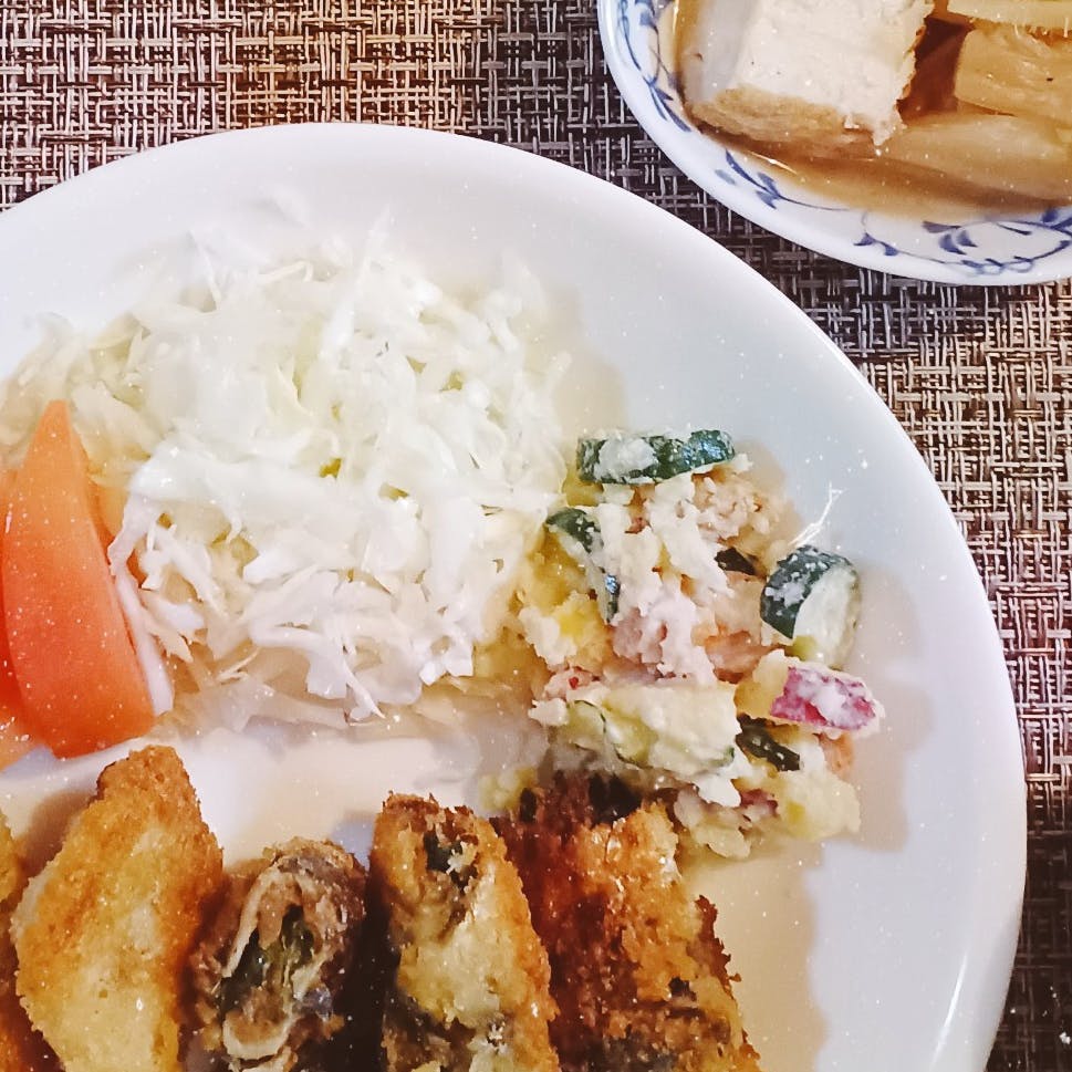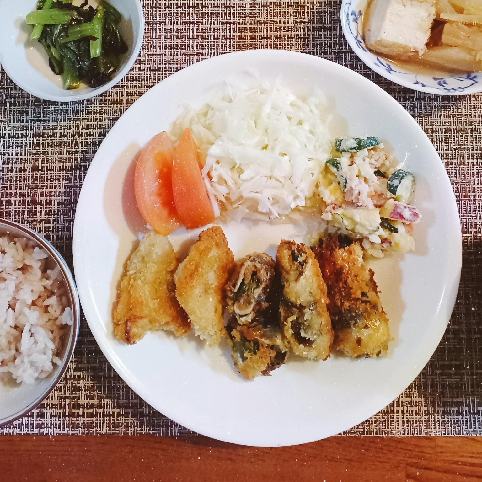 イワシ梅しそ巻き&チキンカツ ポテサラ サラダ 小松菜塩昆布和え 白菜と厚揚げ煮物 雑穀米 味噌汁 揚げ物食べたい~欲でイワシと少し残っていた鶏胸肉をフライに😊