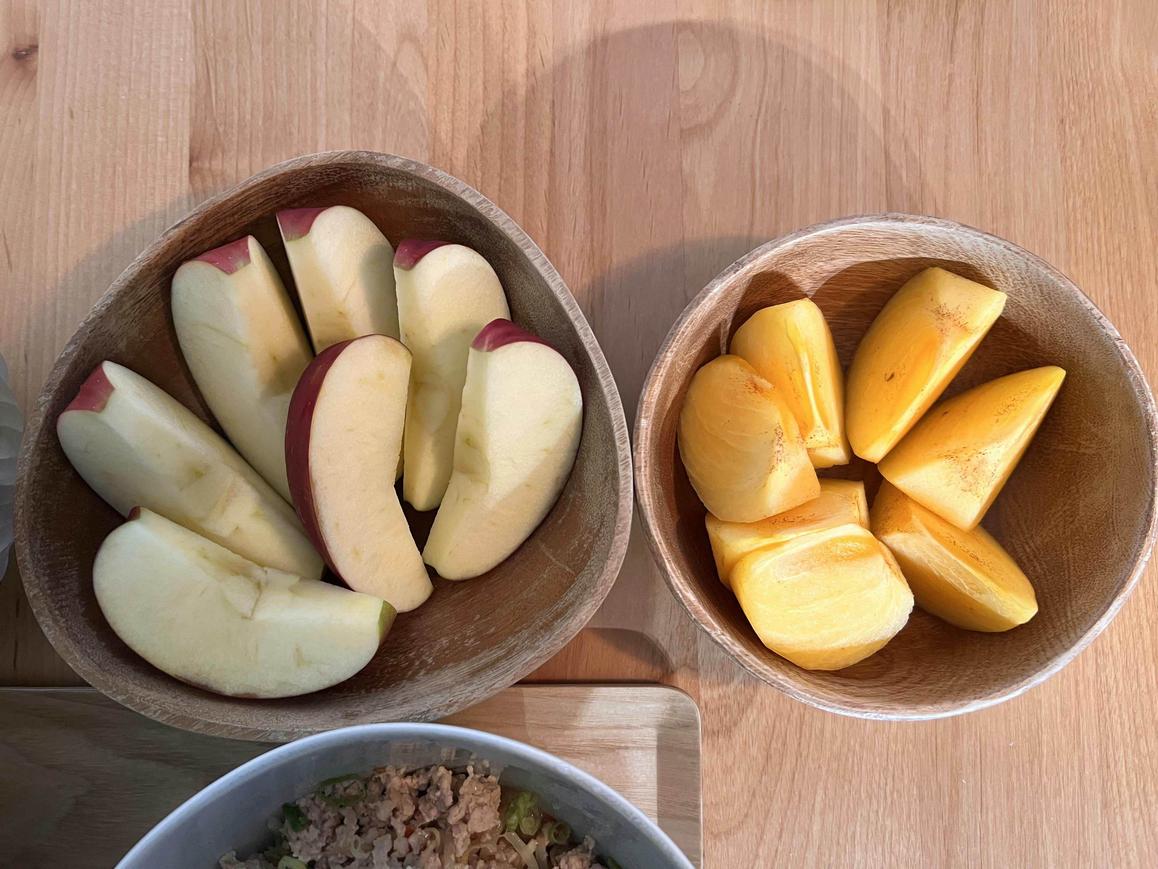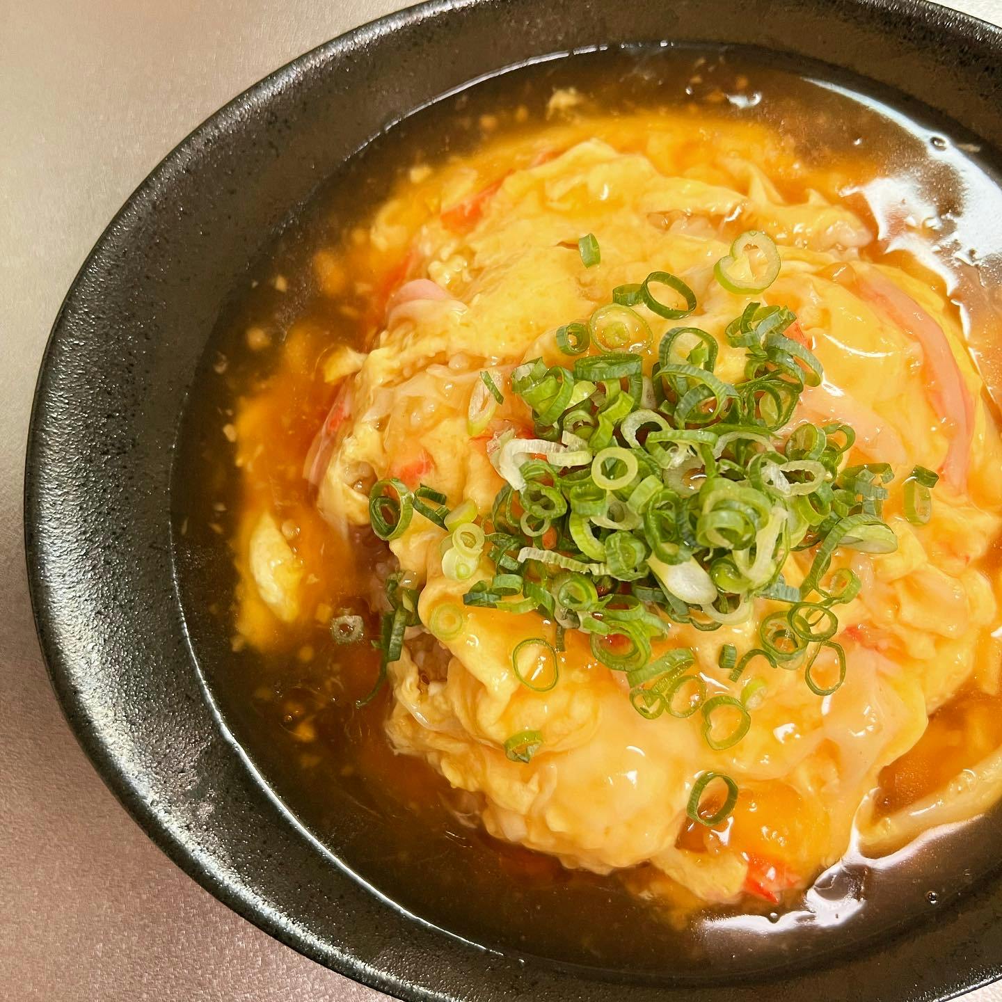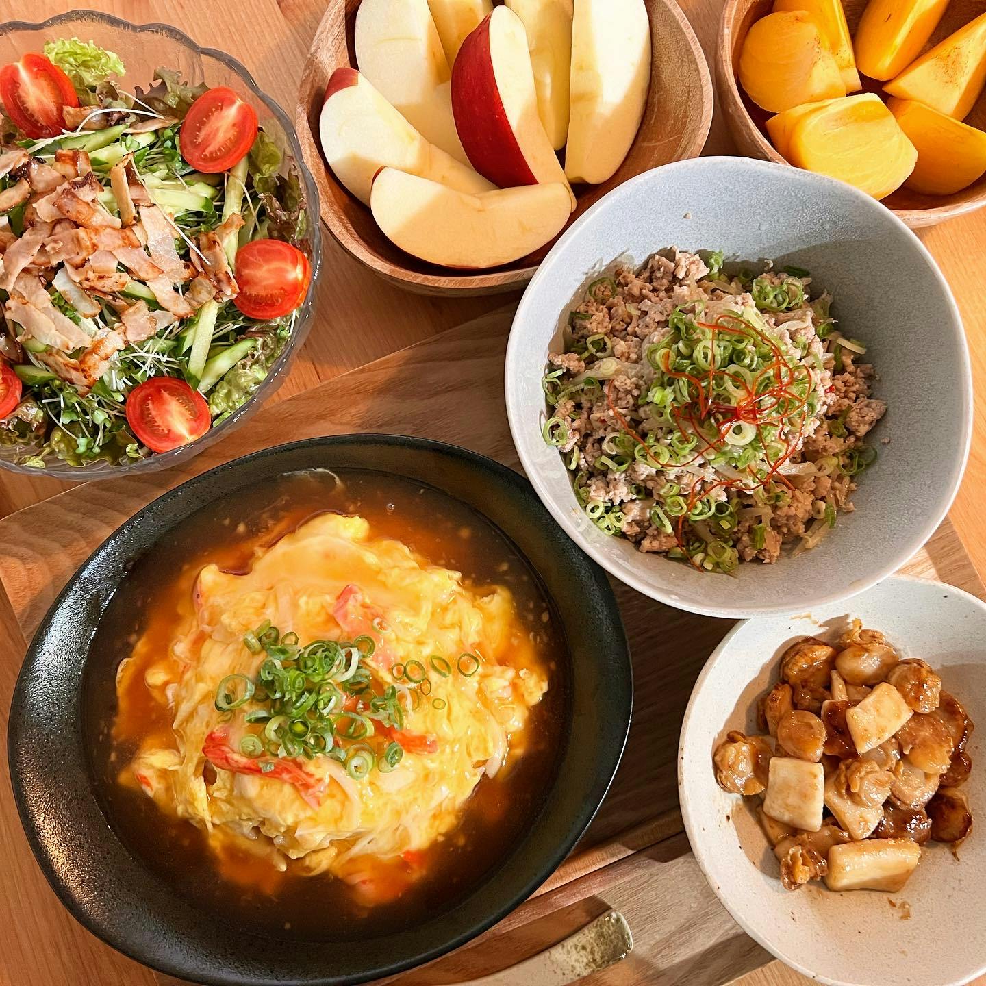 🥚🦀🇨🇳 𖧵ふわとろ天津飯 𖧵ベーコンとスプラウトのサラダ 𖧵いかとほたてのバター醤油焼き 𖧵麻婆もやし 𖧵りんご 𖧵柿 :