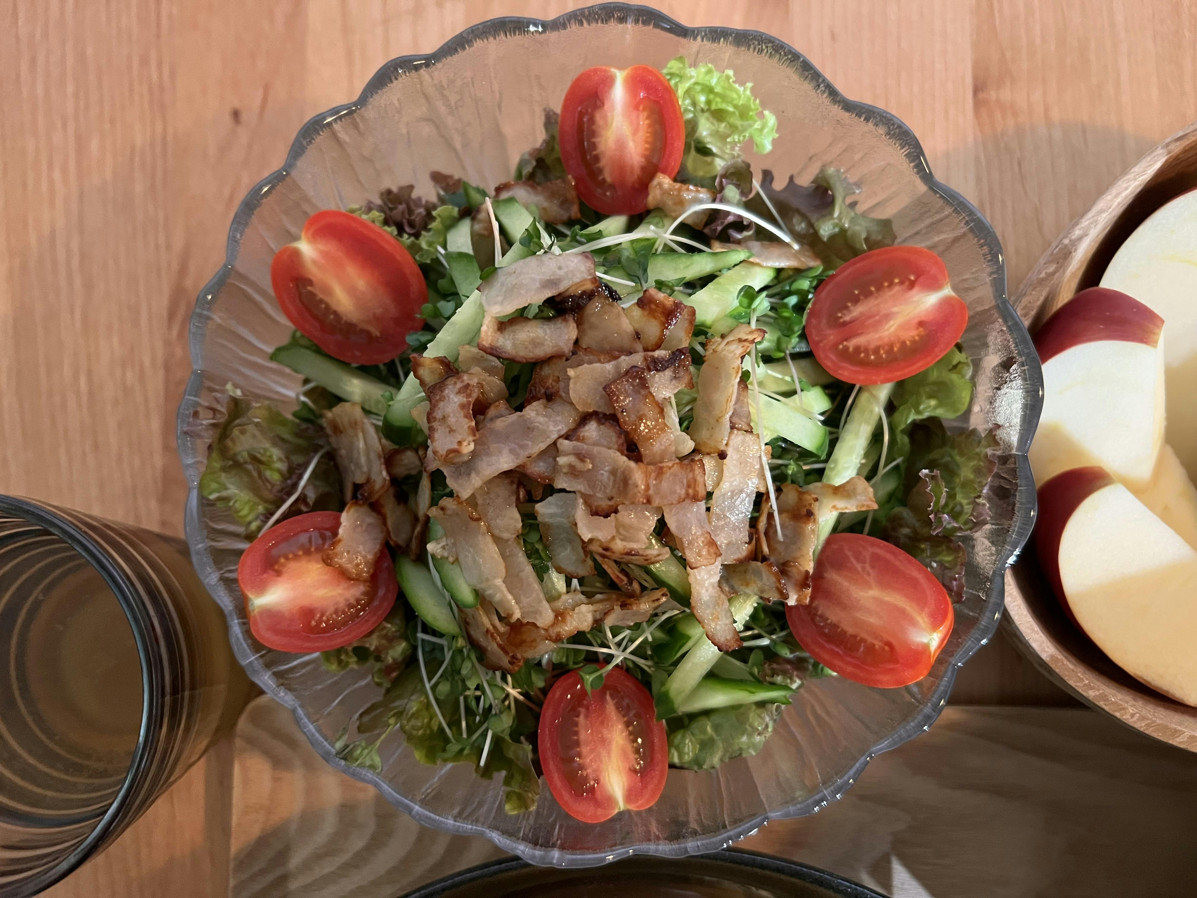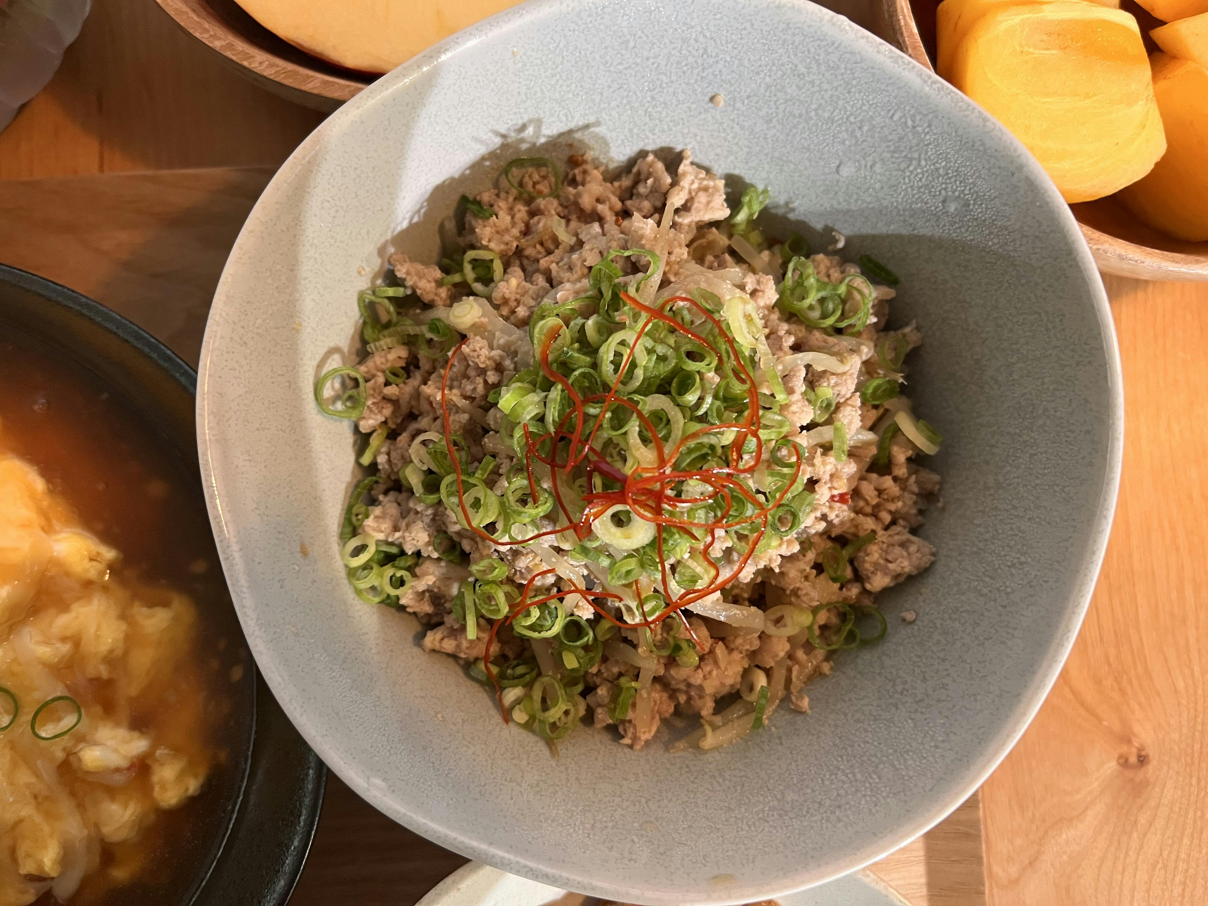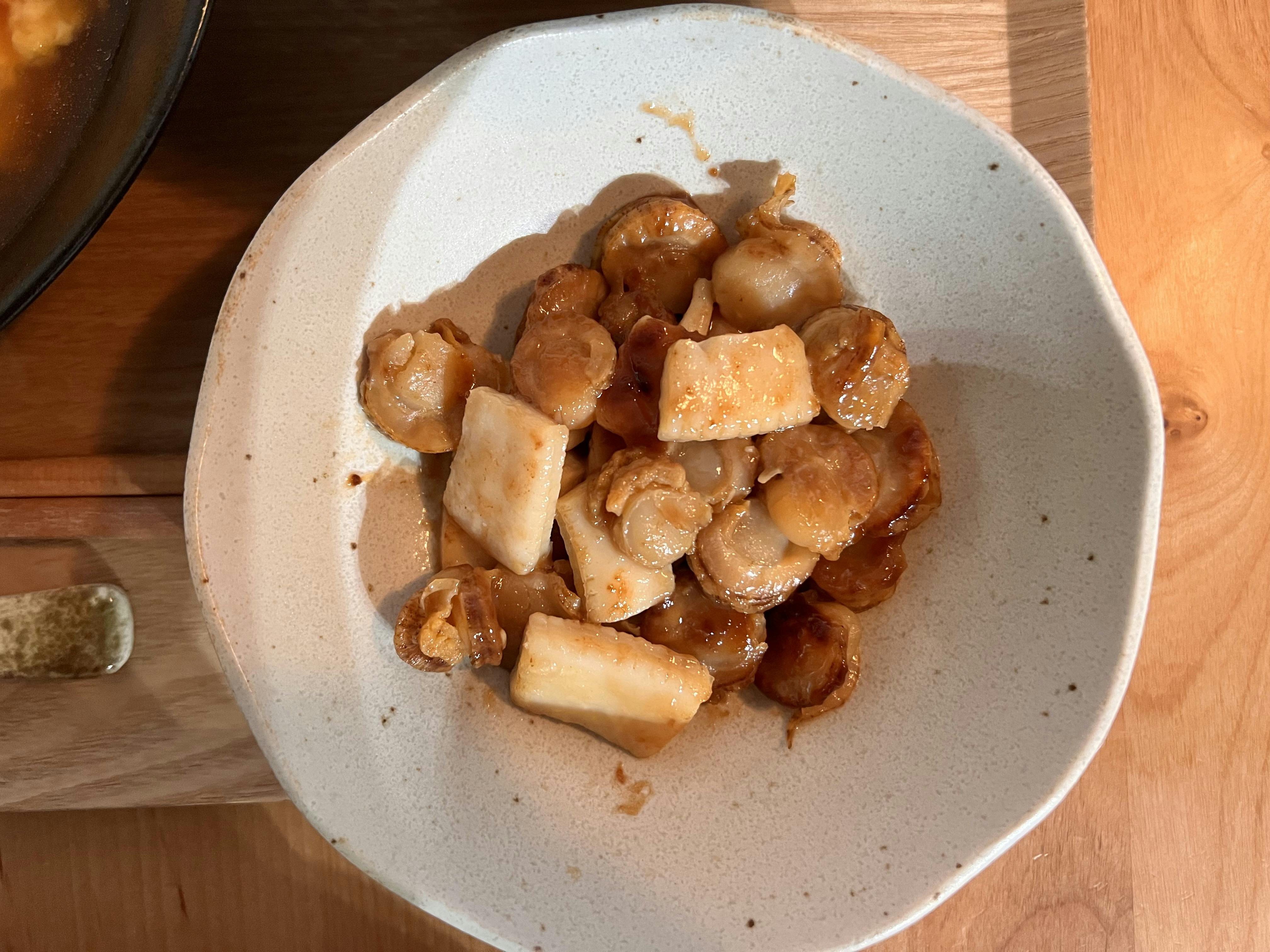 🥚🦀🇨🇳 𖧵ふわとろ天津飯 𖧵ベーコンとスプラウトのサラダ 𖧵いかとほたてのバター醤油焼き 𖧵麻婆もやし 𖧵りんご 𖧵柿 :