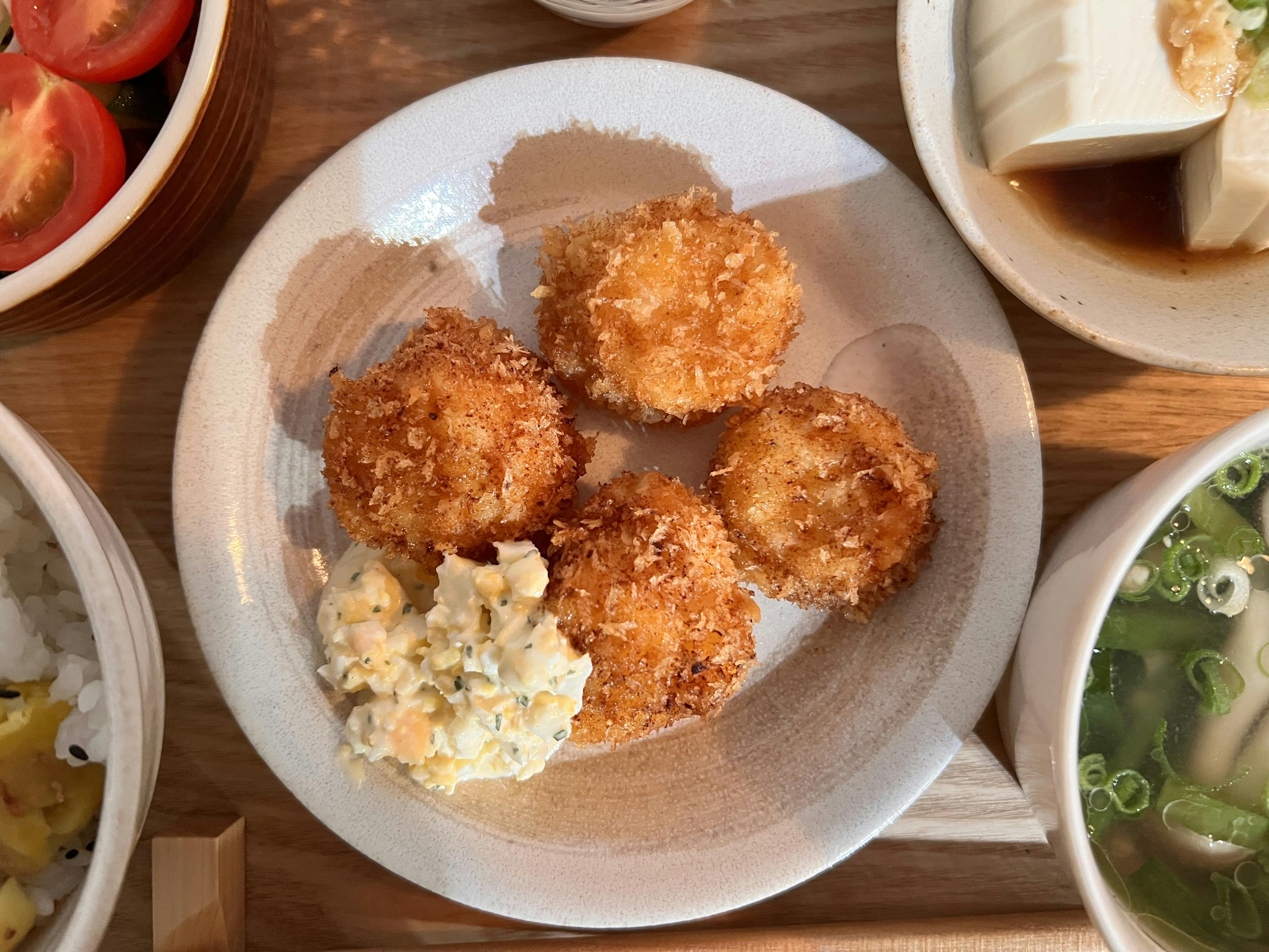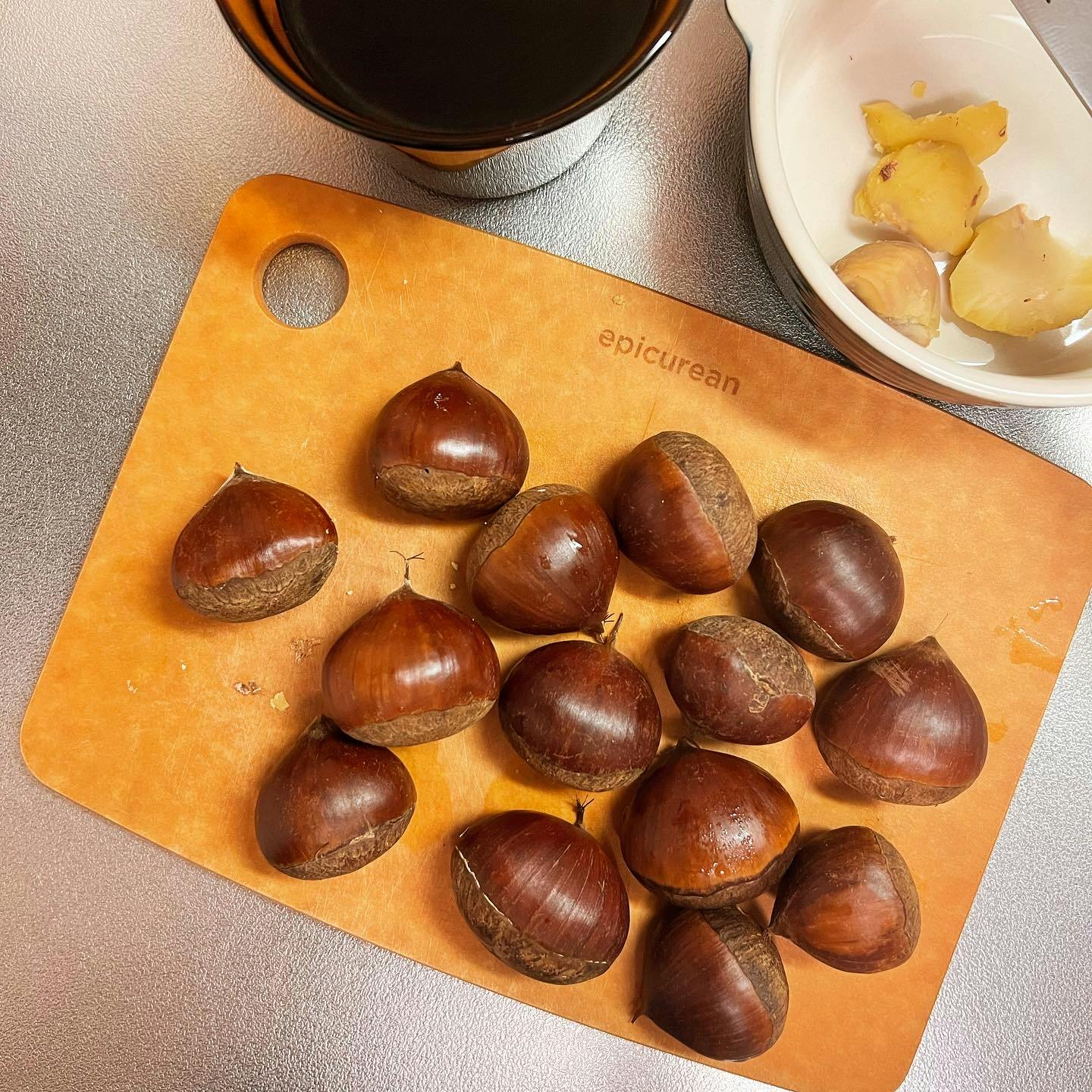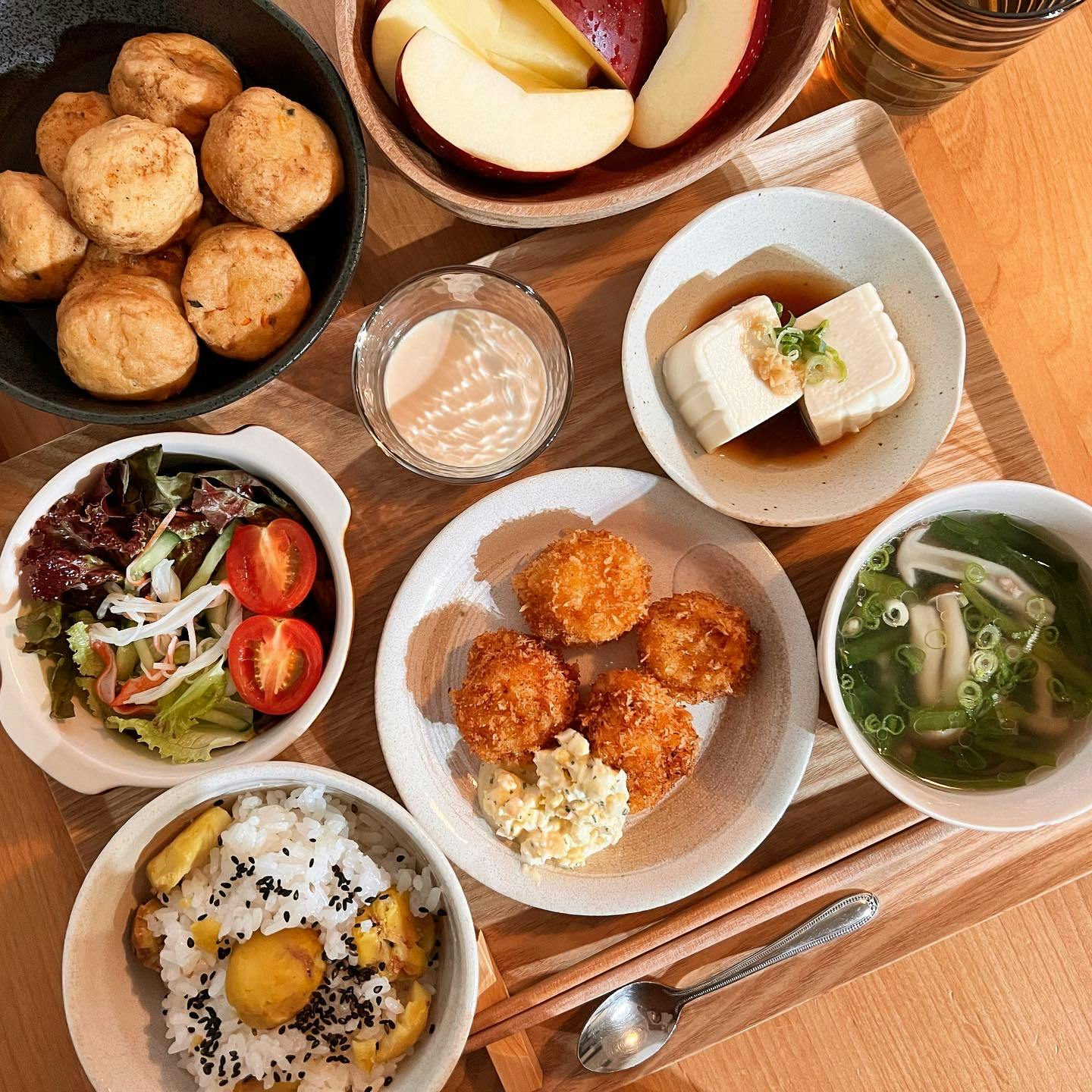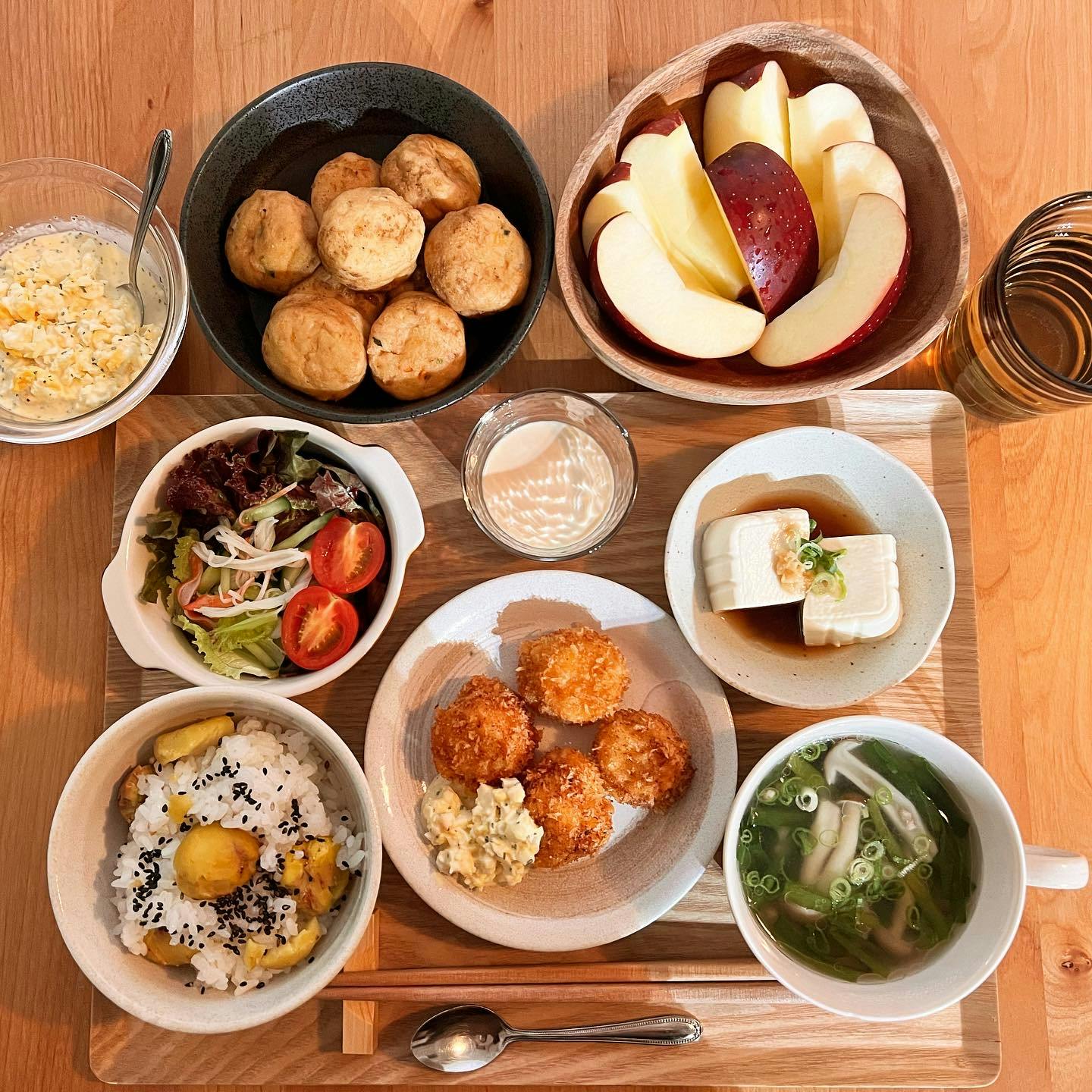 🌰🍚🐚 𖧵栗ごはん 𖧵帆立フライ・タルタルソース添え 𖧵しめじとニラのひき肉スープ 𖧵レタスとカニカマのマヨポンサラダ 𖧵冷奴 𖧵6種野菜のがんもの含め煮 𖧵りんご _________ 頂き物の「 栗 と 帆立 」を使って🧑🏻🍳💫 帆立は以前、刺身でいただいたので 今回はフライにしました🐚🌟 栗はまだたくさんあるので 洋食とスイーツに使おうかな〜、と考え中です🌰💭 :