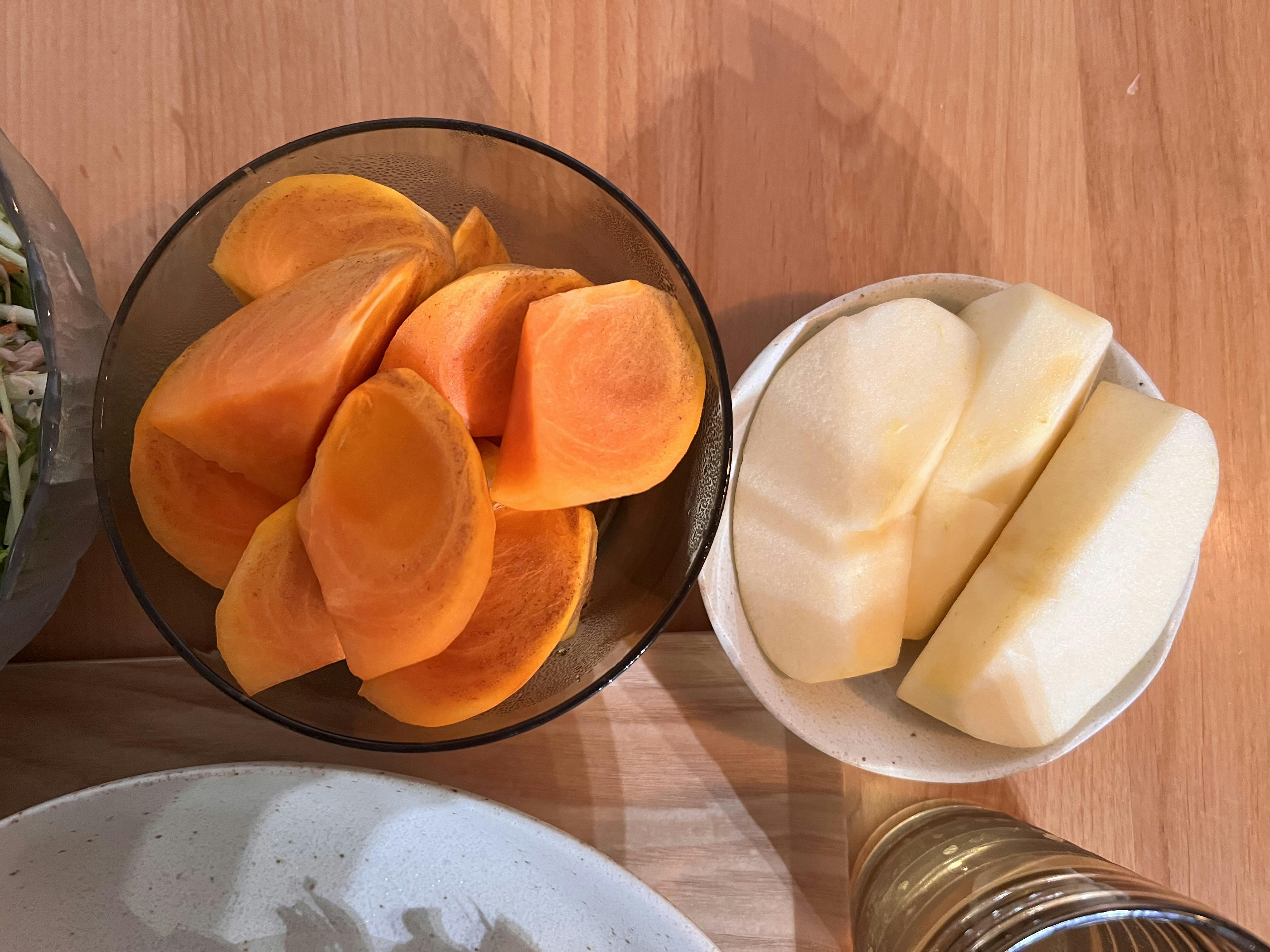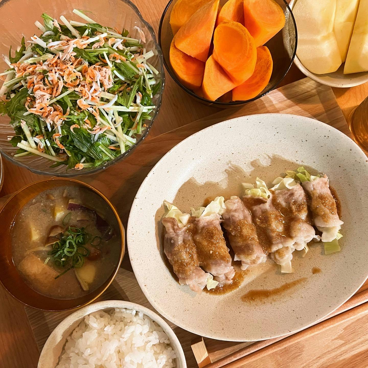 🐖🥬 𖧵豚ロースのキャベツ巻き 𖧵さつまいもとなめこの味噌汁 𖧵水菜とオキアミのツナサラダ 𖧵りんご 𖧵柿 _________ 今日はいつもより一品少ないので寂しい感じ .. でも、なんとなくで作った「水菜のサラダ」がヒット😍 ツナ・オキアミ(桜エビみたいなの)・ちりめん入りで 水菜1袋使ったのにあっという間に無くなりそうでした💦 これはサラダレパートリーに追加確定です🫱🏻🫲🏼🥗💮 :