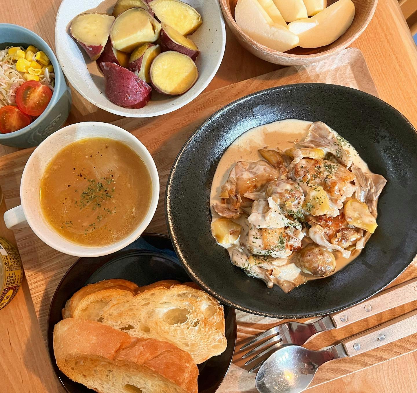 🥖🌰🐓 𖧵フランスパン 𖧵栗とチキンのクリーム煮 𖧵オニオンスープ 𖧵千切りキャベツとツナのサラダ 𖧵炊飯器deさつまいものほくほく炊き 𖧵りんご _________ \ 🌰頂き物の 栗 パート② / 今日は @kurashiru さんの「 栗とチキンのクリーム煮 」🌟 少し前に家政婦 志麻さんもTVで作られていて 私も今回挑戦してみました✊🏻 栗料理ってあまり思い浮かばないけど、クリーム煮って斬新! 栗の甘さも引き立つし、おしゃれな一品になりました✨ :