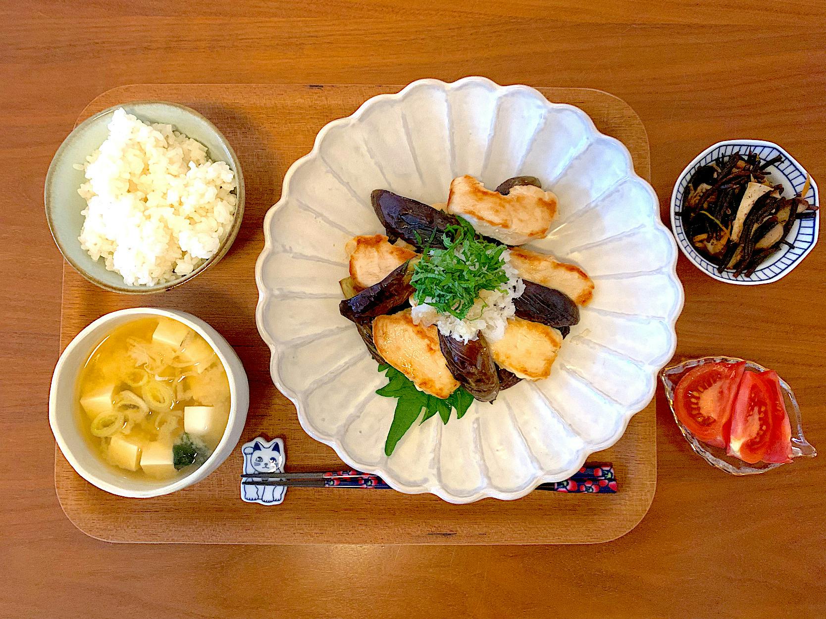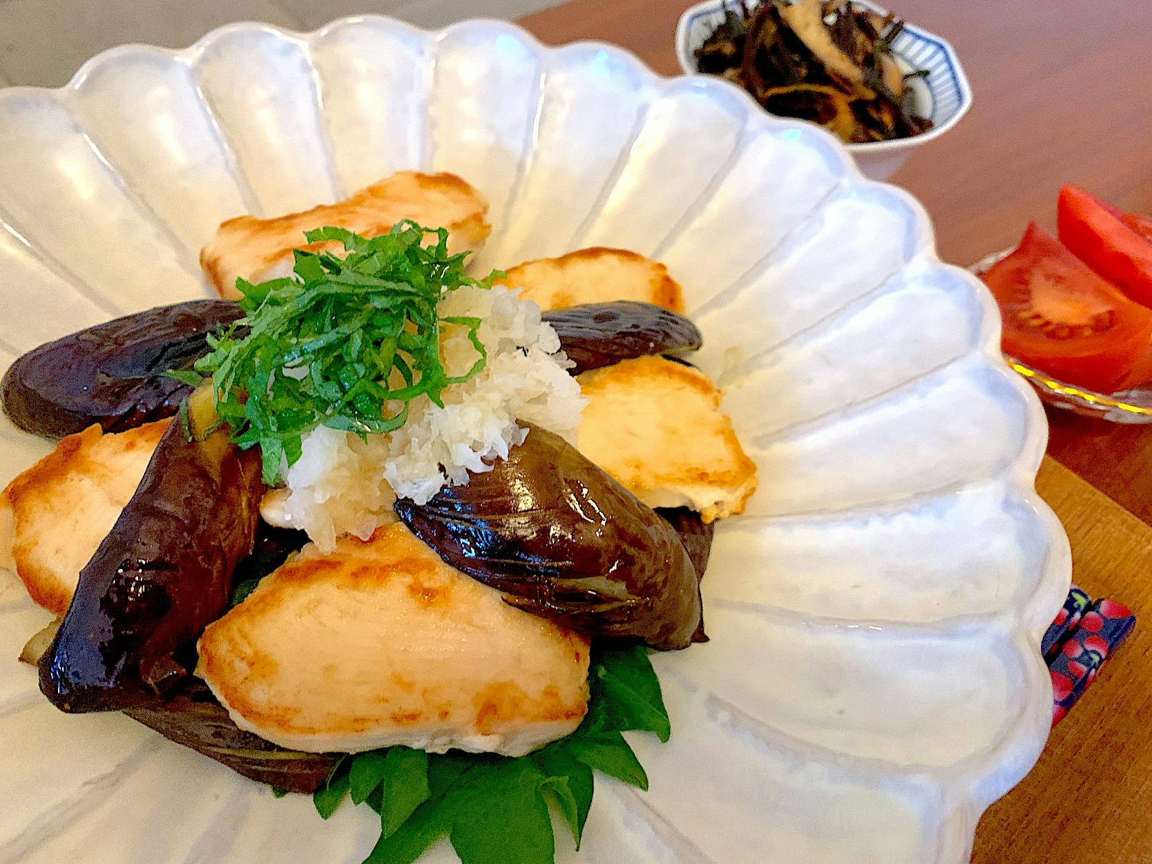 下味を付けた鶏むね肉と茄子をごま油で焼いて、大根おろしと青紫蘇をのせてポン酢をかけました☺️鶏むね肉の下味にマヨネーズを入れるとシットリ柔らかく焼き上がります✨(今回の下味はマヨネーズ、酒、塩、にんにく)。茄子は油多めで焼くとトロッとして美味しいですね💕