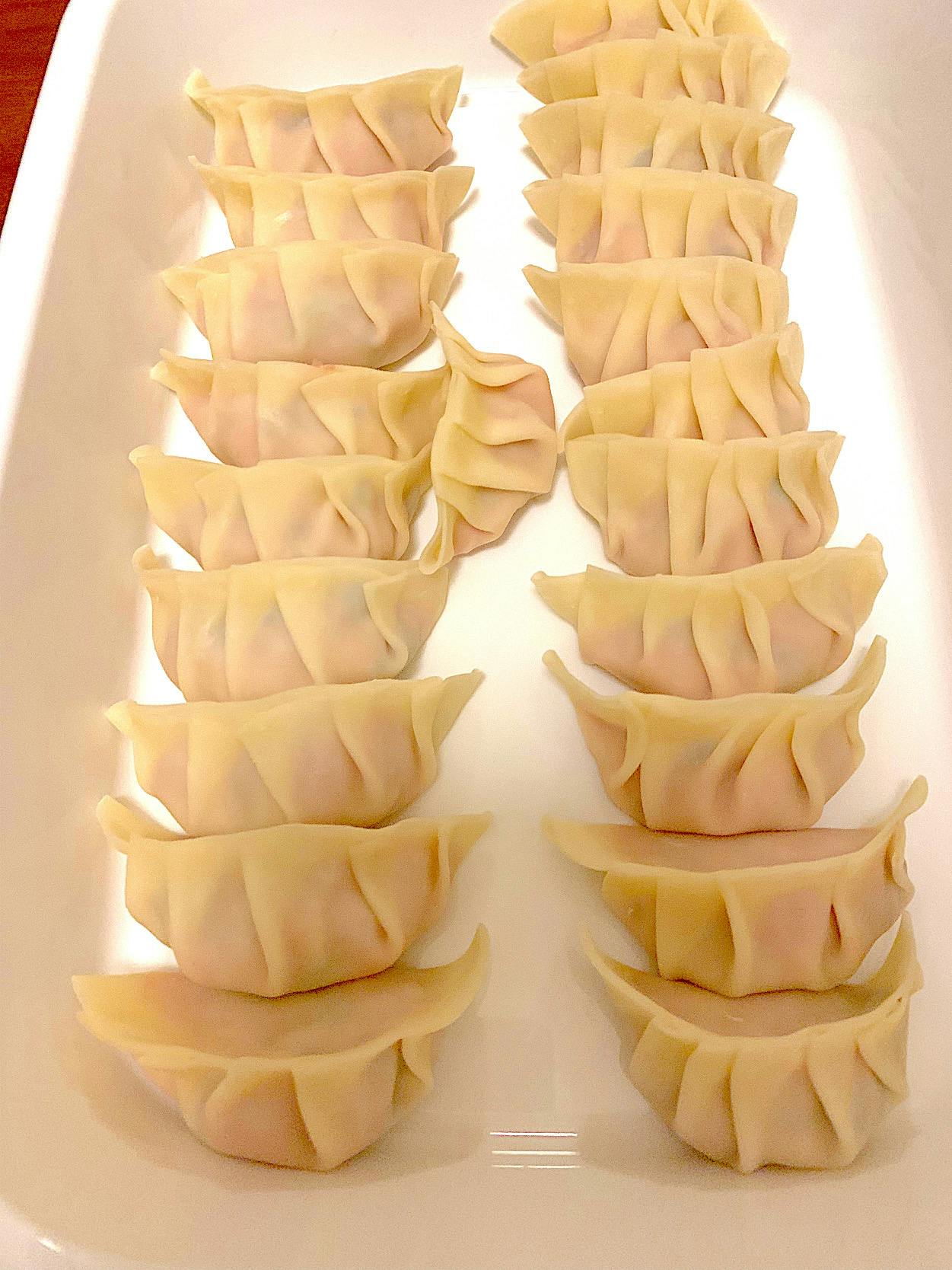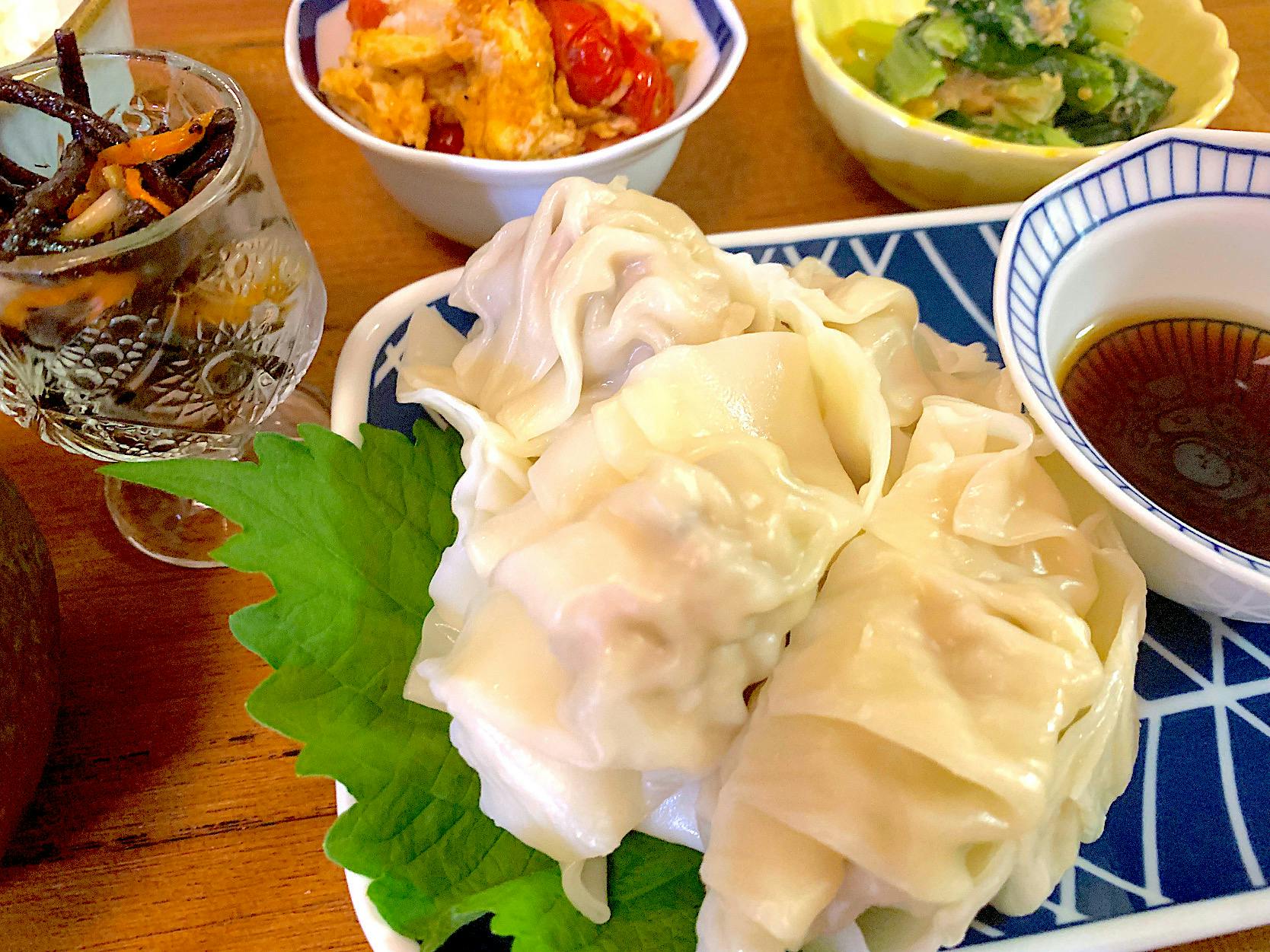 豚ひき肉、生姜、ネギ、椎茸、しめじを包んだ水餃子を、酢醤油+柚子胡椒で😋✨何個でも食べられる美味しさです💕副菜は作り置きのひじき煮と小松菜の胡麻味噌和えと卵とトマトの炒め物🍅ごちそうさまでした🙏