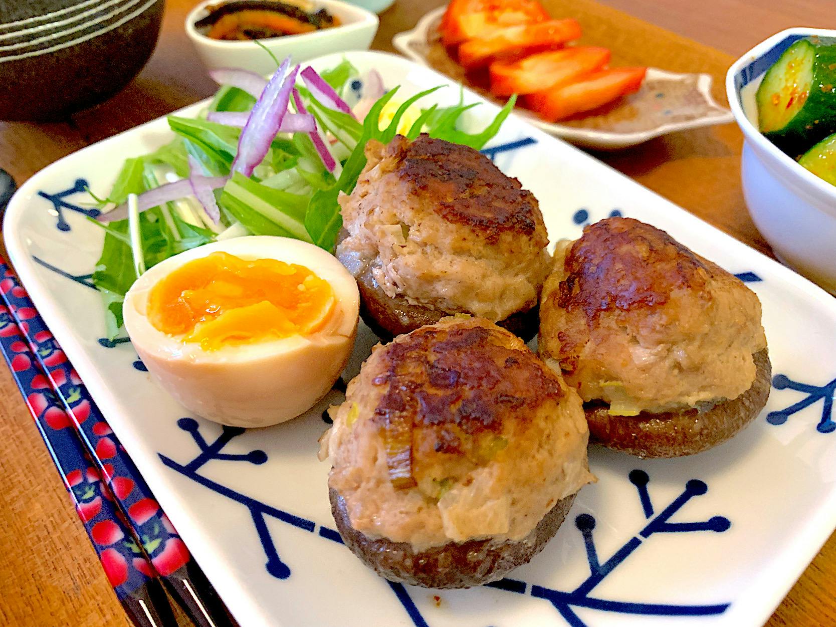 豚ひき肉にネギと椎茸の軸のみじん切り、すりおろしにんにく、塩、マヨネーズ、酒、醤油、オイスターソースを入れてよく混ぜ混ぜ✨椎茸に片栗粉をまぶして、肉だねを山盛りに詰めてフライパンで蒸し焼きにしました😋 副菜は、毎週作り置きしている煮卵と、ひじきの煮物。それから賞味期限間近の竹輪を救済すべく、たたききゅうりの韓国風🥒 フルーツトマトが安くなってたので今日のトマトはそちら🍅 美味し過ぎてしあわせです💕ごちそうさまでした🙏