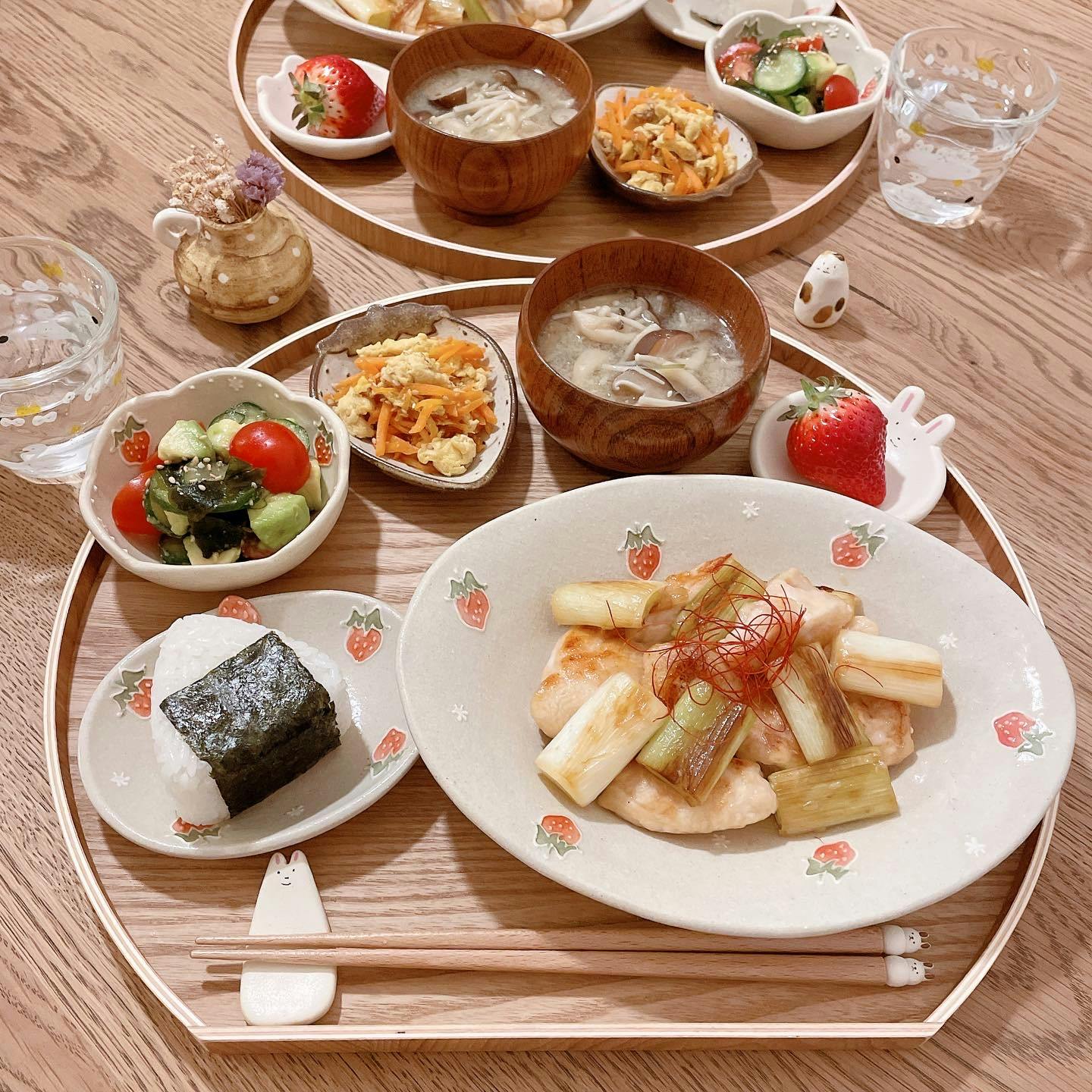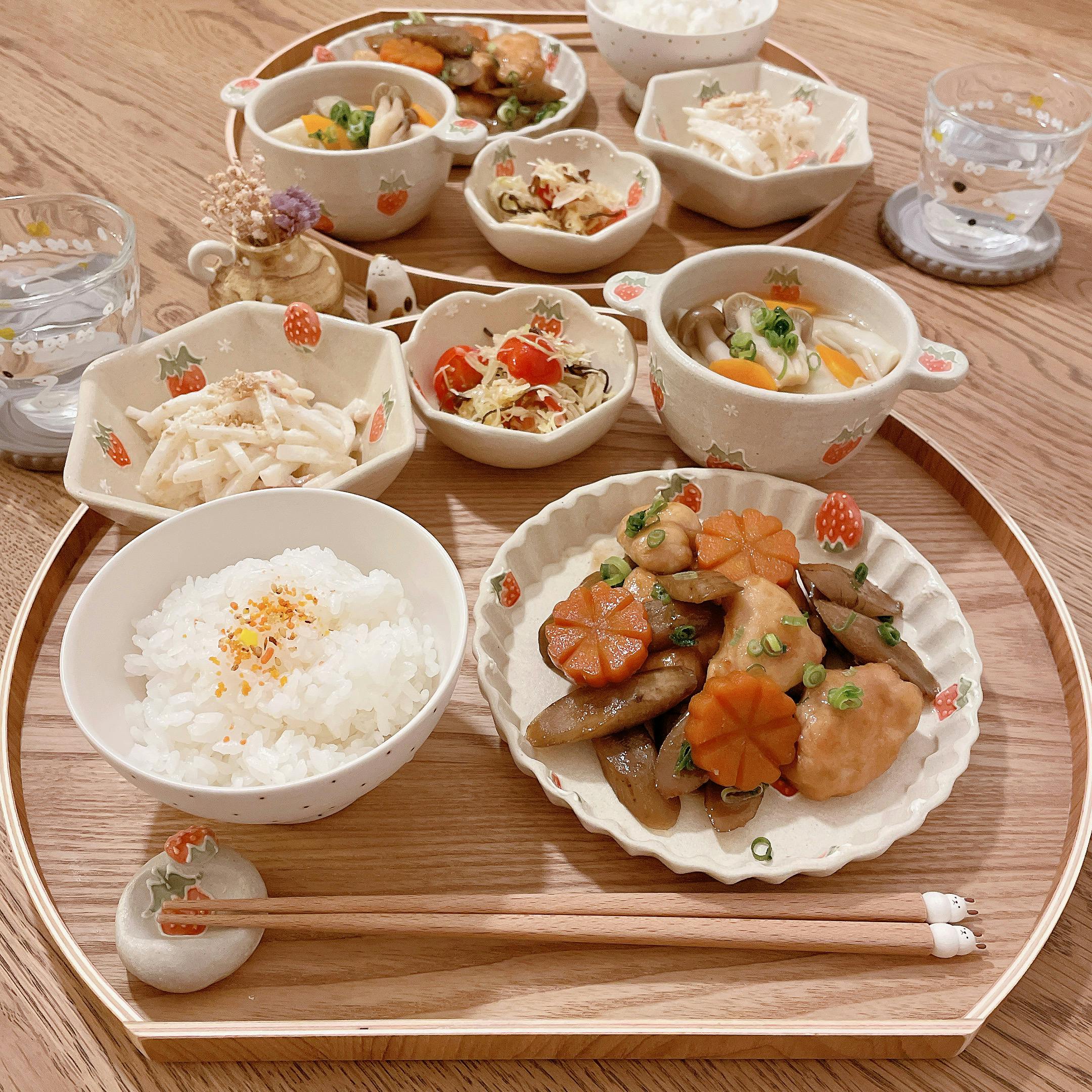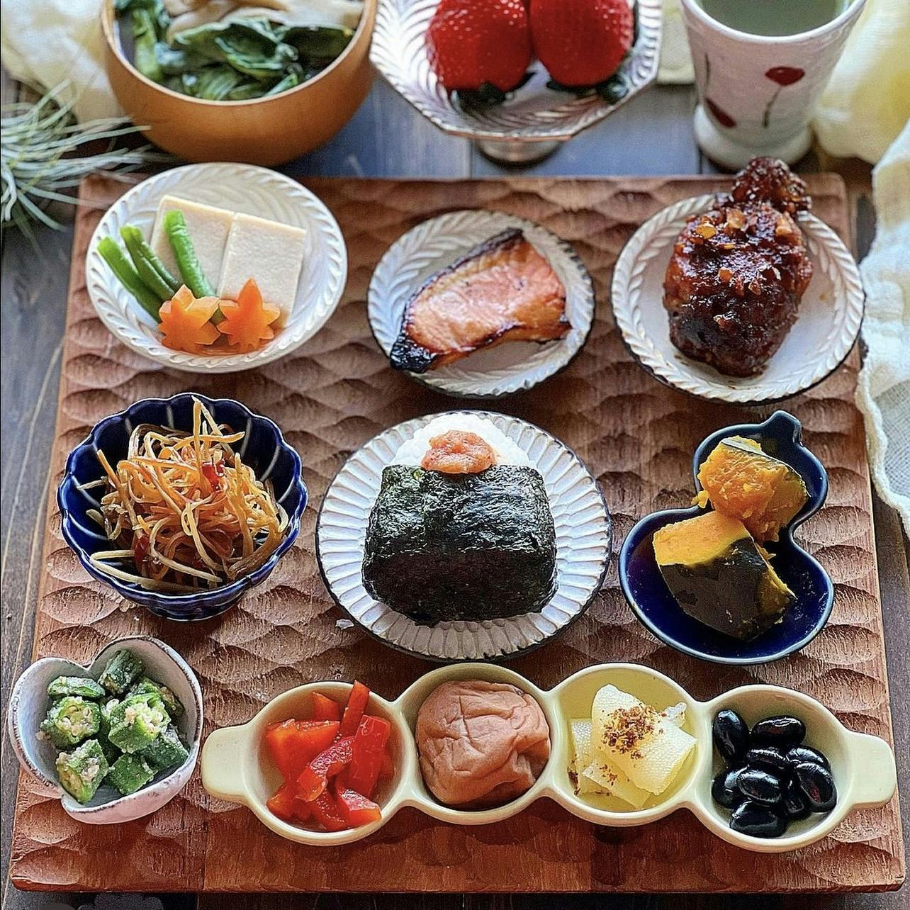 #豆皿ちょこちょこごはん 豆皿を並べて作り置きしていたおかずを少しずつ盛り付けてみました。 いろいろなものを少しずつってなんだか嬉しいですよね🤗 ❁ 明太子おにぎり🍙 ❁ ヤンニョムチキン ❁ 鮭の塩麹焼き ❁ 高野豆腐の含め煮 ❁ きんぴらごぼう ❁ かぼちゃの煮物 ❁ オクラの明太子和え ❁ 4連豆皿 (パプリカのマリネ、梅干し、数の子、黒豆) ❁ 小松菜と舞茸の味噌汁 ❁ いちご