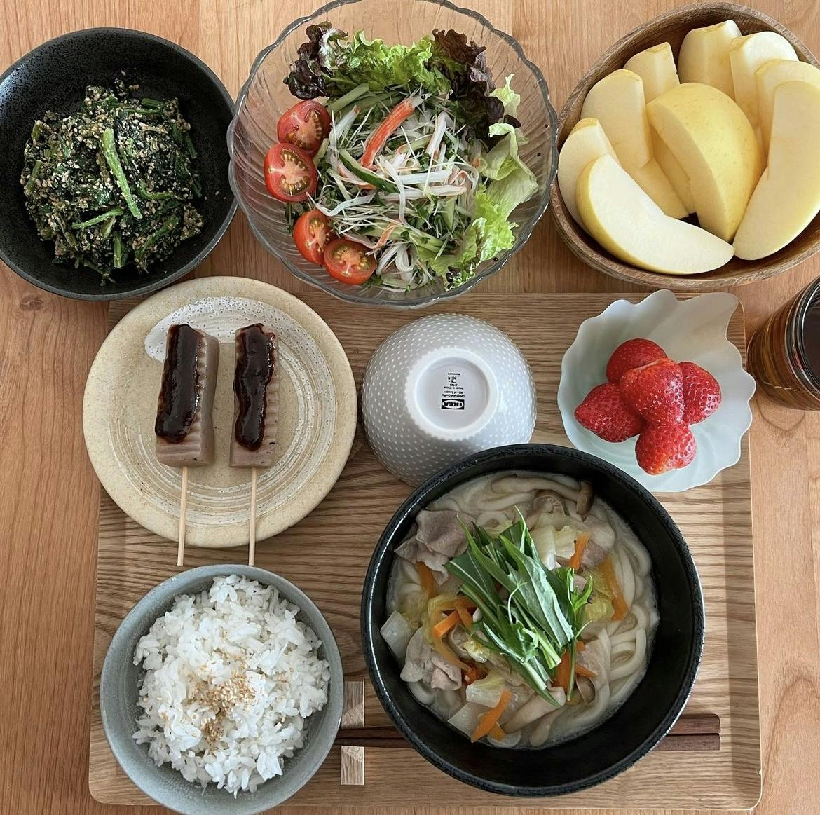 🐟🍚🍜 𖧵ちりめんじゃこごはん 𖧵具沢山豆乳うどん 𖧵こんにゃく田楽 𖧵スプラウトとカニカマのサラダ 𖧵ほうれん草のごま和え 𖧵りんご 𖧵いちご 前日の豆乳鍋の素の残りで具沢山おうどんに💫 私は体調悪くてほぼ食べれなく、 仕事で疲れて朝帰宅した👨🏻さんのご飯を 撮らせてもらったので、 朝の光でいつもと違って写真が明るめ🌞✨ :