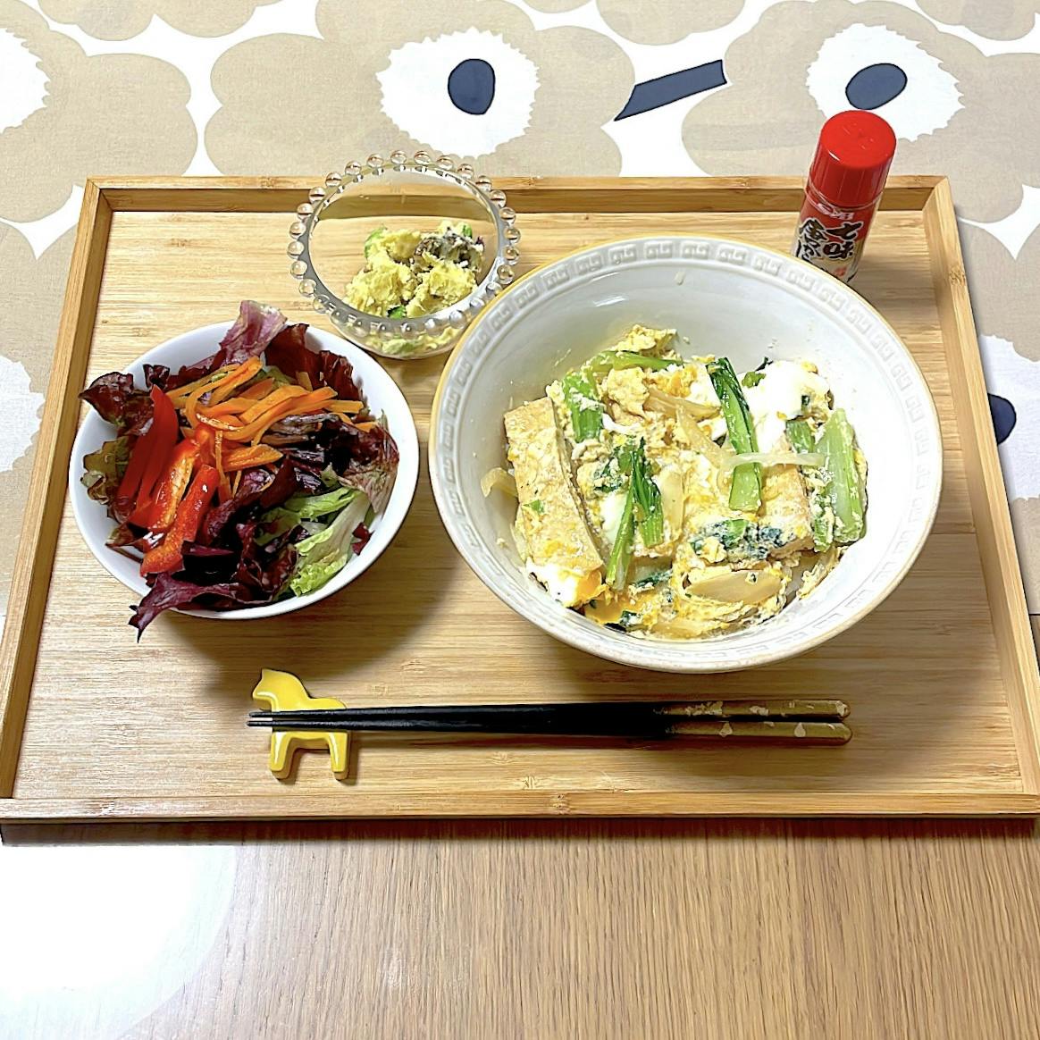夜勤明けなので、極めて簡単なお夕飯です。 厚揚げの卵とじはクラシルさんの麺つゆ親子丼レシピを参考に味付けしました。 お肉でなく厚揚げを用いたので気持ち胃腸を労われるかな?!夜勤明けの疲れた身体に染み渡ります様に。 鉄分チャージのために小松菜をたっぷり使いました。 カプサイシンが摂れる七味唐辛子もちょい足しして、冷え性対策・血行促進により青クマ予防を図りました。 さつまいもサラダは我が家の定番、枝豆&ヨーグルトで和えました。 冷めた澱粉質=食物繊維様成分と、タンパク質・葉酸が取れる枝豆、腸活食材ヨーグルトと何気に色々摂れるのでお気に入り😊 ☺︎Forest
