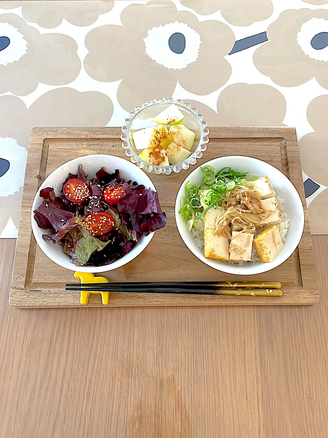 趣味の資格試験のため、 脳みそに栄養を送るべく 朝からしっかり頂きます。 タンパク質やイソフラボンが豊富な厚揚げで、肌を作るモトや女性ホルモンの原料となる栄養を摂って美肌作り効果を期待します。 脳の栄養源はブドウ糖のみ!なので、お米でしっかり炭水化物もチャージします。 王林は赤りんごよりもポリフェノールが豊富で、抗酸化作用などにより美白効果も期待したいです。 りんごは血糖値コントロールや腸活にも効果があると言われているので、旬の今に是非重宝したい果物です。 ☺︎Forest