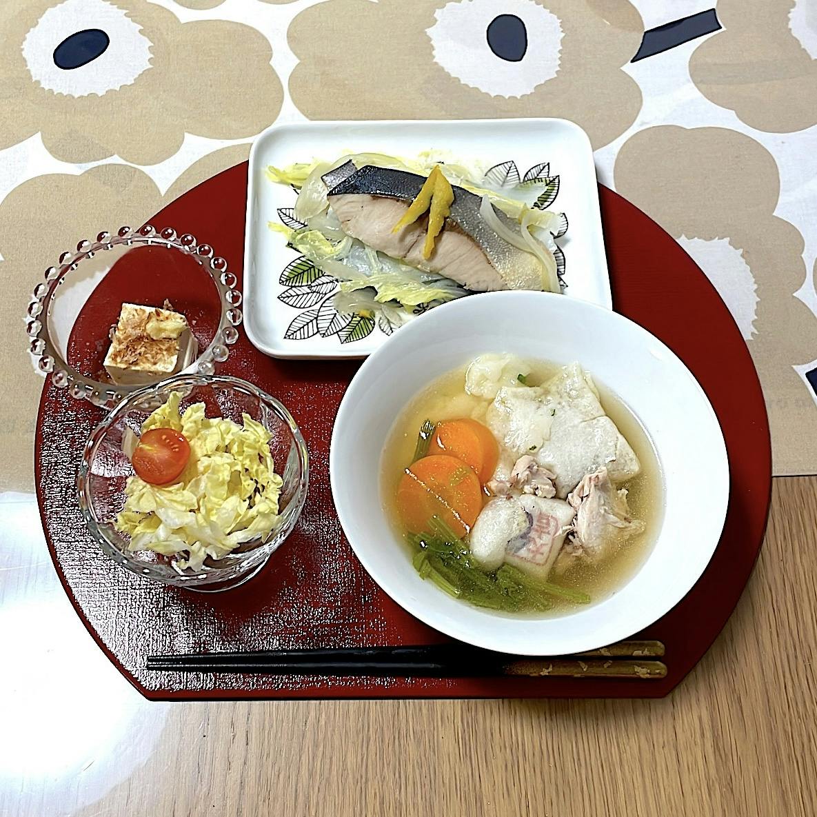 冬至☆柚子 ひと足早いお正月風の夜ごはんです。 冬至の今日、柚子湯のために購入した柚子の皮を活用した鰤の蒸し焼きと、お雑煮スープです。 蒸し籠付きお鍋で、鰤とお雑煮は同時進行で時短調理できました。 今が旬の白菜で簡単サラダ、タンパク質補給に節約食材のひとつ木綿豆腐に登場して頂きました。 お雑煮は鶏手羽元肉でお出汁を取りつつタンパク質補給、ほうれん草で鉄分補給を図りました。