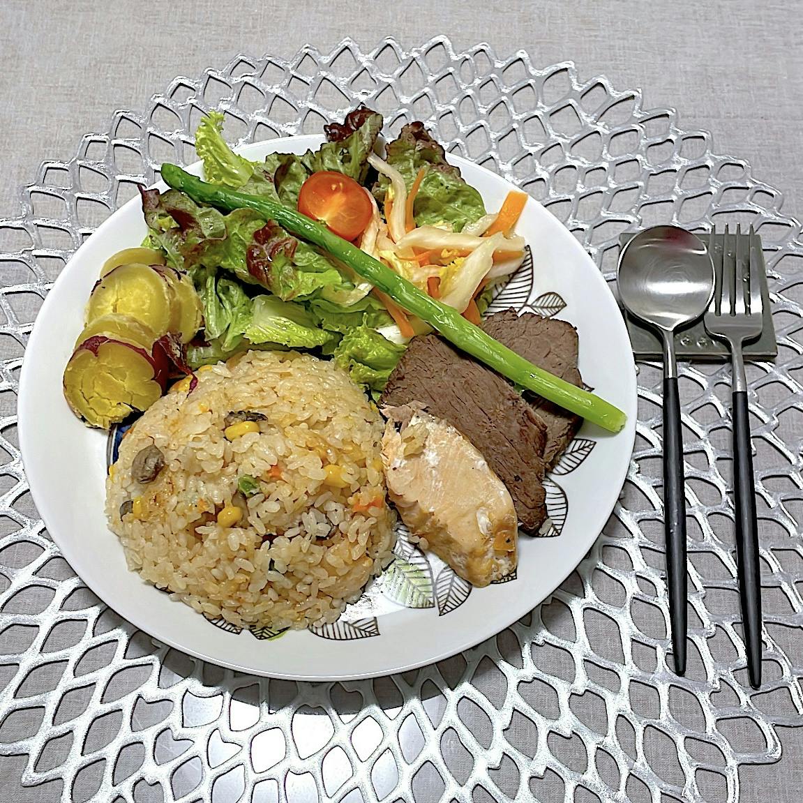 クリスマス余韻ごはんです🎄⏩️ 副菜の薄切りステーキは、親族のクリスマス会でお土産に頂いたローストビーフを、頂いた当日に火を通して翌日も安心して食べられるようにしました。 メインのピラフは、冷凍庫にアルモンデ! 冷凍エビとミックスベジタブル、pal systemさんで購入していた冷凍鮭をお米と一緒に炊飯器に投入!で楽ちん準備でした。 味噌とコンソメ、バターでしっかりめの味付けでした。 炊飯器で鮭を一緒に炊いたことで、メインと副菜を同時に準備できたのもお助かりでした。 サラダも同じくアルモンデ! にんじんや白菜は千切りにして塩麹につけておけば柔らかくなるので生でも食べやすく、準備も簡単でありがたいです。 さつまいもは炊飯器調理→冷凍ストックしているので、使いたい時に使いたい分を解凍して使えるのが便利で重宝しています。