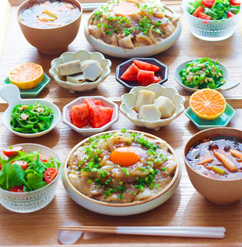 ꕤ 塩ダレ豚丼 ☜ レシピあり ꕤ ピーマンのツナ和え ꕤ トマトのうま塩和え ꕤ 里芋の煮物 ꕤ 野菜サラダ ꕤ きのこと豆腐とチンゲン菜のチゲ風スープ ꕤ フルーツ たっぷりのタレがお肉に絡んで…… 最高🥳💕 豚丼は塩だれ派です✋❤️
