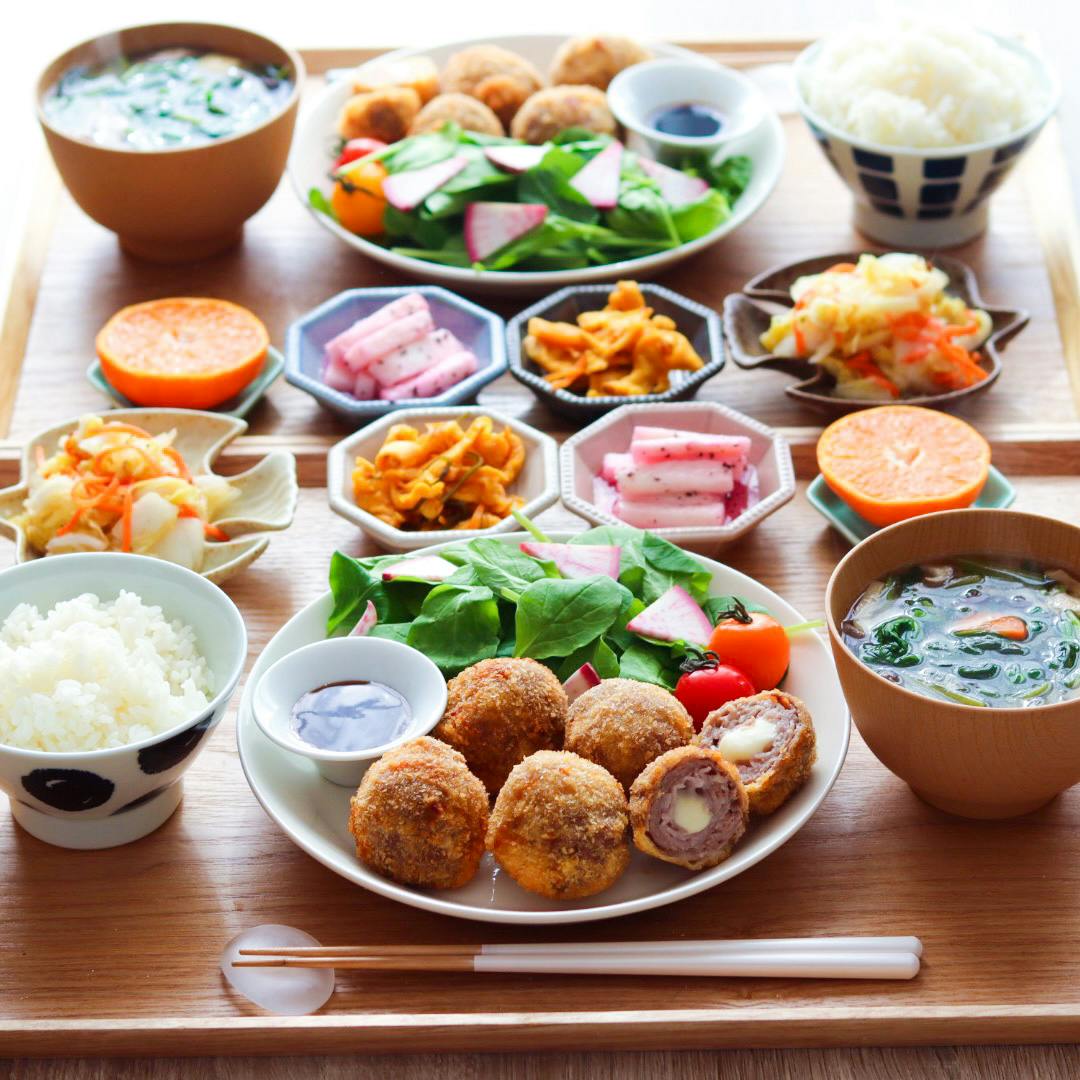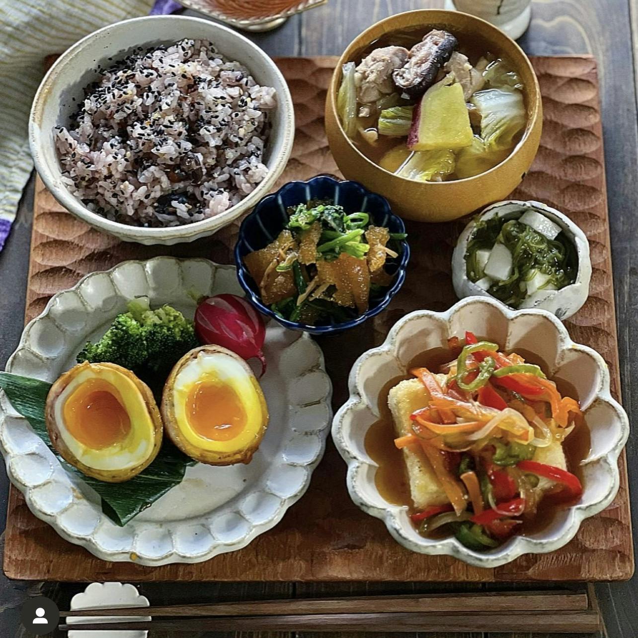 # 和食ごはん ❁ 肉巻き半熟卵 ❁ 揚げ出し豆腐の野菜あんかけ ❁ 松前漬けのほうれん草和え ❁ 長芋とめかぶの山葵しょうゆ ❁ 十六雑穀ごはん ❁ 鶏と色々野菜の味噌汁 半熟卵は豚バラ肉を巻いて甘辛で炒めてます。 中は黄味がとろ〜りで美味しい♡ 揚げ出し豆腐も野菜のあんかけをのせると美味しさも さらにアップ。 お野菜もとれてボリュミーな一品になります。
